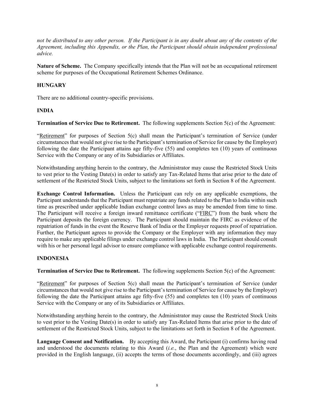 8 not be distributed to any other person. If the Participant is in any doubt about any of the contents of the Agreement, including this Appendix, or the Plan, the Participant should obtain independent professional advice. Nature of Scheme. The Company specifically intends that the Plan will not be an occupational retirement scheme for purposes of the Occupational Retirement Schemes Ordinance. HUNGARY There are no additional country-specific provisions. INDIA Termination of Service Due to Retirement. The following supplements Section 5(c) of the Agreement: “Retirement” for purposes of Section 5(c) shall mean the Participant’s termination of Service (under circumstances that would not give rise to the Participant’s termination of Service for cause by the Employer) following the date the Participant attains age fifty-five (55) and completes ten (10) years of continuous Service with the Company or any of its Subsidiaries or Affiliates. Notwithstanding anything herein to the contrary, the Administrator may cause the Restricted Stock Units to vest prior to the Vesting Date(s) in order to satisfy any Tax-Related Items that arise prior to the date of settlement of the Restricted Stock Units, subject to the limitations set forth in Section 8 of the Agreement. Exchange Control Information. Unless the Participant can rely on any applicable exemptions, the Participant understands that the Participant must repatriate any funds related to the Plan to India within such time as prescribed under applicable Indian exchange control laws as may be amended from time to time. The Participant will receive a foreign inward remittance certificate (“FIRC”) from the bank where the Participant deposits the foreign currency. The Participant should maintain the FIRC as evidence of the repatriation of funds in the event the Reserve Bank of India or the Employer requests proof of repatriation. Further, the Participant agrees to provide the Company or the Employer with any information they may require to make any applicable filings under exchange control laws in India. The Participant should consult with his or her personal legal advisor to ensure compliance with applicable exchange control requirements. INDONESIA Termination of Service Due to Retirement. The following supplements Section 5(c) of the Agreement: “Retirement” for purposes of Section 5(c) shall mean the Participant’s termination of Service (under circumstances that would not give rise to the Participant’s termination of Service for cause by the Employer) following the date the Participant attains age fifty-five (55) and completes ten (10) years of continuous Service with the Company or any of its Subsidiaries or Affiliates. Notwithstanding anything herein to the contrary, the Administrator may cause the Restricted Stock Units to vest prior to the Vesting Date(s) in order to satisfy any Tax-Related Items that arise prior to the date of settlement of the Restricted Stock Units, subject to the limitations set forth in Section 8 of the Agreement. Language Consent and Notification. By accepting this Award, the Participant (i) confirms having read and understood the documents relating to this Award (i.e., the Plan and the Agreement) which were provided in the English language, (ii) accepts the terms of those documents accordingly, and (iii) agrees
