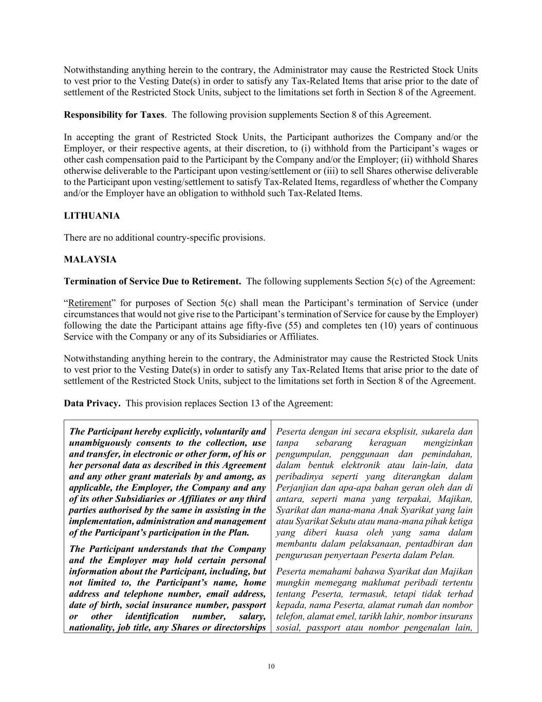 10 Notwithstanding anything herein to the contrary, the Administrator may cause the Restricted Stock Units to vest prior to the Vesting Date(s) in order to satisfy any Tax-Related Items that arise prior to the date of settlement of the Restricted Stock Units, subject to the limitations set forth in Section 8 of the Agreement. Responsibility for Taxes. The following provision supplements Section 8 of this Agreement. In accepting the grant of Restricted Stock Units, the Participant authorizes the Company and/or the Employer, or their respective agents, at their discretion, to (i) withhold from the Participant’s wages or other cash compensation paid to the Participant by the Company and/or the Employer; (ii) withhold Shares otherwise deliverable to the Participant upon vesting/settlement or (iii) to sell Shares otherwise deliverable to the Participant upon vesting/settlement to satisfy Tax-Related Items, regardless of whether the Company and/or the Employer have an obligation to withhold such Tax-Related Items. LITHUANIA There are no additional country-specific provisions. MALAYSIA Termination of Service Due to Retirement. The following supplements Section 5(c) of the Agreement: “Retirement” for purposes of Section 5(c) shall mean the Participant’s termination of Service (under circumstances that would not give rise to the Participant’s termination of Service for cause by the Employer) following the date the Participant attains age fifty-five (55) and completes ten (10) years of continuous Service with the Company or any of its Subsidiaries or Affiliates. Notwithstanding anything herein to the contrary, the Administrator may cause the Restricted Stock Units to vest prior to the Vesting Date(s) in order to satisfy any Tax-Related Items that arise prior to the date of settlement of the Restricted Stock Units, subject to the limitations set forth in Section 8 of the Agreement. Data Privacy. This provision replaces Section 13 of the Agreement: The Participant hereby explicitly, voluntarily and unambiguously consents to the collection, use and transfer, in electronic or other form, of his or her personal data as described in this Agreement and any other grant materials by and among, as applicable, the Employer, the Company and any of its other Subsidiaries or Affiliates or any third parties authorised by the same in assisting in the implementation, administration and management of the Participant’s participation in the Plan. The Participant understands that the Company and the Employer may hold certain personal information about the Participant, including, but not limited to, the Participant’s name, home address and telephone number, email address, date of birth, social insurance number, passport or other identification number, salary, nationality, job title, any Shares or directorships Peserta dengan ini secara eksplisit, sukarela dan tanpa sebarang keraguan mengizinkan pengumpulan, penggunaan dan pemindahan, dalam bentuk elektronik atau lain-lain, data peribadinya seperti yang diterangkan dalam Perjanjian dan apa-apa bahan geran oleh dan di antara, seperti mana yang terpakai, Majikan, Syarikat dan mana-mana Anak Syarikat yang lain atau Syarikat Sekutu atau mana-mana pihak ketiga yang diberi kuasa oleh yang sama dalam membantu dalam pelaksanaan, pentadbiran dan pengurusan penyertaan Peserta dalam Pelan. Peserta memahami bahawa Syarikat dan Majikan mungkin memegang maklumat peribadi tertentu tentang Peserta, termasuk, tetapi tidak terhad kepada, nama Peserta, alamat rumah dan nombor telefon, alamat emel, tarikh lahir, nombor insurans sosial, passport atau nombor pengenalan lain,