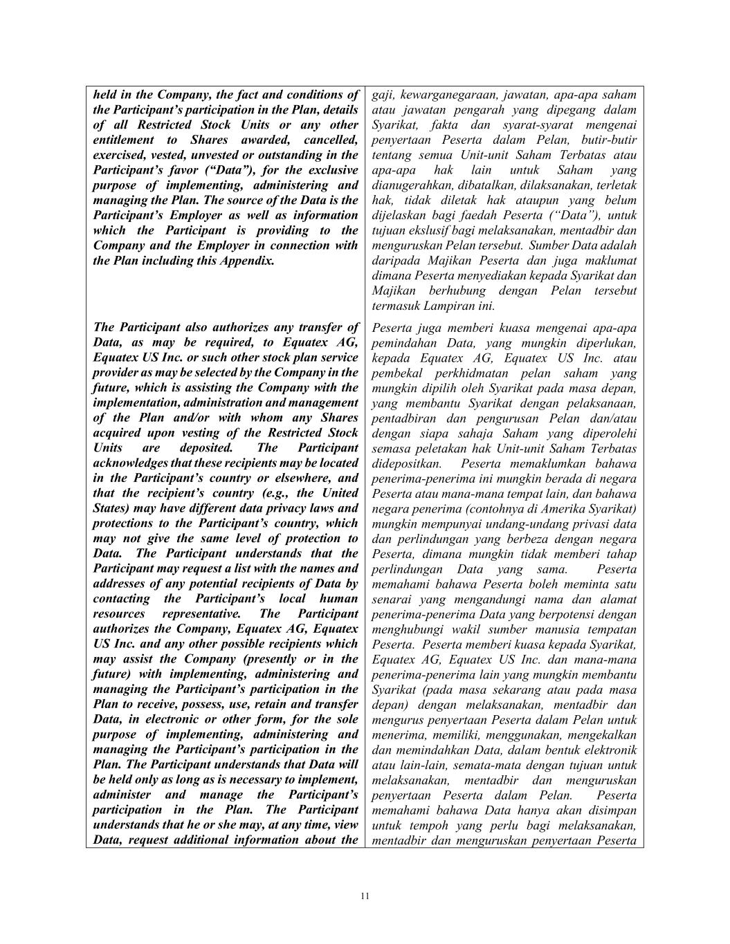 11 held in the Company, the fact and conditions of the Participant’s participation in the Plan, details of all Restricted Stock Units or any other entitlement to Shares awarded, cancelled, exercised, vested, unvested or outstanding in the Participant’s favor (“Data”), for the exclusive purpose of implementing, administering and managing the Plan. The source of the Data is the Participant’s Employer as well as information which the Participant is providing to the Company and the Employer in connection with the Plan including this Appendix. The Participant also authorizes any transfer of Data, as may be required, to Equatex AG, Equatex US Inc. or such other stock plan service provider as may be selected by the Company in the future, which is assisting the Company with the implementation, administration and management of the Plan and/or with whom any Shares acquired upon vesting of the Restricted Stock Units are deposited. The Participant acknowledges that these recipients may be located in the Participant’s country or elsewhere, and that the recipient’s country (e.g., the United States) may have different data privacy laws and protections to the Participant’s country, which may not give the same level of protection to Data. The Participant understands that the Participant may request a list with the names and addresses of any potential recipients of Data by contacting the Participant’s local human resources representative. The Participant authorizes the Company, Equatex AG, Equatex US Inc. and any other possible recipients which may assist the Company (presently or in the future) with implementing, administering and managing the Participant’s participation in the Plan to receive, possess, use, retain and transfer Data, in electronic or other form, for the sole purpose of implementing, administering and managing the Participant’s participation in the Plan. The Participant understands that Data will be held only as long as is necessary to implement, administer and manage the Participant’s participation in the Plan. The Participant understands that he or she may, at any time, view Data, request additional information about the gaji, kewarganegaraan, jawatan, apa-apa saham atau jawatan pengarah yang dipegang dalam Syarikat, fakta dan syarat-syarat mengenai penyertaan Peserta dalam Pelan, butir-butir tentang semua Unit-unit Saham Terbatas atau apa-apa hak lain untuk Saham yang dianugerahkan, dibatalkan, dilaksanakan, terletak hak, tidak diletak hak ataupun yang belum dijelaskan bagi faedah Peserta (“Data”), untuk tujuan ekslusif bagi melaksanakan, mentadbir dan menguruskan Pelan tersebut. Sumber Data adalah daripada Majikan Peserta dan juga maklumat dimana Peserta menyediakan kepada Syarikat dan Majikan berhubung dengan Pelan tersebut termasuk Lampiran ini. Peserta juga memberi kuasa mengenai apa-apa pemindahan Data, yang mungkin diperlukan, kepada Equatex AG, Equatex US Inc. atau pembekal perkhidmatan pelan saham yang mungkin dipilih oleh Syarikat pada masa depan, yang membantu Syarikat dengan pelaksanaan, pentadbiran dan pengurusan Pelan dan/atau dengan siapa sahaja Saham yang diperolehi semasa peletakan hak Unit-unit Saham Terbatas didepositkan. Peserta memaklumkan bahawa penerima-penerima ini mungkin berada di negara Peserta atau mana-mana tempat lain, dan bahawa negara penerima (contohnya di Amerika Syarikat) mungkin mempunyai undang-undang privasi data dan perlindungan yang berbeza dengan negara Peserta, dimana mungkin tidak memberi tahap perlindungan Data yang sama. Peserta memahami bahawa Peserta boleh meminta satu senarai yang mengandungi nama dan alamat penerima-penerima Data yang berpotensi dengan menghubungi wakil sumber manusia tempatan Peserta. Peserta memberi kuasa kepada Syarikat, Equatex AG, Equatex US Inc. dan mana-mana penerima-penerima lain yang mungkin membantu Syarikat (pada masa sekarang atau pada masa depan) dengan melaksanakan, mentadbir dan mengurus penyertaan Peserta dalam Pelan untuk menerima, memiliki, menggunakan, mengekalkan dan memindahkan Data, dalam bentuk elektronik atau lain-lain, semata-mata dengan tujuan untuk melaksanakan, mentadbir dan menguruskan penyertaan Peserta dalam Pelan. Peserta memahami bahawa Data hanya akan disimpan untuk tempoh yang perlu bagi melaksanakan, mentadbir dan menguruskan penyertaan Peserta
