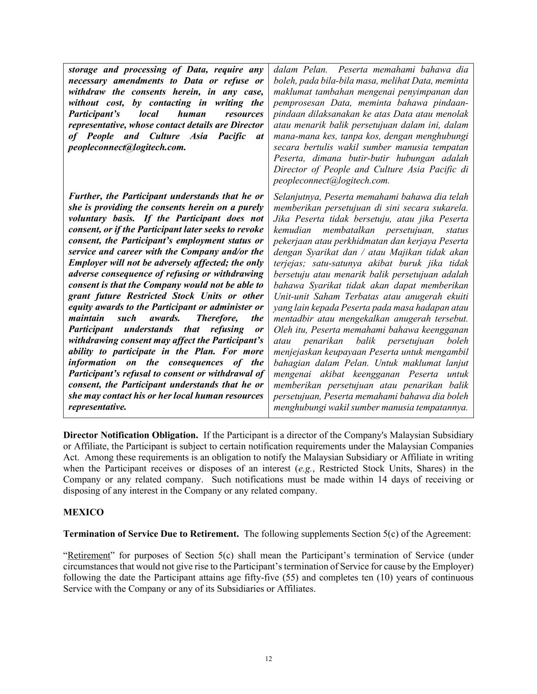 12 storage and processing of Data, require any necessary amendments to Data or refuse or withdraw the consents herein, in any case, without cost, by contacting in writing the Participant’s local human resources representative, whose contact details are Director of People and Culture Asia Pacific at peopleconnect@logitech.com. Further, the Participant understands that he or she is providing the consents herein on a purely voluntary basis. If the Participant does not consent, or if the Participant later seeks to revoke consent, the Participant’s employment status or service and career with the Company and/or the Employer will not be adversely affected; the only adverse consequence of refusing or withdrawing consent is that the Company would not be able to grant future Restricted Stock Units or other equity awards to the Participant or administer or maintain such awards. Therefore, the Participant understands that refusing or withdrawing consent may affect the Participant’s ability to participate in the Plan. For more information on the consequences of the Participant’s refusal to consent or withdrawal of consent, the Participant understands that he or she may contact his or her local human resources representative. dalam Pelan. Peserta memahami bahawa dia boleh, pada bila-bila masa, melihat Data, meminta maklumat tambahan mengenai penyimpanan dan pemprosesan Data, meminta bahawa pindaan- pindaan dilaksanakan ke atas Data atau menolak atau menarik balik persetujuan dalam ini, dalam mana-mana kes, tanpa kos, dengan menghubungi secara bertulis wakil sumber manusia tempatan Peserta, dimana butir-butir hubungan adalah Director of People and Culture Asia Pacific di peopleconnect@logitech.com. Selanjutnya, Peserta memahami bahawa dia telah memberikan persetujuan di sini secara sukarela. Jika Peserta tidak bersetuju, atau jika Peserta kemudian membatalkan persetujuan, status pekerjaan atau perkhidmatan dan kerjaya Peserta dengan Syarikat dan / atau Majikan tidak akan terjejas; satu-satunya akibat buruk jika tidak bersetuju atau menarik balik persetujuan adalah bahawa Syarikat tidak akan dapat memberikan Unit-unit Saham Terbatas atau anugerah ekuiti yang lain kepada Peserta pada masa hadapan atau mentadbir atau mengekalkan anugerah tersebut. Oleh itu, Peserta memahami bahawa keengganan atau penarikan balik persetujuan boleh menjejaskan keupayaan Peserta untuk mengambil bahagian dalam Pelan. Untuk maklumat lanjut mengenai akibat keengganan Peserta untuk memberikan persetujuan atau penarikan balik persetujuan, Peserta memahami bahawa dia boleh menghubungi wakil sumber manusia tempatannya. Director Notification Obligation. If the Participant is a director of the Company's Malaysian Subsidiary or Affiliate, the Participant is subject to certain notification requirements under the Malaysian Companies Act. Among these requirements is an obligation to notify the Malaysian Subsidiary or Affiliate in writing when the Participant receives or disposes of an interest (e.g., Restricted Stock Units, Shares) in the Company or any related company. Such notifications must be made within 14 days of receiving or disposing of any interest in the Company or any related company. MEXICO Termination of Service Due to Retirement. The following supplements Section 5(c) of the Agreement: “Retirement” for purposes of Section 5(c) shall mean the Participant’s termination of Service (under circumstances that would not give rise to the Participant’s termination of Service for cause by the Employer) following the date the Participant attains age fifty-five (55) and completes ten (10) years of continuous Service with the Company or any of its Subsidiaries or Affiliates.