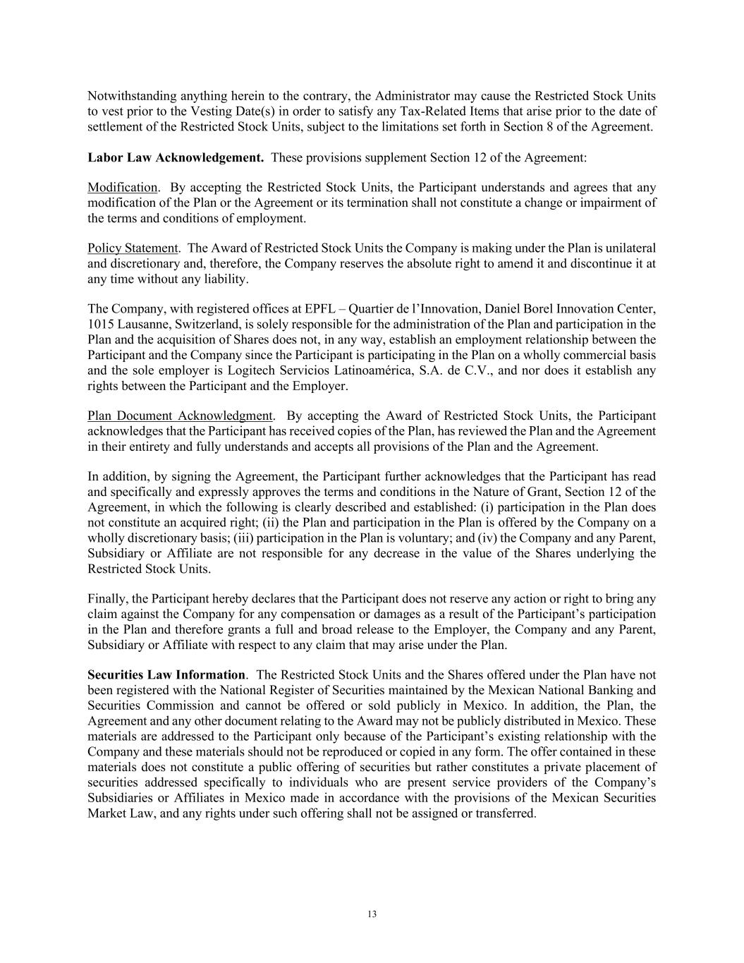 13 Notwithstanding anything herein to the contrary, the Administrator may cause the Restricted Stock Units to vest prior to the Vesting Date(s) in order to satisfy any Tax-Related Items that arise prior to the date of settlement of the Restricted Stock Units, subject to the limitations set forth in Section 8 of the Agreement. Labor Law Acknowledgement. These provisions supplement Section 12 of the Agreement: Modification. By accepting the Restricted Stock Units, the Participant understands and agrees that any modification of the Plan or the Agreement or its termination shall not constitute a change or impairment of the terms and conditions of employment. Policy Statement. The Award of Restricted Stock Units the Company is making under the Plan is unilateral and discretionary and, therefore, the Company reserves the absolute right to amend it and discontinue it at any time without any liability. The Company, with registered offices at EPFL – Quartier de l’Innovation, Daniel Borel Innovation Center, 1015 Lausanne, Switzerland, is solely responsible for the administration of the Plan and participation in the Plan and the acquisition of Shares does not, in any way, establish an employment relationship between the Participant and the Company since the Participant is participating in the Plan on a wholly commercial basis and the sole employer is Logitech Servicios Latinoamérica, S.A. de C.V., and nor does it establish any rights between the Participant and the Employer. Plan Document Acknowledgment. By accepting the Award of Restricted Stock Units, the Participant acknowledges that the Participant has received copies of the Plan, has reviewed the Plan and the Agreement in their entirety and fully understands and accepts all provisions of the Plan and the Agreement. In addition, by signing the Agreement, the Participant further acknowledges that the Participant has read and specifically and expressly approves the terms and conditions in the Nature of Grant, Section 12 of the Agreement, in which the following is clearly described and established: (i) participation in the Plan does not constitute an acquired right; (ii) the Plan and participation in the Plan is offered by the Company on a wholly discretionary basis; (iii) participation in the Plan is voluntary; and (iv) the Company and any Parent, Subsidiary or Affiliate are not responsible for any decrease in the value of the Shares underlying the Restricted Stock Units. Finally, the Participant hereby declares that the Participant does not reserve any action or right to bring any claim against the Company for any compensation or damages as a result of the Participant’s participation in the Plan and therefore grants a full and broad release to the Employer, the Company and any Parent, Subsidiary or Affiliate with respect to any claim that may arise under the Plan. Securities Law Information. The Restricted Stock Units and the Shares offered under the Plan have not been registered with the National Register of Securities maintained by the Mexican National Banking and Securities Commission and cannot be offered or sold publicly in Mexico. In addition, the Plan, the Agreement and any other document relating to the Award may not be publicly distributed in Mexico. These materials are addressed to the Participant only because of the Participant’s existing relationship with the Company and these materials should not be reproduced or copied in any form. The offer contained in these materials does not constitute a public offering of securities but rather constitutes a private placement of securities addressed specifically to individuals who are present service providers of the Company’s Subsidiaries or Affiliates in Mexico made in accordance with the provisions of the Mexican Securities Market Law, and any rights under such offering shall not be assigned or transferred.