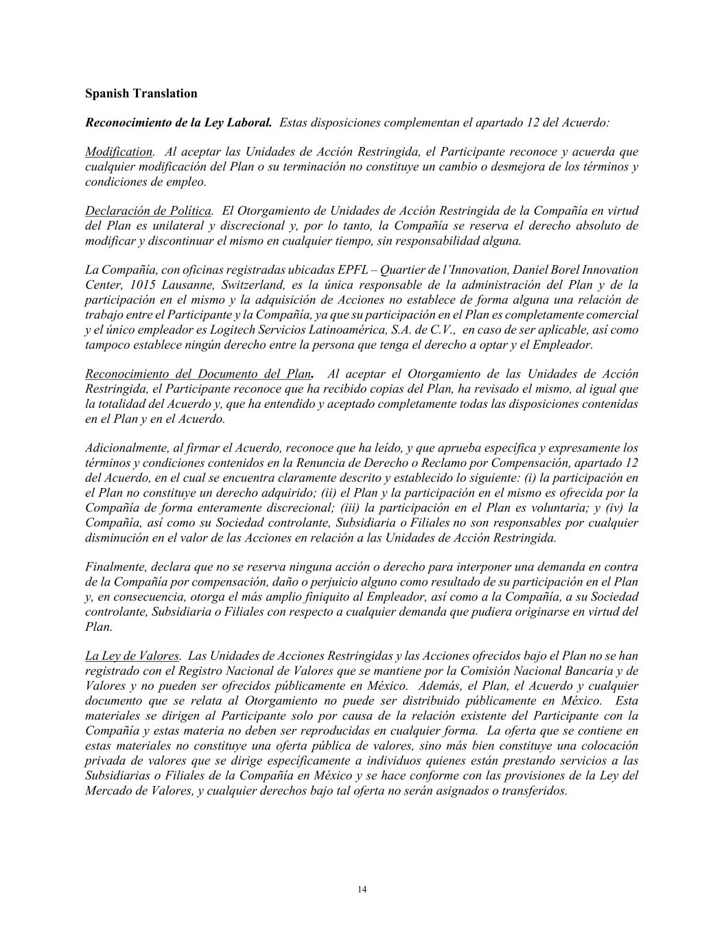 14 Spanish Translation Reconocimiento de la Ley Laboral. Estas disposiciones complementan el apartado 12 del Acuerdo: Modification. Al aceptar las Unidades de Acción Restringida, el Participante reconoce y acuerda que cualquier modificación del Plan o su terminación no constituye un cambio o desmejora de los términos y condiciones de empleo. Declaración de Política. El Otorgamiento de Unidades de Acción Restringida de la Compañía en virtud del Plan es unilateral y discrecional y, por lo tanto, la Compañía se reserva el derecho absoluto de modificar y discontinuar el mismo en cualquier tiempo, sin responsabilidad alguna. La Compañía, con oficinas registradas ubicadas EPFL – Quartier de l’Innovation, Daniel Borel Innovation Center, 1015 Lausanne, Switzerland, es la única responsable de la administración del Plan y de la participación en el mismo y la adquisición de Acciones no establece de forma alguna una relación de trabajo entre el Participante y la Compañía, ya que su participación en el Plan es completamente comercial y el único empleador es Logitech Servicios Latinoamérica, S.A. de C.V., en caso de ser aplicable, así como tampoco establece ningún derecho entre la persona que tenga el derecho a optar y el Empleador. Reconocimiento del Documento del Plan. Al aceptar el Otorgamiento de las Unidades de Acción Restringida, el Participante reconoce que ha recibido copias del Plan, ha revisado el mismo, al igual que la totalidad del Acuerdo y, que ha entendido y aceptado completamente todas las disposiciones contenidas en el Plan y en el Acuerdo. Adicionalmente, al firmar el Acuerdo, reconoce que ha leído, y que aprueba específica y expresamente los términos y condiciones contenidos en la Renuncia de Derecho o Reclamo por Compensación, apartado 12 del Acuerdo, en el cual se encuentra claramente descrito y establecido lo siguiente: (i) la participación en el Plan no constituye un derecho adquirido; (ii) el Plan y la participación en el mismo es ofrecida por la Compañía de forma enteramente discrecional; (iii) la participación en el Plan es voluntaria; y (iv) la Compañía, así como su Sociedad controlante, Subsidiaria o Filiales no son responsables por cualquier disminución en el valor de las Acciones en relación a las Unidades de Acción Restringida. Finalmente, declara que no se reserva ninguna acción o derecho para interponer una demanda en contra de la Compañía por compensación, daño o perjuicio alguno como resultado de su participación en el Plan y, en consecuencia, otorga el más amplio finiquito al Empleador, así como a la Compañía, a su Sociedad controlante, Subsidiaria o Filiales con respecto a cualquier demanda que pudiera originarse en virtud del Plan. La Ley de Valores. Las Unidades de Acciones Restringidas y las Acciones ofrecidos bajo el Plan no se han registrado con el Registro Nacional de Valores que se mantiene por la Comisión Nacional Bancaria y de Valores y no pueden ser ofrecidos públicamente en México. Además, el Plan, el Acuerdo y cualquier documento que se relata al Otorgamiento no puede ser distribuido públicamente en México. Esta materiales se dirigen al Participante solo por causa de la relación existente del Participante con la Compañía y estas materia no deben ser reproducidas en cualquier forma. La oferta que se contiene en estas materiales no constituye una oferta pública de valores, sino más bien constituye una colocación privada de valores que se dirige específicamente a individuos quienes están prestando servicios a las Subsidiarias o Filiales de la Compañía en México y se hace conforme con las provisiones de la Ley del Mercado de Valores, y cualquier derechos bajo tal oferta no serán asignados o transferidos.