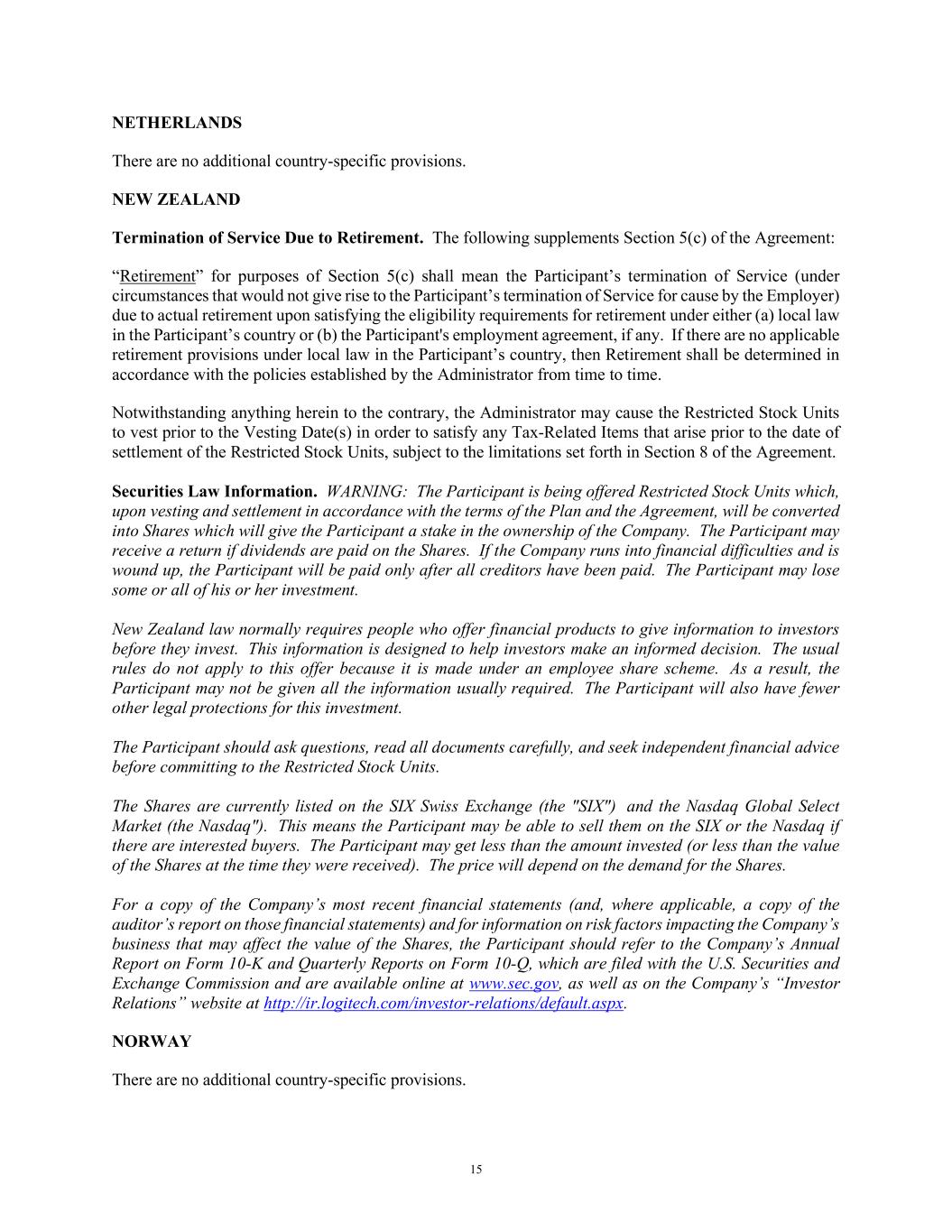 15 NETHERLANDS There are no additional country-specific provisions. NEW ZEALAND Termination of Service Due to Retirement. The following supplements Section 5(c) of the Agreement: “Retirement” for purposes of Section 5(c) shall mean the Participant’s termination of Service (under circumstances that would not give rise to the Participant’s termination of Service for cause by the Employer) due to actual retirement upon satisfying the eligibility requirements for retirement under either (a) local law in the Participant’s country or (b) the Participant's employment agreement, if any. If there are no applicable retirement provisions under local law in the Participant’s country, then Retirement shall be determined in accordance with the policies established by the Administrator from time to time. Notwithstanding anything herein to the contrary, the Administrator may cause the Restricted Stock Units to vest prior to the Vesting Date(s) in order to satisfy any Tax-Related Items that arise prior to the date of settlement of the Restricted Stock Units, subject to the limitations set forth in Section 8 of the Agreement. Securities Law Information. WARNING: The Participant is being offered Restricted Stock Units which, upon vesting and settlement in accordance with the terms of the Plan and the Agreement, will be converted into Shares which will give the Participant a stake in the ownership of the Company. The Participant may receive a return if dividends are paid on the Shares. If the Company runs into financial difficulties and is wound up, the Participant will be paid only after all creditors have been paid. The Participant may lose some or all of his or her investment. New Zealand law normally requires people who offer financial products to give information to investors before they invest. This information is designed to help investors make an informed decision. The usual rules do not apply to this offer because it is made under an employee share scheme. As a result, the Participant may not be given all the information usually required. The Participant will also have fewer other legal protections for this investment. The Participant should ask questions, read all documents carefully, and seek independent financial advice before committing to the Restricted Stock Units. The Shares are currently listed on the SIX Swiss Exchange (the "SIX") and the Nasdaq Global Select Market (the Nasdaq"). This means the Participant may be able to sell them on the SIX or the Nasdaq if there are interested buyers. The Participant may get less than the amount invested (or less than the value of the Shares at the time they were received). The price will depend on the demand for the Shares. For a copy of the Company’s most recent financial statements (and, where applicable, a copy of the auditor’s report on those financial statements) and for information on risk factors impacting the Company’s business that may affect the value of the Shares, the Participant should refer to the Company’s Annual Report on Form 10-K and Quarterly Reports on Form 10-Q, which are filed with the U.S. Securities and Exchange Commission and are available online at www.sec.gov, as well as on the Company’s “Investor Relations” website at http://ir.logitech.com/investor-relations/default.aspx. NORWAY There are no additional country-specific provisions.
