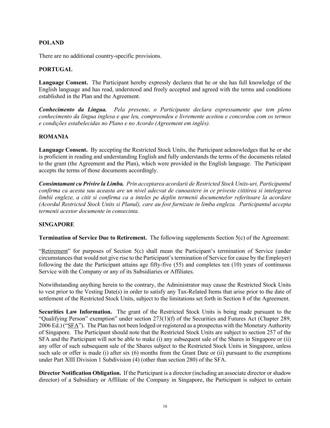16 POLAND There are no additional country-specific provisions. PORTUGAL Language Consent. The Participant hereby expressly declares that he or she has full knowledge of the English language and has read, understood and freely accepted and agreed with the terms and conditions established in the Plan and the Agreement. Conhecimento da Língua. Pela presente, o Participante declara expressamente que tem pleno conhecimento da língua inglesa e que leu, compreendeu e livremente aceitou e concordou com os termos e condições estabelecidas no Plano e no Acordo (Agreement em inglés). ROMANIA Language Consent. By accepting the Restricted Stock Units, the Participant acknowledges that he or she is proficient in reading and understanding English and fully understands the terms of the documents related to the grant (the Agreement and the Plan), which were provided in the English language. The Participant accepts the terms of those documents accordingly. Consimtamant cu Privire la Limba. Prin acceptarea acordarii de Restricted Stock Units-uri, Participantul confirma ca acesta sau aceasta are un nivel adecvat de cunoastere in ce priveste cititirea si intelegerea limbii engleze, a citit si confirma ca a inteles pe deplin termenii documentelor referitoare la acordare (Acordul Restricted Stock Units si Planul), care au fost furnizate in limba engleza. Participantul accepta termenii acestor documente in consecinta. SINGAPORE Termination of Service Due to Retirement. The following supplements Section 5(c) of the Agreement: “Retirement” for purposes of Section 5(c) shall mean the Participant’s termination of Service (under circumstances that would not give rise to the Participant’s termination of Service for cause by the Employer) following the date the Participant attains age fifty-five (55) and completes ten (10) years of continuous Service with the Company or any of its Subsidiaries or Affiliates. Notwithstanding anything herein to the contrary, the Administrator may cause the Restricted Stock Units to vest prior to the Vesting Date(s) in order to satisfy any Tax-Related Items that arise prior to the date of settlement of the Restricted Stock Units, subject to the limitations set forth in Section 8 of the Agreement. Securities Law Information. The grant of the Restricted Stock Units is being made pursuant to the “Qualifying Person” exemption” under section 273(1)(f) of the Securities and Futures Act (Chapter 289, 2006 Ed.) (“SFA”). The Plan has not been lodged or registered as a prospectus with the Monetary Authority of Singapore. The Participant should note that the Restricted Stock Units are subject to section 257 of the SFA and the Participant will not be able to make (i) any subsequent sale of the Shares in Singapore or (ii) any offer of such subsequent sale of the Shares subject to the Restricted Stock Units in Singapore, unless such sale or offer is made (i) after six (6) months from the Grant Date or (ii) pursuant to the exemptions under Part XIII Division 1 Subdivision (4) (other than section 280) of the SFA. Director Notification Obligation. If the Participant is a director (including an associate director or shadow director) of a Subsidiary or Affiliate of the Company in Singapore, the Participant is subject to certain