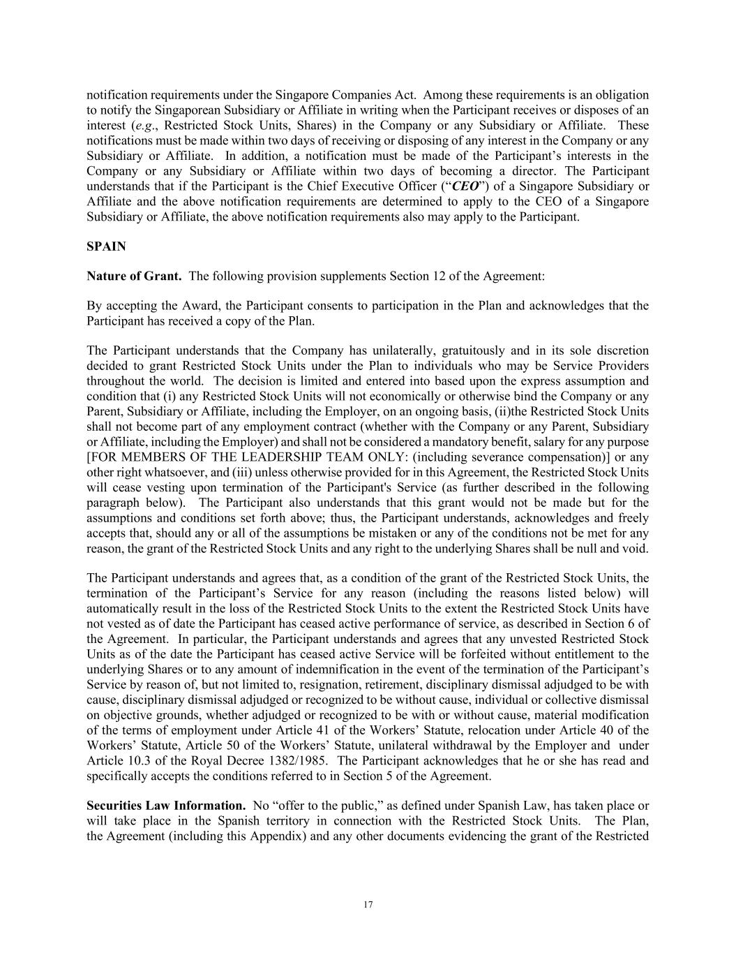 17 notification requirements under the Singapore Companies Act. Among these requirements is an obligation to notify the Singaporean Subsidiary or Affiliate in writing when the Participant receives or disposes of an interest (e.g., Restricted Stock Units, Shares) in the Company or any Subsidiary or Affiliate. These notifications must be made within two days of receiving or disposing of any interest in the Company or any Subsidiary or Affiliate. In addition, a notification must be made of the Participant’s interests in the Company or any Subsidiary or Affiliate within two days of becoming a director. The Participant understands that if the Participant is the Chief Executive Officer (“CEO”) of a Singapore Subsidiary or Affiliate and the above notification requirements are determined to apply to the CEO of a Singapore Subsidiary or Affiliate, the above notification requirements also may apply to the Participant. SPAIN Nature of Grant. The following provision supplements Section 12 of the Agreement: By accepting the Award, the Participant consents to participation in the Plan and acknowledges that the Participant has received a copy of the Plan. The Participant understands that the Company has unilaterally, gratuitously and in its sole discretion decided to grant Restricted Stock Units under the Plan to individuals who may be Service Providers throughout the world. The decision is limited and entered into based upon the express assumption and condition that (i) any Restricted Stock Units will not economically or otherwise bind the Company or any Parent, Subsidiary or Affiliate, including the Employer, on an ongoing basis, (ii)the Restricted Stock Units shall not become part of any employment contract (whether with the Company or any Parent, Subsidiary or Affiliate, including the Employer) and shall not be considered a mandatory benefit, salary for any purpose [FOR MEMBERS OF THE LEADERSHIP TEAM ONLY: (including severance compensation)] or any other right whatsoever, and (iii) unless otherwise provided for in this Agreement, the Restricted Stock Units will cease vesting upon termination of the Participant's Service (as further described in the following paragraph below). The Participant also understands that this grant would not be made but for the assumptions and conditions set forth above; thus, the Participant understands, acknowledges and freely accepts that, should any or all of the assumptions be mistaken or any of the conditions not be met for any reason, the grant of the Restricted Stock Units and any right to the underlying Shares shall be null and void. The Participant understands and agrees that, as a condition of the grant of the Restricted Stock Units, the termination of the Participant’s Service for any reason (including the reasons listed below) will automatically result in the loss of the Restricted Stock Units to the extent the Restricted Stock Units have not vested as of date the Participant has ceased active performance of service, as described in Section 6 of the Agreement. In particular, the Participant understands and agrees that any unvested Restricted Stock Units as of the date the Participant has ceased active Service will be forfeited without entitlement to the underlying Shares or to any amount of indemnification in the event of the termination of the Participant’s Service by reason of, but not limited to, resignation, retirement, disciplinary dismissal adjudged to be with cause, disciplinary dismissal adjudged or recognized to be without cause, individual or collective dismissal on objective grounds, whether adjudged or recognized to be with or without cause, material modification of the terms of employment under Article 41 of the Workers’ Statute, relocation under Article 40 of the Workers’ Statute, Article 50 of the Workers’ Statute, unilateral withdrawal by the Employer and under Article 10.3 of the Royal Decree 1382/1985. The Participant acknowledges that he or she has read and specifically accepts the conditions referred to in Section 5 of the Agreement. Securities Law Information. No “offer to the public,” as defined under Spanish Law, has taken place or will take place in the Spanish territory in connection with the Restricted Stock Units. The Plan, the Agreement (including this Appendix) and any other documents evidencing the grant of the Restricted