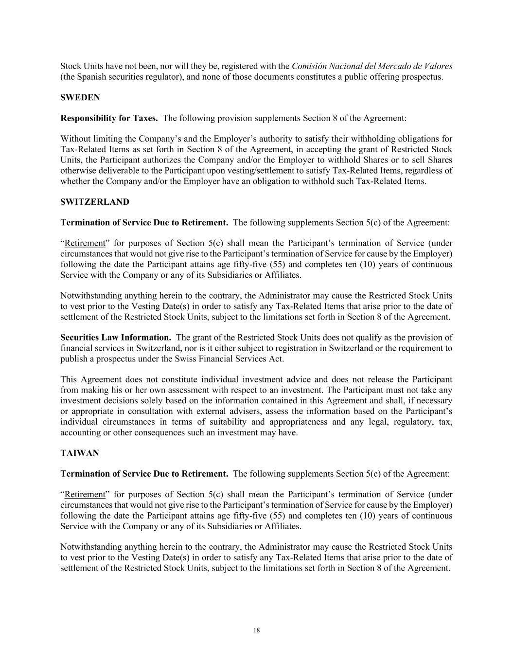 18 Stock Units have not been, nor will they be, registered with the Comisión Nacional del Mercado de Valores (the Spanish securities regulator), and none of those documents constitutes a public offering prospectus. SWEDEN Responsibility for Taxes. The following provision supplements Section 8 of the Agreement: Without limiting the Company’s and the Employer’s authority to satisfy their withholding obligations for Tax-Related Items as set forth in Section 8 of the Agreement, in accepting the grant of Restricted Stock Units, the Participant authorizes the Company and/or the Employer to withhold Shares or to sell Shares otherwise deliverable to the Participant upon vesting/settlement to satisfy Tax-Related Items, regardless of whether the Company and/or the Employer have an obligation to withhold such Tax-Related Items. SWITZERLAND Termination of Service Due to Retirement. The following supplements Section 5(c) of the Agreement: “Retirement” for purposes of Section 5(c) shall mean the Participant’s termination of Service (under circumstances that would not give rise to the Participant’s termination of Service for cause by the Employer) following the date the Participant attains age fifty-five (55) and completes ten (10) years of continuous Service with the Company or any of its Subsidiaries or Affiliates. Notwithstanding anything herein to the contrary, the Administrator may cause the Restricted Stock Units to vest prior to the Vesting Date(s) in order to satisfy any Tax-Related Items that arise prior to the date of settlement of the Restricted Stock Units, subject to the limitations set forth in Section 8 of the Agreement. Securities Law Information. The grant of the Restricted Stock Units does not qualify as the provision of financial services in Switzerland, nor is it either subject to registration in Switzerland or the requirement to publish a prospectus under the Swiss Financial Services Act. This Agreement does not constitute individual investment advice and does not release the Participant from making his or her own assessment with respect to an investment. The Participant must not take any investment decisions solely based on the information contained in this Agreement and shall, if necessary or appropriate in consultation with external advisers, assess the information based on the Participant’s individual circumstances in terms of suitability and appropriateness and any legal, regulatory, tax, accounting or other consequences such an investment may have. TAIWAN Termination of Service Due to Retirement. The following supplements Section 5(c) of the Agreement: “Retirement” for purposes of Section 5(c) shall mean the Participant’s termination of Service (under circumstances that would not give rise to the Participant’s termination of Service for cause by the Employer) following the date the Participant attains age fifty-five (55) and completes ten (10) years of continuous Service with the Company or any of its Subsidiaries or Affiliates. Notwithstanding anything herein to the contrary, the Administrator may cause the Restricted Stock Units to vest prior to the Vesting Date(s) in order to satisfy any Tax-Related Items that arise prior to the date of settlement of the Restricted Stock Units, subject to the limitations set forth in Section 8 of the Agreement.