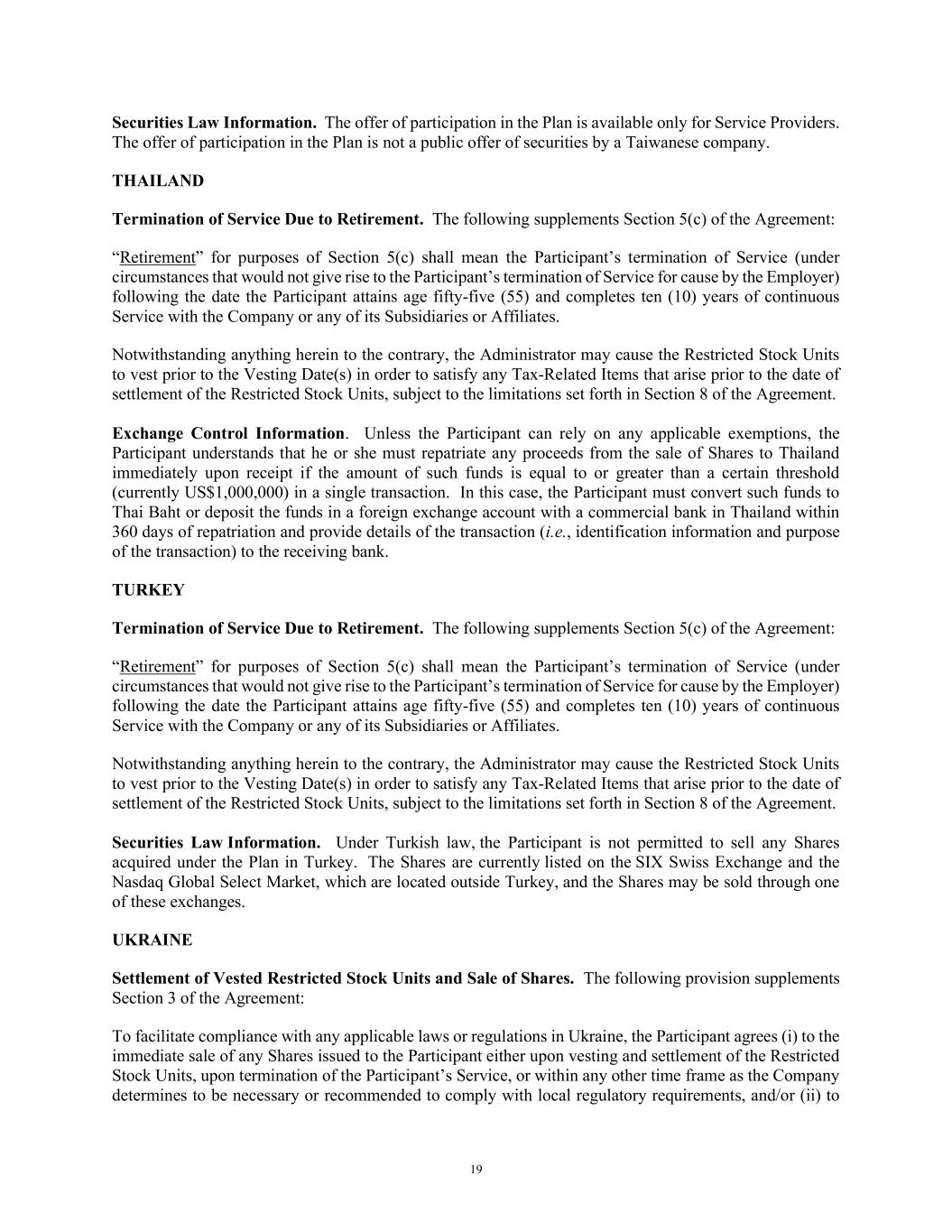 19 Securities Law Information. The offer of participation in the Plan is available only for Service Providers. The offer of participation in the Plan is not a public offer of securities by a Taiwanese company. THAILAND Termination of Service Due to Retirement. The following supplements Section 5(c) of the Agreement: “Retirement” for purposes of Section 5(c) shall mean the Participant’s termination of Service (under circumstances that would not give rise to the Participant’s termination of Service for cause by the Employer) following the date the Participant attains age fifty-five (55) and completes ten (10) years of continuous Service with the Company or any of its Subsidiaries or Affiliates. Notwithstanding anything herein to the contrary, the Administrator may cause the Restricted Stock Units to vest prior to the Vesting Date(s) in order to satisfy any Tax-Related Items that arise prior to the date of settlement of the Restricted Stock Units, subject to the limitations set forth in Section 8 of the Agreement. Exchange Control Information. Unless the Participant can rely on any applicable exemptions, the Participant understands that he or she must repatriate any proceeds from the sale of Shares to Thailand immediately upon receipt if the amount of such funds is equal to or greater than a certain threshold (currently US$1,000,000) in a single transaction. In this case, the Participant must convert such funds to Thai Baht or deposit the funds in a foreign exchange account with a commercial bank in Thailand within 360 days of repatriation and provide details of the transaction (i.e., identification information and purpose of the transaction) to the receiving bank. TURKEY Termination of Service Due to Retirement. The following supplements Section 5(c) of the Agreement: “Retirement” for purposes of Section 5(c) shall mean the Participant’s termination of Service (under circumstances that would not give rise to the Participant’s termination of Service for cause by the Employer) following the date the Participant attains age fifty-five (55) and completes ten (10) years of continuous Service with the Company or any of its Subsidiaries or Affiliates. Notwithstanding anything herein to the contrary, the Administrator may cause the Restricted Stock Units to vest prior to the Vesting Date(s) in order to satisfy any Tax-Related Items that arise prior to the date of settlement of the Restricted Stock Units, subject to the limitations set forth in Section 8 of the Agreement. Securities Law Information. Under Turkish law, the Participant is not permitted to sell any Shares acquired under the Plan in Turkey. The Shares are currently listed on the SIX Swiss Exchange and the Nasdaq Global Select Market, which are located outside Turkey, and the Shares may be sold through one of these exchanges. UKRAINE Settlement of Vested Restricted Stock Units and Sale of Shares. The following provision supplements Section 3 of the Agreement: To facilitate compliance with any applicable laws or regulations in Ukraine, the Participant agrees (i) to the immediate sale of any Shares issued to the Participant either upon vesting and settlement of the Restricted Stock Units, upon termination of the Participant’s Service, or within any other time frame as the Company determines to be necessary or recommended to comply with local regulatory requirements, and/or (ii) to