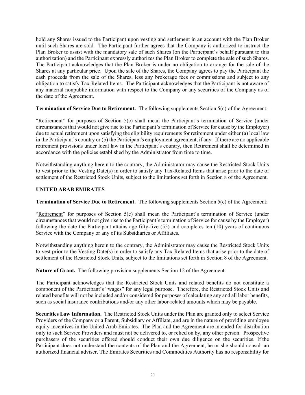 20 hold any Shares issued to the Participant upon vesting and settlement in an account with the Plan Broker until such Shares are sold. The Participant further agrees that the Company is authorized to instruct the Plan Broker to assist with the mandatory sale of such Shares (on the Participant’s behalf pursuant to this authorization) and the Participant expressly authorizes the Plan Broker to complete the sale of such Shares. The Participant acknowledges that the Plan Broker is under no obligation to arrange for the sale of the Shares at any particular price. Upon the sale of the Shares, the Company agrees to pay the Participant the cash proceeds from the sale of the Shares, less any brokerage fees or commissions and subject to any obligation to satisfy Tax-Related Items. The Participant acknowledges that the Participant is not aware of any material nonpublic information with respect to the Company or any securities of the Company as of the date of the Agreement. Termination of Service Due to Retirement. The following supplements Section 5(c) of the Agreement: “Retirement” for purposes of Section 5(c) shall mean the Participant’s termination of Service (under circumstances that would not give rise to the Participant’s termination of Service for cause by the Employer) due to actual retirement upon satisfying the eligibility requirements for retirement under either (a) local law in the Participant’s country or (b) the Participant's employment agreement, if any. If there are no applicable retirement provisions under local law in the Participant’s country, then Retirement shall be determined in accordance with the policies established by the Administrator from time to time. Notwithstanding anything herein to the contrary, the Administrator may cause the Restricted Stock Units to vest prior to the Vesting Date(s) in order to satisfy any Tax-Related Items that arise prior to the date of settlement of the Restricted Stock Units, subject to the limitations set forth in Section 8 of the Agreement. UNITED ARAB EMIRATES Termination of Service Due to Retirement. The following supplements Section 5(c) of the Agreement: “Retirement” for purposes of Section 5(c) shall mean the Participant’s termination of Service (under circumstances that would not give rise to the Participant’s termination of Service for cause by the Employer) following the date the Participant attains age fifty-five (55) and completes ten (10) years of continuous Service with the Company or any of its Subsidiaries or Affiliates. Notwithstanding anything herein to the contrary, the Administrator may cause the Restricted Stock Units to vest prior to the Vesting Date(s) in order to satisfy any Tax-Related Items that arise prior to the date of settlement of the Restricted Stock Units, subject to the limitations set forth in Section 8 of the Agreement. Nature of Grant. The following provision supplements Section 12 of the Agreement: The Participant acknowledges that the Restricted Stock Units and related benefits do not constitute a component of the Participant’s “wages” for any legal purpose. Therefore, the Restricted Stock Units and related benefits will not be included and/or considered for purposes of calculating any and all labor benefits, such as social insurance contributions and/or any other labor-related amounts which may be payable. Securities Law Information. The Restricted Stock Units under the Plan are granted only to select Service Providers of the Company or a Parent, Subsidiary or Affiliate, and are in the nature of providing employee equity incentives in the United Arab Emirates. The Plan and the Agreement are intended for distribution only to such Service Providers and must not be delivered to, or relied on by, any other person. Prospective purchasers of the securities offered should conduct their own due diligence on the securities. If the Participant does not understand the contents of the Plan and the Agreement, he or she should consult an authorized financial adviser. The Emirates Securities and Commodities Authority has no responsibility for