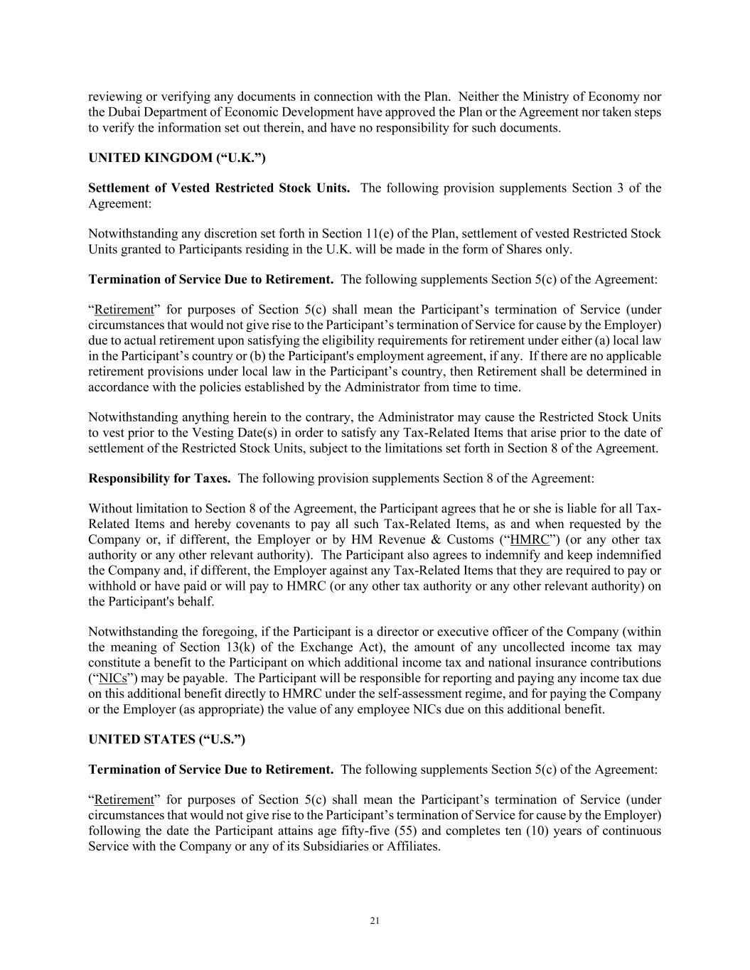 21 reviewing or verifying any documents in connection with the Plan. Neither the Ministry of Economy nor the Dubai Department of Economic Development have approved the Plan or the Agreement nor taken steps to verify the information set out therein, and have no responsibility for such documents. UNITED KINGDOM (“U.K.”) Settlement of Vested Restricted Stock Units. The following provision supplements Section 3 of the Agreement: Notwithstanding any discretion set forth in Section 11(e) of the Plan, settlement of vested Restricted Stock Units granted to Participants residing in the U.K. will be made in the form of Shares only. Termination of Service Due to Retirement. The following supplements Section 5(c) of the Agreement: “Retirement” for purposes of Section 5(c) shall mean the Participant’s termination of Service (under circumstances that would not give rise to the Participant’s termination of Service for cause by the Employer) due to actual retirement upon satisfying the eligibility requirements for retirement under either (a) local law in the Participant’s country or (b) the Participant's employment agreement, if any. If there are no applicable retirement provisions under local law in the Participant’s country, then Retirement shall be determined in accordance with the policies established by the Administrator from time to time. Notwithstanding anything herein to the contrary, the Administrator may cause the Restricted Stock Units to vest prior to the Vesting Date(s) in order to satisfy any Tax-Related Items that arise prior to the date of settlement of the Restricted Stock Units, subject to the limitations set forth in Section 8 of the Agreement. Responsibility for Taxes. The following provision supplements Section 8 of the Agreement: Without limitation to Section 8 of the Agreement, the Participant agrees that he or she is liable for all Tax- Related Items and hereby covenants to pay all such Tax-Related Items, as and when requested by the Company or, if different, the Employer or by HM Revenue & Customs (“HMRC”) (or any other tax authority or any other relevant authority). The Participant also agrees to indemnify and keep indemnified the Company and, if different, the Employer against any Tax-Related Items that they are required to pay or withhold or have paid or will pay to HMRC (or any other tax authority or any other relevant authority) on the Participant's behalf. Notwithstanding the foregoing, if the Participant is a director or executive officer of the Company (within the meaning of Section 13(k) of the Exchange Act), the amount of any uncollected income tax may constitute a benefit to the Participant on which additional income tax and national insurance contributions (“NICs”) may be payable. The Participant will be responsible for reporting and paying any income tax due on this additional benefit directly to HMRC under the self-assessment regime, and for paying the Company or the Employer (as appropriate) the value of any employee NICs due on this additional benefit. UNITED STATES (“U.S.”) Termination of Service Due to Retirement. The following supplements Section 5(c) of the Agreement: “Retirement” for purposes of Section 5(c) shall mean the Participant’s termination of Service (under circumstances that would not give rise to the Participant’s termination of Service for cause by the Employer) following the date the Participant attains age fifty-five (55) and completes ten (10) years of continuous Service with the Company or any of its Subsidiaries or Affiliates.