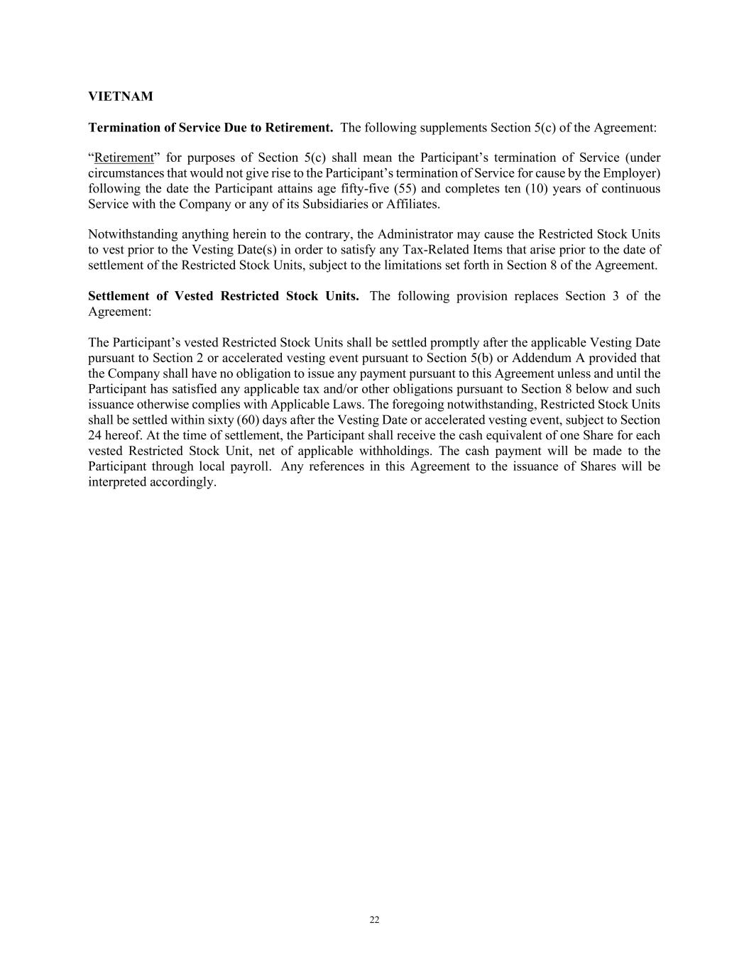 22 VIETNAM Termination of Service Due to Retirement. The following supplements Section 5(c) of the Agreement: “Retirement” for purposes of Section 5(c) shall mean the Participant’s termination of Service (under circumstances that would not give rise to the Participant’s termination of Service for cause by the Employer) following the date the Participant attains age fifty-five (55) and completes ten (10) years of continuous Service with the Company or any of its Subsidiaries or Affiliates. Notwithstanding anything herein to the contrary, the Administrator may cause the Restricted Stock Units to vest prior to the Vesting Date(s) in order to satisfy any Tax-Related Items that arise prior to the date of settlement of the Restricted Stock Units, subject to the limitations set forth in Section 8 of the Agreement. Settlement of Vested Restricted Stock Units. The following provision replaces Section 3 of the Agreement: The Participant’s vested Restricted Stock Units shall be settled promptly after the applicable Vesting Date pursuant to Section 2 or accelerated vesting event pursuant to Section 5(b) or Addendum A provided that the Company shall have no obligation to issue any payment pursuant to this Agreement unless and until the Participant has satisfied any applicable tax and/or other obligations pursuant to Section 8 below and such issuance otherwise complies with Applicable Laws. The foregoing notwithstanding, Restricted Stock Units shall be settled within sixty (60) days after the Vesting Date or accelerated vesting event, subject to Section 24 hereof. At the time of settlement, the Participant shall receive the cash equivalent of one Share for each vested Restricted Stock Unit, net of applicable withholdings. The cash payment will be made to the Participant through local payroll. Any references in this Agreement to the issuance of Shares will be interpreted accordingly.