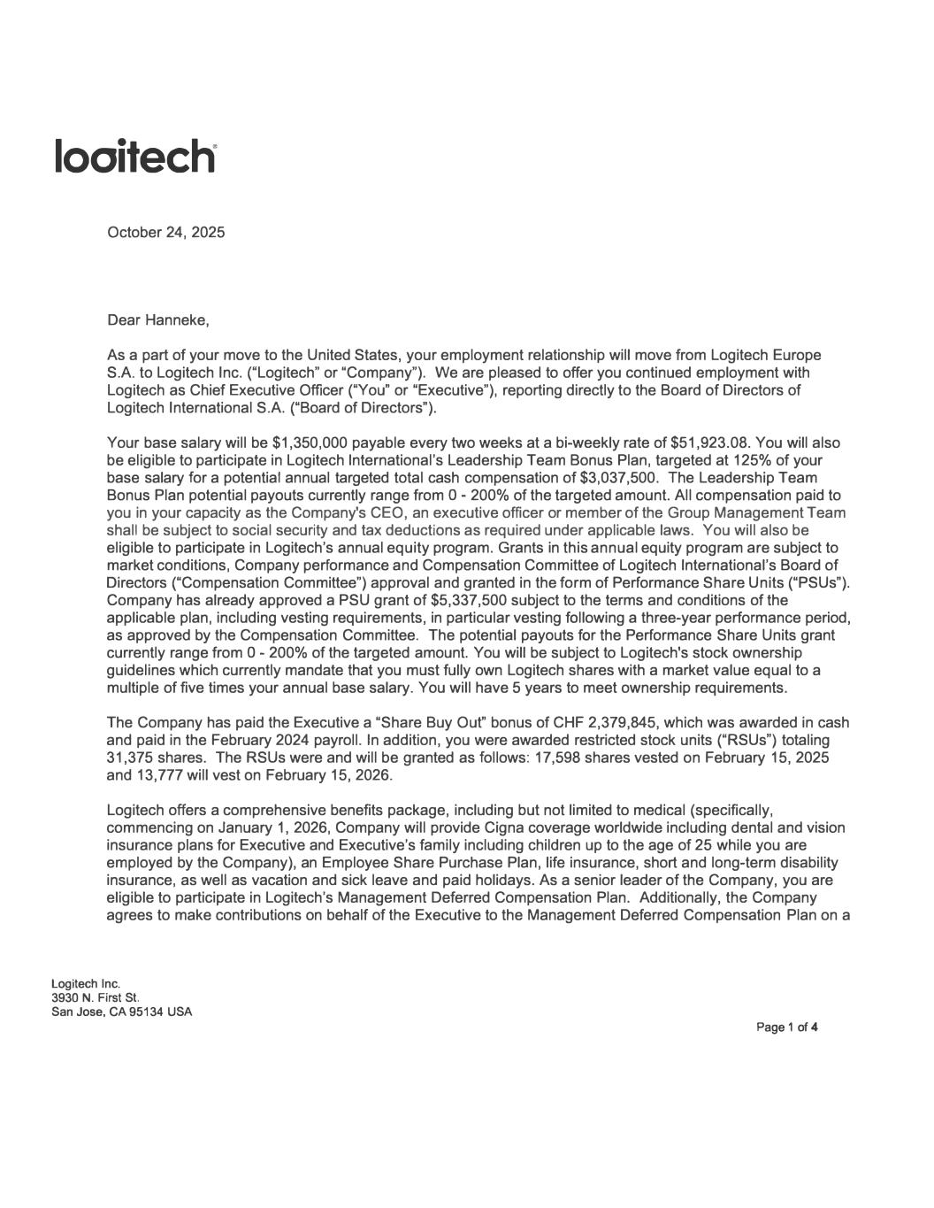 looitech� October 24, 2025 Dear Hanneke, As a part of your move to the United States, your employment relationship will move from Logitech Europe S.A. to Logitech Inc. ("Logitech" or "Company"). We are pleased to offer you continued employment with Logitech as Chief Executive Officer ("You" or "Executive"), reporting directly to the Board of Directors of Logitech International S.A. ("Board of Directors"). Your base salary will be $1,350,000 payable every two weeks at a bi-weekly rate of $51,923.08. You will also be eligible to participate in Logitech lnternational's Leadership Team Bonus Plan, targeted at 125% of your base salary for a potential annual targeted total cash compensation of $3,037,500. The Leadership Team Bonus Plan potential payouts currently range from O - 200% of the targeted amount. All compensation paid to you in your capacity as the Company's CEO, an executive officer or member of the Group Management Team shall be subject to social security and tax deductions as required under applicable laws. You will also be eligible to participate in Logitech's annual equity program. Grants in this annual equity program are subject to market conditions, Company performance and Compensation Committee of Logitech lnternational's Board of Directors ("Compensation Committee") approval and granted in the form of Performance Share Units ("PSUs"). Company has already approved a PSU grant of $5,337,500 subject to the terms and conditions of the applicable plan, including vesting requirements, in particular vesting following a three-year performance period, as approved by the Compensation Committee. The potential payouts for the Performance Share Units grant currently range from O - 200% of the targeted amount. You will be subject to Logitech's stock ownership guidelines which currently mandate that you must fully own Logitech shares with a market value equal to a multiple of five times your annual base salary. You will have 5 years to meet ownership requirements. The Company has paid the Executive a "Share Buy Out" bonus of CHF 2,379,845, which was awarded in cash and paid in the February 2024 payroll. In addition, you were awarded restricted stock units ("RSUs") totaling 31,375 shares. The RSUs were and will be granted as follows: 17,598 shares vested on February 15, 2025 and 13,777 will vest on February 15, 2026. Logitech offers a comprehensive benefits package, including but not limited to medical (specifically, commencing on January 1, 2026, Company will provide Cigna coverage worldwide including dental and vision insurance plans for Executive and Executive's family including children up to the age of 25 while you are employed by the Company), an Employee Share Purchase Plan, life insurance, short and long-term disability insurance, as well as vacation and sick leave and paid holidays. As a senior leader of the Company, you are eligible to participate in Logitech's Management Deferred Compensation Plan. Additionally, the Company agrees to make contributions on behalf of the Executive to the Management Deferred Compensation Plan on a Logitech Inc. 3930 N. First St. San Jose, CA 95134 USA Page 1 of 4
