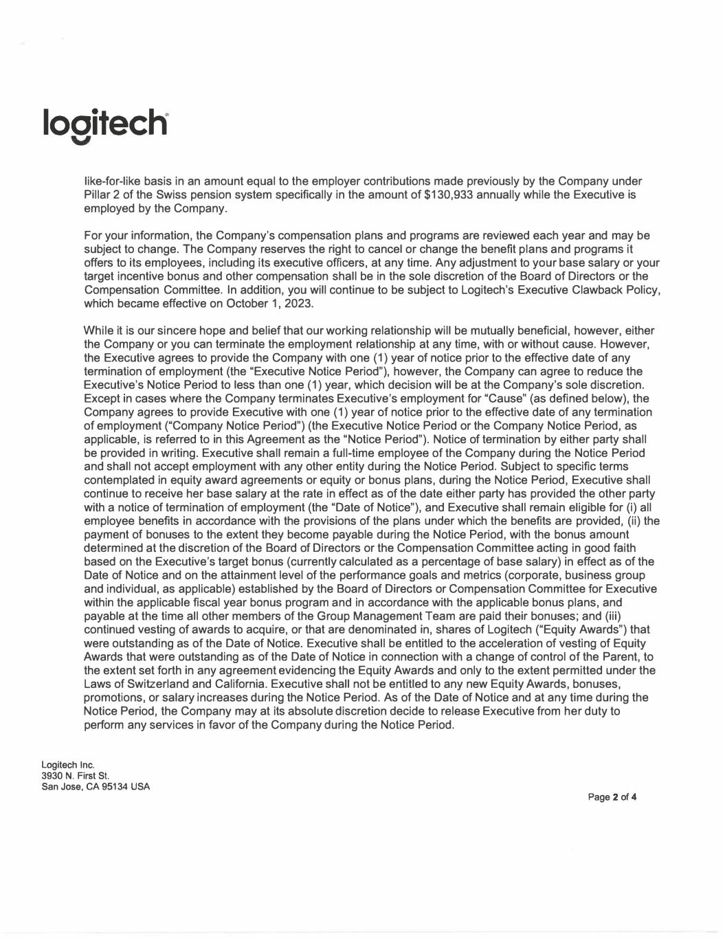 looitech� like-for-like basis in an amount equal to the employer contributions made previously by the Company under Pillar 2 of the Swiss pension system specifically in the amount of $130,933 annually while the Executive is employed by the Company. For your information, the Company's compensation plans and programs are reviewed each year and may be subject to change. The Company reserves the right to cancel or change the benefit plans and programs it offers to its employees, including its executive officers, at any time. Any adjustment to your base salary or your target incentive bonus and other compensation shall be in the sole discretion of the Board of Directors or the Compensation Committee. In addition, you will continue to be subject to Logitech's Executive Clawback Policy, which became effective on October 1, 2023. While it is our sincere hope and belief that our working relationship will be mutually beneficial, however, either the Company or you can terminate the employment relationship at any time, with or without cause. However, the Executive agrees to provide the Company with one ( 1) year of notice prior to the effective date of any termination of employment (the "Executive Notice Period"), however, the Company can agree to reduce the Executive's Notice Period to less than one (1) year, which decision will be at the Company's sole discretion. Except in cases where the Company terminates Executive's employment for "Cause" (as defined below), the Company agrees to provide Executive with one (1) year of notice prior to the effective date of any termination of employment ("Company Notice Period") (the Executive Notice Period or the Company Notice Period, as applicable, is referred to in this Agreement as the "Notice Period"). Notice of termination by either party shall be provided in writing. Executive shall remain a full-time employee of the Company during the Notice Period and shall not accept employment with any other entity during the Notice Period. Subject to specific terms contemplated in equity award agreements or equity or bonus plans, during the Notice Period, Executive shall continue to receive her base salary at the rate in effect as of the date either party has provided the other party with a notice of termination of employment (the "Date of Notice"), and Executive shall remain eligible for (i) all employee benefits in accordance with the provisions of the plans under which the benefits are provided, (ii) the payment of bonuses to the extent they become payable during the Notice Period, with the bonus amount determined at the discretion of the Board of Directors or the Compensation Committee acting in good faith based on the Executive's target bonus (currently calculated as a percentage of base salary) in effect as of the Date of Notice and on the attainment level of the performance goals and metrics (corporate, business group and individual, as applicable) established by the Board of Directors or Compensation Committee for Executive within the applicable fiscal year bonus program and in accordance with the applicable bonus plans, and payable at the time all other members of the Group Management Team are paid their bonuses; and (iii) continued vesting of awards to acquire, or that are denominated in, shares of Logitech ("Equity Awards") that were outstanding as of the Date of Notice. Executive shall be entitled to the acceleration of vesting of Equity Awards that were outstanding as of the Date of Notice in connection with a change of control of the Parent, to the extent set forth in any agreement evidencing the Equity Awards and only to the extent permitted under the Laws of Switzerland and California. Executive shall not be entitled to any new Equity Awards, bonuses, promotions, or salary increases during the Notice Period. As of the Date of Notice and at any time during the Notice Period, the Company may at its absolute discretion decide to release Executive from her duty to perform any services in favor of the Company during the Notice Period. Logitech Inc. 3930 N. First St. San Jose, CA 95134 USA Page 2 of 4