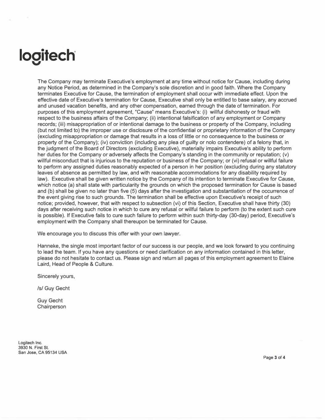 looitech 3 The Company may terminate Executive's employment at any time without notice for Cause, including during any Notice Period, as determined in the Company's sole discretion and in good faith. Where the Company terminates Executive for Cause, the termination of employment shall occur with immediate effect. Upon the effective date of Executive's termination for Cause, Executive shall only be entitled to base salary, any accrued and unused vacation benefits, and any other compensation, earned through the date of termination. For purposes of this employment agreement, "Cause" means Executive's: (i) willful dishonesty or fraud with respect to the business affairs of the Company; (ii) intentional falsification of any employment or Company records; (iii) misappropriation of or intentional damage to the business or property of the Company, including (but not limited to) the improper use or disclosure of the confidential or proprietary information of the Company (excluding misappropriation or damage that results in a loss of little or no consequence to the business or property of the Company); (iv) conviction (including any plea of guilty or nolo contendere) of a felony that, in the judgment of the Board of Directors (excluding Executive), materially impairs Executive's ability to perform her duties for the Company or'adversely affects the Company's standing in the community or reputation; (v) willful misconduct that is injurious to the reputation or business of the Company; or (vi) refusal or willful failure to perform any assigned duties reasonably expected of a person in her position (excluding during any statutory leaves of absence as permitted by law, and with reasonable accommodations for any disability required by law). Executive shall be given written notice by the Company of its intention to terminate Executive for Cause, which notice (a) shall state with particularity the grounds on which the proposed termination for Cause is based and (b) shall be given no later than five (5) days after the investigation and substantiation of the occurrence of the event giving rise to such grounds. The termination shall be effective upon Executive's receipt of such notice; provided, however, that with respect to subsection (vi) of this Section, Executive shall have thirty (30) days after receiving such notice in which to cure any refusal or willful failure to perform (to the extent such cure is possible). If Executive fails to cure such failure to perform within such thirty-day (30-day) period, Executive's employment with the Company shall thereupon be terminated for Cause. We encourage you to discuss this offer with your own lawyer. Hanneke, the single most important factor of our success is our people, and we look forward to you continuing to lead the team. If you have any questions or need clarification on any information contained in this letter, please do not hesitate to contact us. Please sign and return all pages of this employment agreement to Elaine Laird, Head of People & Culture. Sincerely yours, /s/ Guy Gecht Guy Gecht Chairperson Logitech Inc. 3930 N. First St. San Jose, CA 95134 USA Page 3 of 4