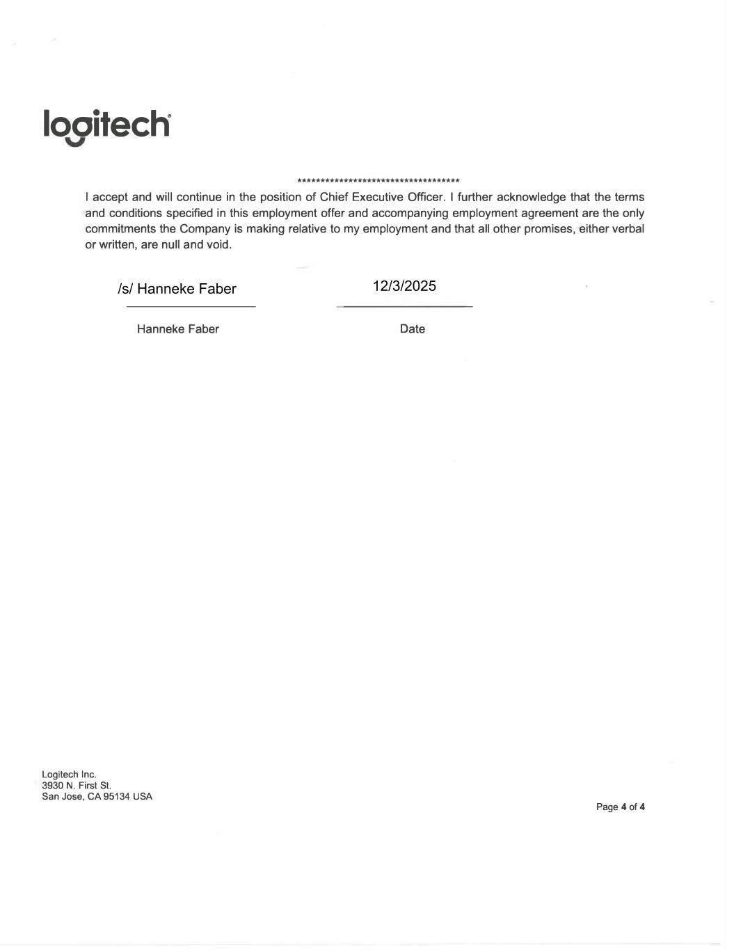 looitech ® *********************************** I accept and will continue in the position of Chief Executive Officer. I further acknowledge that the terms and conditions specified in this employment offer and accompanying employment agreement are the only commitments the Company is making relative to my employment and that all other promises, either verbal or written, are null and void. Logitech Inc. 3930 N. First St. Hanneke Faber San Jose, CA 95134 USA Date Page 4 of 4 /s/ Hanneke Faber 12/3/2025