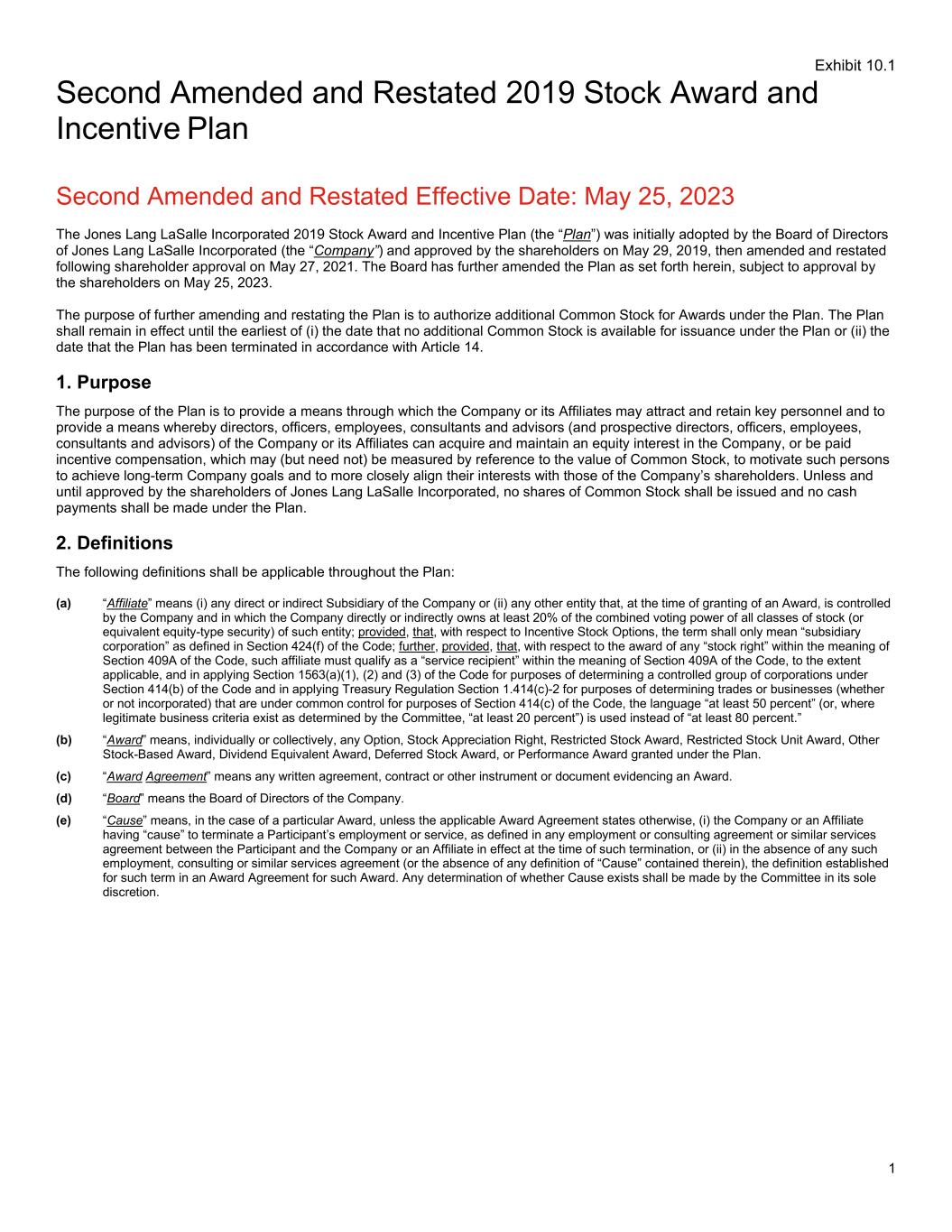 Exhibit 10.1 1 Second Amended and Restated 2019 Stock Award and Incentive Plan Second Amended and Restated Effective Date: May 25, 2023 The Jones Lang LaSalle Incorporated 2019 Stock Award and Incentive Plan (the “Plan”) was initially adopted by the Board of Directors of Jones Lang LaSalle Incorporated (the “Company”) and approved by the shareholders on May 29, 2019, then amended and restated following shareholder approval on May 27, 2021. The Board has further amended the Plan as set forth herein, subject to approval by the shareholders on May 25, 2023. The purpose of further amending and restating the Plan is to authorize additional Common Stock for Awards under the Plan. The Plan shall remain in effect until the earliest of (i) the date that no additional Common Stock is available for issuance under the Plan or (ii) the date that the Plan has been terminated in accordance with Article 14. 1. Purpose The purpose of the Plan is to provide a means through which the Company or its Affiliates may attract and retain key personnel and to provide a means whereby directors, officers, employees, consultants and advisors (and prospective directors, officers, employees, consultants and advisors) of the Company or its Affiliates can acquire and maintain an equity interest in the Company, or be paid incentive compensation, which may (but need not) be measured by reference to the value of Common Stock, to motivate such persons to achieve long-term Company goals and to more closely align their interests with those of the Company’s shareholders. Unless and until approved by the shareholders of Jones Lang LaSalle Incorporated, no shares of Common Stock shall be issued and no cash payments shall be made under the Plan. 2. Definitions The following definitions shall be applicable throughout the Plan: (a) “Affiliate” means (i) any direct or indirect Subsidiary of the Company or (ii) any other entity that, at the time of granting of an Award, is controlled by the Company and in which the Company directly or indirectly owns at least 20% of the combined voting power of all classes of stock (or equivalent equity-type security) of such entity; provided, that, with respect to Incentive Stock Options, the term shall only mean “subsidiary corporation” as defined in Section 424(f) of the Code; further, provided, that, with respect to the award of any “stock right” within the meaning of Section 409A of the Code, such affiliate must qualify as a “service recipient” within the meaning of Section 409A of the Code, to the extent applicable, and in applying Section 1563(a)(1), (2) and (3) of the Code for purposes of determining a controlled group of corporations under Section 414(b) of the Code and in applying Treasury Regulation Section 1.414(c)-2 for purposes of determining trades or businesses (whether or not incorporated) that are under common control for purposes of Section 414(c) of the Code, the language “at least 50 percent” (or, where legitimate business criteria exist as determined by the Committee, “at least 20 percent”) is used instead of “at least 80 percent.” (b) “Award” means, individually or collectively, any Option, Stock Appreciation Right, Restricted Stock Award, Restricted Stock Unit Award, Other Stock-Based Award, Dividend Equivalent Award, Deferred Stock Award, or Performance Award granted under the Plan. (c) “Award Agreement” means any written agreement, contract or other instrument or document evidencing an Award. (d) “Board” means the Board of Directors of the Company. (e) “Cause” means, in the case of a particular Award, unless the applicable Award Agreement states otherwise, (i) the Company or an Affiliate having “cause” to terminate a Participant’s employment or service, as defined in any employment or consulting agreement or similar services agreement between the Participant and the Company or an Affiliate in effect at the time of such termination, or (ii) in the absence of any such employment, consulting or similar services agreement (or the absence of any definition of “Cause” contained therein), the definition established for such term in an Award Agreement for such Award. Any determination of whether Cause exists shall be made by the Committee in its sole discretion.