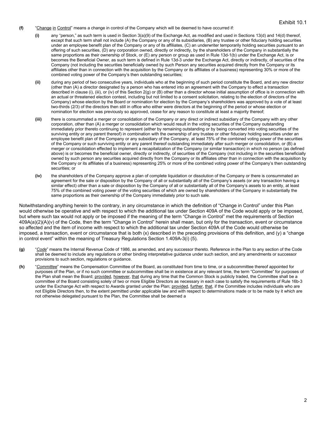 Exhibit 10.1 2 (f) “Change in Control” means a change in control of the Company which will be deemed to have occurred if: (i) any “person,” as such term is used in Section 3(a)(9) of the Exchange Act, as modified and used in Sections 13(d) and 14(d) thereof, except that such term shall not include (A) the Company or any of its subsidiaries, (B) any trustee or other fiduciary holding securities under an employee benefit plan of the Company or any of its affiliates, (C) an underwriter temporarily holding securities pursuant to an offering of such securities, (D) any corporation owned, directly or indirectly, by the shareholders of the Company in substantially the same proportions as their ownership of Stock, or (E) any person or group as used in Rule 13d-1(b) under the Exchange Act, is or becomes the Beneficial Owner, as such term is defined in Rule 13d-3 under the Exchange Act, directly or indirectly, of securities of the Company (not including the securities beneficially owned by such Person any securities acquired directly from the Company or its affiliates other than in connection with the acquisition by the Company or its affiliates of a business) representing 30% or more of the combined voting power of the Company’s then outstanding securities; (ii) during any period of two consecutive years, individuals who at the beginning of such period constitute the Board, and any new director (other than (A) a director designated by a person who has entered into an agreement with the Company to effect a transaction described in clause (i), (iii), or (iv) of this Section 2(g) or (B) other than a director whose initial assumption of office is in connection with an actual or threatened election contest, including but not limited to a consent solicitation, relating to the election of directors of the Company) whose election by the Board or nomination for election by the Company’s shareholders was approved by a vote of at least two-thirds (2/3) of the directors then still in office who either were directors at the beginning of the period or whose election or nomination for election was previously so approved, cease for any reason to constitute at least a majority thereof; (iii) there is consummated a merger or consolidation of the Company or any direct or indirect subsidiary of the Company with any other corporation, other than (A) a merger or consolidation which would result in the voting securities of the Company outstanding immediately prior thereto continuing to represent (either by remaining outstanding or by being converted into voting securities of the surviving entity or any parent thereof) in combination with the ownership of any trustee or other fiduciary holding securities under an employee benefit plan of the Company or any subsidiary of the Company, at least 75% of the combined voting power of the securities of the Company or such surviving entity or any parent thereof outstanding immediately after such merger or consolidation, or (B) a merger or consolidation effected to implement a recapitalization of the Company (or similar transaction) in which no person (as defined above) is or becomes the beneficial owner, directly or indirectly, of securities of the Company (not including in the securities beneficially owned by such person any securities acquired directly from the Company or its affiliates other than in connection with the acquisition by the Company or its affiliates of a business) representing 25% or more of the combined voting power of the Company’s then outstanding securities; or (iv) the shareholders of the Company approve a plan of complete liquidation or dissolution of the Company or there is consummated an agreement for the sale or disposition by the Company of all or substantially all of the Company’s assets (or any transaction having a similar effect) other than a sale or disposition by the Company of all or substantially all of the Company’s assets to an entity, at least 75% of the combined voting power of the voting securities of which are owned by shareholders of the Company in substantially the same proportions as their ownership of the Company immediately prior to such sale. Notwithstanding anything herein to the contrary, in any circumstance in which the definition of “Change in Control” under this Plan would otherwise be operative and with respect to which the additional tax under Section 409A of the Code would apply or be imposed, but where such tax would not apply or be imposed if the meaning of the term “Change in Control” met the requirements of Section 409A(a)(2)(A)(v) of the Code, then the term “Change in Control” herein shall mean, but only for the transaction, event or circumstance so affected and the item of income with respect to which the additional tax under Section 409A of the Code would otherwise be imposed, a transaction, event or circumstance that is both (x) described in the preceding provisions of this definition, and (y) a “change in control event” within the meaning of Treasury Regulations Section 1.409A-3(i) (5). (g) “Code” means the Internal Revenue Code of 1986, as amended, and any successor thereto. Reference in the Plan to any section of the Code shall be deemed to include any regulations or other binding interpretative guidance under such section, and any amendments or successor provisions to such section, regulations or guidance. (h) “Committee” means the Compensation Committee of the Board, as constituted from time to time, or a subcommittee thereof appointed for purposes of the Plan, or if no such committee or subcommittee shall be in existence at any relevant time, the term “Committee” for purposes of the Plan shall mean the Board; provided, however, that during any time that the Common Stock is publicly traded, the Committee shall be a committee of the Board consisting solely of two or more Eligible Directors as necessary in each case to satisfy the requirements of Rule 16b-3 under the Ex