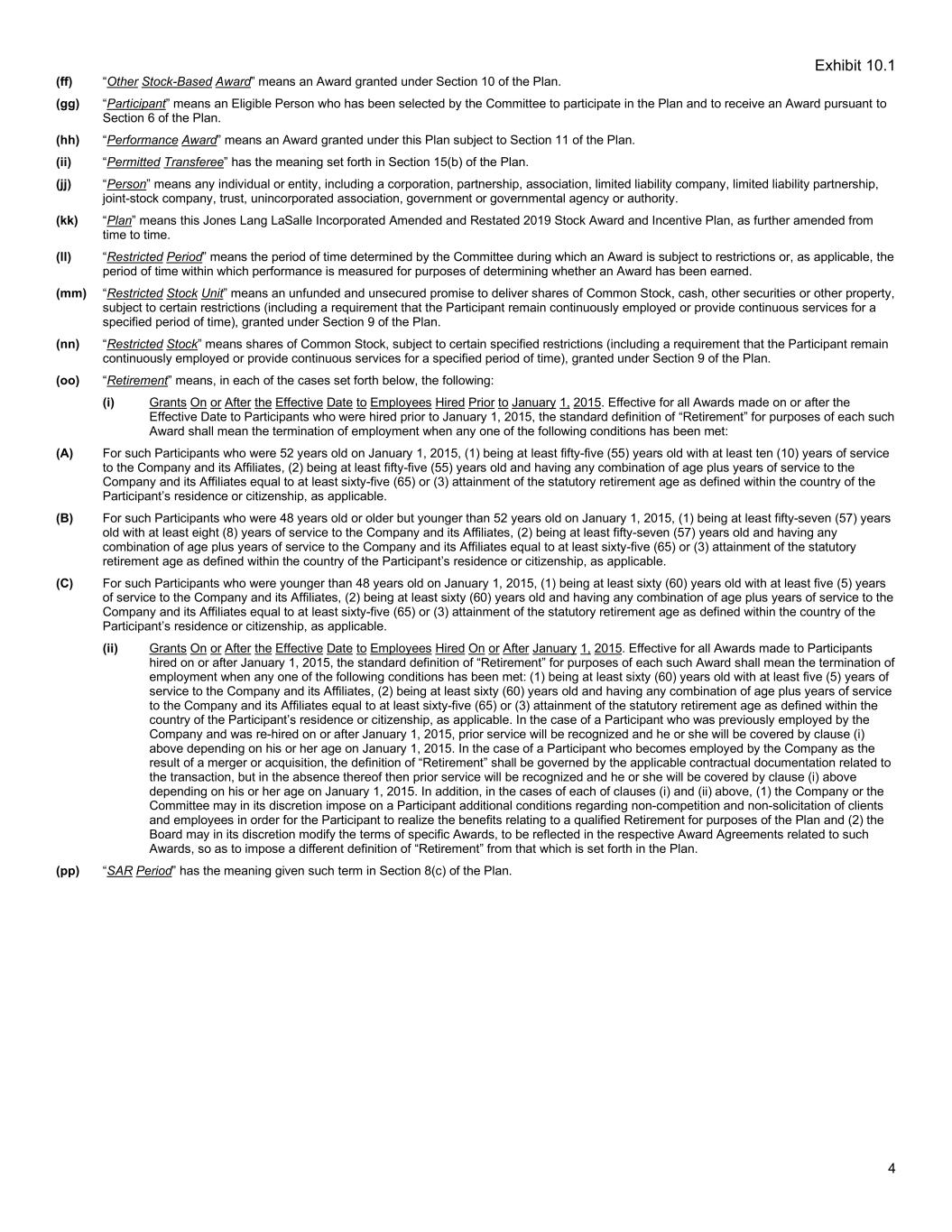 Exhibit 10.1 4 (ff) “Other Stock-Based Award” means an Award granted under Section 10 of the Plan. (gg) “Participant” means an Eligible Person who has been selected by the Committee to participate in the Plan and to receive an Award pursuant to Section 6 of the Plan. (hh) “Performance Award” means an Award granted under this Plan subject to Section 11 of the Plan. (ii) “Permitted Transferee” has the meaning set forth in Section 15(b) of the Plan. (jj) “Person” means any individual or entity, including a corporation, partnership, association, limited liability company, limited liability partnership, joint-stock company, trust, unincorporated association, government or governmental agency or authority. (kk) “Plan” means this Jones Lang LaSalle Incorporated Amended and Restated 2019 Stock Award and Incentive Plan, as further amended from time to time. (ll) “Restricted Period” means the period of time determined by the Committee during which an Award is subject to restrictions or, as applicable, the period of time within which performance is measured for purposes of determining whether an Award has been earned. (mm) “Restricted Stock Unit” means an unfunded and unsecured promise to deliver shares of Common Stock, cash, other securities or other property, subject to certain restrictions (including a requirement that the Participant remain continuously employed or provide continuous services for a specified period of time), granted under Section 9 of the Plan. (nn) “Restricted Stock” means shares of Common Stock, subject to certain specified restrictions (including a requirement that the Participant remain continuously employed or provide continuous services for a specified period of time), granted under Section 9 of the Plan. (oo) “Retirement” means, in each of the cases set forth below, the following: (i) Grants On or After the Effective Date to Employees Hired Prior to January 1, 2015. Effective for all Awards made on or after the Effective Date to Participants who were hired prior to January 1, 2015, the standard definition of “Retirement” for purposes of each such Award shall mean the termination of employment when any one of the following conditions has been met: (A) For such Participants who were 52 years old on January 1, 2015, (1) being at least fifty-five (55) years old with at least ten (10) years of service to the Company and its Affiliates, (2) being at least fifty-five (55) years old and having any combination of age plus years of service to the Company and its Affiliates equal to at least sixty-five (65) or (3) attainment of the statutory retirement age as defined within the country of the Participant’s residence or citizenship, as applicable. (B) For such Participants who were 48 years old or older but younger than 52 years old on January 1, 2015, (1) being at least fifty-seven (57) years old with at least eight (8) years of service to the Company and its Affiliates, (2) being at least fifty-seven (57) years old and having any combination of age plus years of service to the Company and its Affiliates equal to at least sixty-five (65) or (3) attainment of the statutory retirement age as defined within the country of the Participant’s residence or citizenship, as applicable. (C) For such Participants who were younger than 48 years old on January 1, 2015, (1) being at least sixty (60) years old with at least five (5) years of service to the Company and its Affiliates, (2) being at least sixty (60) years old and having any combination of age plus years of service to the Company and its Affiliates equal to at least sixty-five (65) or (3) attainment of the statutory retirement age as defined within the country of the Participant’s residence or citizenship, as applicable. (ii) Grants On or After the Effective Date to Employees Hired On or After January 1, 2015. Effective for all Awards made to Participants hired on or after January 1, 2015, the standard definition of “Retirement” for purposes of each such Award shall mean the termination of employment when any one of the following conditions has been met: (1) being at least sixty (60) years old with at least five (5) years of service to the Company and its Affiliates, (2) being at least sixty (60) years old and having any combination of age plus years of service to the Company and its Affiliates equal to at least sixty-five (65) or (3) attainment of the statutory retirement age as defined within the country of the Participant’s residence or citizenship, as applicable. In the case of a Participant who was previously employed by the Company and was re-hired on or after January 1, 2015, prior service will be recognized and he or she will be covered by clause (i) above depending on his or her age on January 1, 2015. In the case of a Participant who becomes employed by the Company as the result of a merger or acquisition, the definition of “Retirement” shall be governed by the applicable contractual documentation related to the transaction, but in the absence thereof then prior service will be recognized and he or she will be covered by clause (i) above depending on his or her age on January 1, 2015. In addition, in the cases of each of clauses (i) and (ii) above, (1) the Company or the Committee may in its discretion impose on a Participant additional conditions regarding non-competition and non-solicitation of clients and employees in order for the Participant to realize the benefits relating to a qualified Retirement for purposes of the Plan and (2) the Board may in its discretion modify the terms of specific Awards, to be reflected in the respective Award Agreements related to such Awards, so as to impose a different definition of “Retirement” from that which is set forth in the Plan. (pp) “SAR Period” has the meaning given such term in Section 8(c) of the Plan.