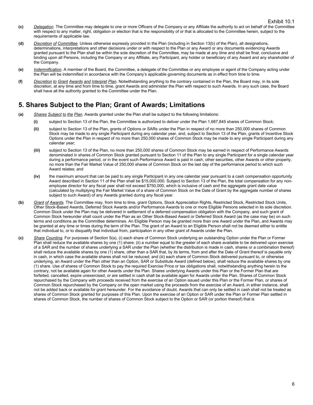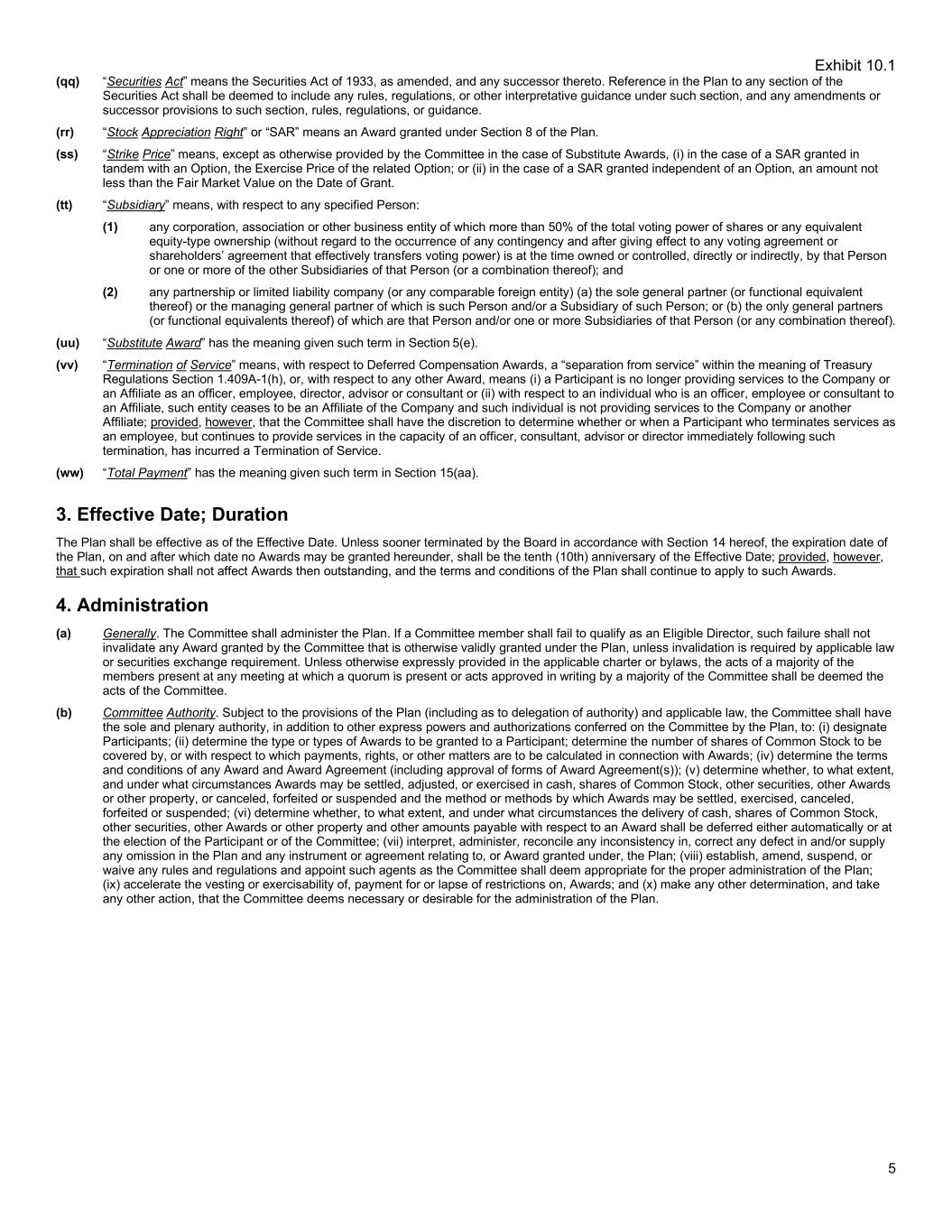 Exhibit 10.1 5 (qq) “Securities Act” means the Securities Act of 1933, as amended, and any successor thereto. Reference in the Plan to any section of the Securities Act shall be deemed to include any rules, regulations, or other interpretative guidance under such section, and any amendments or successor provisions to such section, rules, regulations, or guidance. (rr) “Stock Appreciation Right” or “SAR” means an Award granted under Section 8 of the Plan. (ss) “Strike Price” means, except as otherwise provided by the Committee in the case of Substitute Awards, (i) in the case of a SAR granted in tandem with an Option, the Exercise Price of the related Option; or (ii) in the case of a SAR granted independent of an Option, an amount not less than the Fair Market Value on the Date of Grant. (tt) “Subsidiary” means, with respect to any specified Person: (1) any corporation, association or other business entity of which more than 50% of the total voting power of shares or any equivalent equity-type ownership (without regard to the occurrence of any contingency and after giving effect to any voting agreement or shareholders’ agreement that effectively transfers voting power) is at the time owned or controlled, directly or indirectly, by that Person or one or more of the other Subsidiaries of that Person (or a combination thereof); and (2) any partnership or limited liability company (or any comparable foreign entity) (a) the sole general partner (or functional equivalent thereof) or the managing general partner of which is such Person and/or a Subsidiary of such Person; or (b) the only general partners (or functional equivalents thereof) of which are that Person and/or one or more Subsidiaries of that Person (or any combination thereof). (uu) “Substitute Award” has the meaning given such term in Section 5(e). (vv) “Termination of Service” means, with respect to Deferred Compensation Awards, a “separation from service” within the meaning of Treasury Regulations Section 1.409A-1(h), or, with respect to any other Award, means (i) a Participant is no longer providing services to the Company or an Affiliate as an officer, employee, director, advisor or consultant or (ii) with respect to an individual who is an officer, employee or consultant to an Affiliate, such entity ceases to be an Affiliate of the Company and such individual is not providing services to the Company or another Affiliate; provided, however, that the Committee shall have the discretion to determine whether or when a Participant who terminates services as an employee, but continues to provide services in the capacity of an officer, consultant, advisor or director immediately following such termination, has incurred a Termination of Service. (ww) “Total Payment” has the meaning given such term in Section 15(aa). 3. Effective Date; Duration The Plan shall be effective as of the Effective Date. Unless sooner terminated by the Board in accordance with Section 14 hereof, the expiration date of the Plan, on and after which date no Awards may be granted hereunder, shall be the tenth (10th) anniversary of the Effective Date; provided, however, that such expiration shall not affect Awards then outstanding, and the terms and conditions of the Plan shall continue to apply to such Awards. 4. Administration (a) Generally. The Committee shall administer the Plan. If a Committee member shall fail to qualify as an Eligible Director, such failure shall not invalidate any Award granted by the Committee that is otherwise validly granted under the Plan, unless invalidation is required by applicable law or securities exchange requirement. Unless otherwise expressly provided in the applicable charter or bylaws, the acts of a majority of the members present at any meeting at which a quorum is present or acts approved in writing by a majority of the Committee shall be deemed the acts of the Committee. (b) Committee Authority. Subject to the provisions of the Plan (including as to delegation of authority) and applicable law, the Committee shall have the sole and plenary authority, in addition to other express powers and authorizations conferred on the Committee by the Plan, to: (i) designate Participants; (ii) determine the type or types of Awards to be granted to a Participant; determine the number of shares of Common Stock to be covered by, or with respect to which payments, rights, or other matters are to be calculated in connection with Awards; (iv) determine the terms and conditions of any Award and Award Agreement (including approval of forms of Award Agreement(s)); (v) determine whether, to what extent, and under what circumstances Awards may be settled, adjusted, or exercised in cash, shares of Common Stock, other securities, other Awards or other property, or canceled, forfeited or suspended and the method or methods by which Awards may be settled, exercised, canceled, forfeited or suspended; (vi) determine whether, to what extent, and under what circumstances the delivery of cash, shares of Common Stock, other securities, other Awards or other property and other amounts payable with respect to an Award shall be deferred either automatically or at the election of the Participant or of the Committee; (vii) interpret, administer, reconcile any inconsistency in, correct any defect in and/or supply any omission in the Plan and any instrument or agreement relating to, or Award granted under, the Plan; (viii) establish, amend, suspend, or waive any rules and regulations and appoint such agents as the Committee shall deem appropriate for the proper administration of the Plan; (ix) accelerate the vesting or exercisability of, payment for or lapse of restrictions on, Awards; and (x) make any other determination, and take any other action, that the Committee deems necessary or desirable for the administration of the Plan.