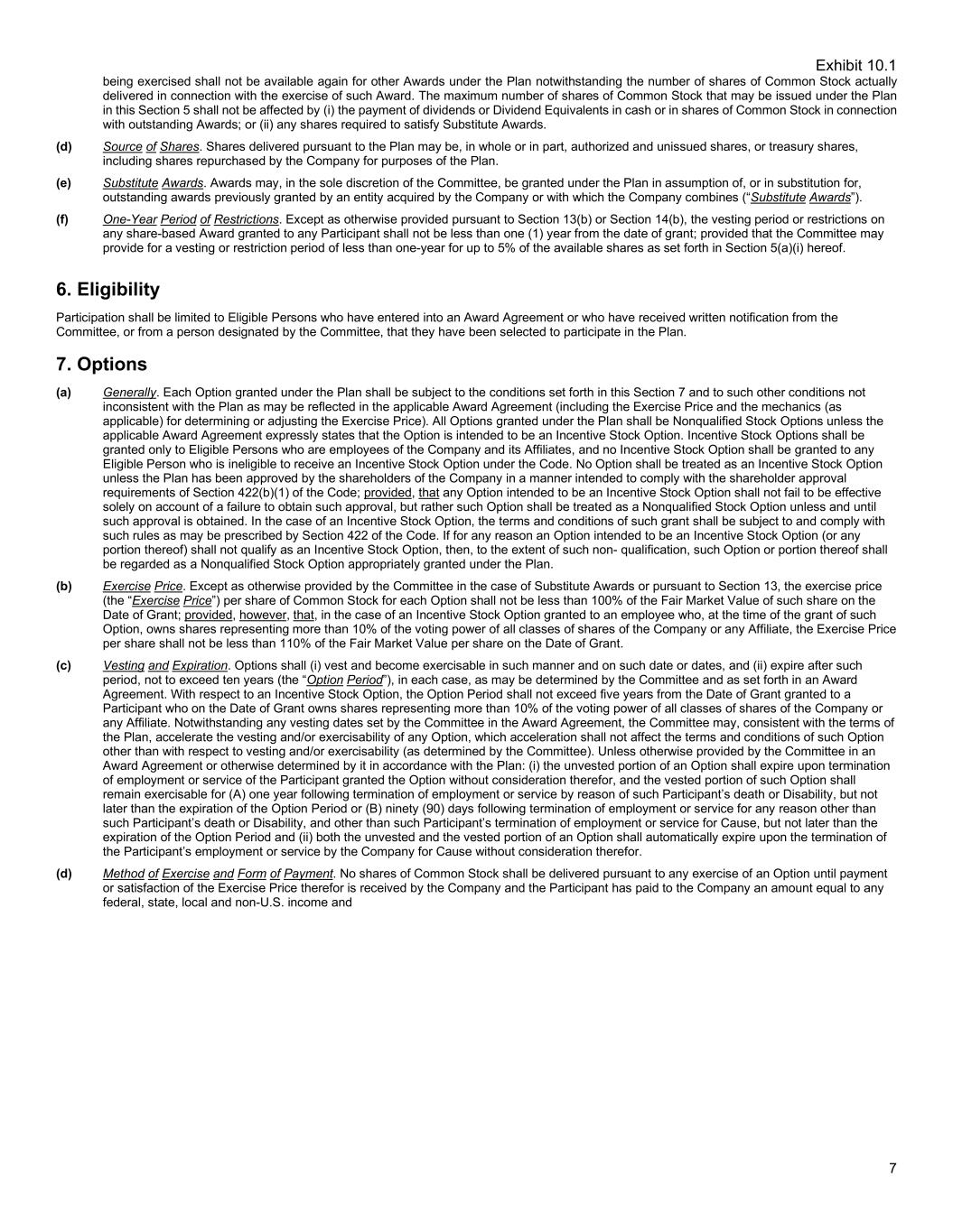 Exhibit 10.1 7 being exercised shall not be available again for other Awards under the Plan notwithstanding the number of shares of Common Stock actually delivered in connection with the exercise of such Award. The maximum number of shares of Common Stock that may be issued under the Plan in this Section 5 shall not be affected by (i) the payment of dividends or Dividend Equivalents in cash or in shares of Common Stock in connection with outstanding Awards; or (ii) any shares required to satisfy Substitute Awards. (d) Source of Shares. Shares delivered pursuant to the Plan may be, in whole or in part, authorized and unissued shares, or treasury shares, including shares repurchased by the Company for purposes of the Plan. (e) Substitute Awards. Awards may, in the sole discretion of the Committee, be granted under the Plan in assumption of, or in substitution for, outstanding awards previously granted by an entity acquired by the Company or with which the Company combines (“Substitute Awards”). (f) One-Year Period of Restrictions. Except as otherwise provided pursuant to Section 13(b) or Section 14(b), the vesting period or restrictions on any share-based Award granted to any Participant shall not be less than one (1) year from the date of grant; provided that the Committee may provide for a vesting or restriction period of less than one-year for up to 5% of the available shares as set forth in Section 5(a)(i) hereof. 6. Eligibility Participation shall be limited to Eligible Persons who have entered into an Award Agreement or who have received written notification from the Committee, or from a person designated by the Committee, that they have been selected to participate in the Plan. 7. Options (a) Generally. Each Option granted under the Plan shall be subject to the conditions set forth in this Section 7 and to such other conditions not inconsistent with the Plan as may be reflected in the applicable Award Agreement (including the Exercise Price and the mechanics (as applicable) for determining or adjusting the Exercise Price). All Options granted under the Plan shall be Nonqualified Stock Options unless the applicable Award Agreement expressly states that the Option is intended to be an Incentive Stock Option. Incentive Stock Options shall be granted only to Eligible Persons who are employees of the Company and its Affiliates, and no Incentive Stock Option shall be granted to any Eligible Person who is ineligible to receive an Incentive Stock Option under the Code. No Option shall be treated as an Incentive Stock Option unless the Plan has been approved by the shareholders of the Company in a manner intended to comply with the shareholder approval requirements of Section 422(b)(1) of the Code; provided, that any Option intended to be an Incentive Stock Option shall not fail to be effective solely on account of a failure to obtain such approval, but rather such Option shall be treated as a Nonqualified Stock Option unless and until such approval is obtained. In the case of an Incentive Stock Option, the terms and conditions of such grant shall be subject to and comply with such rules as may be prescribed by Section 422 of the Code. If for any reason an Option intended to be an Incentive Stock Option (or any portion thereof) shall not qualify as an Incentive Stock Option, then, to the extent of such non- qualification, such Option or portion thereof shall be regarded as a Nonqualified Stock Option appropriately granted under the Plan. (b) Exercise Price. Except as otherwise provided by the Committee in the case of Substitute Awards or pursuant to Section 13, the exercise price (the “Exercise Price”) per share of Common Stock for each Option shall not be less than 100% of the Fair Market Value of such share on the Date of Grant; provided, however, that, in the case of an Incentive Stock Option granted to an employee who, at the time of the grant of such Option, owns shares representing more than 10% of the voting power of all classes of shares of the Company or any Affiliate, the Exercise Price per share shall not be less than 110% of the Fair Market Value per share on the Date of Grant. (c) Vesting and Expiration. Options shall (i) vest and become exercisable in such manner and on such date or dates, and (ii) expire after such period, not to exceed ten years (the “Option Period”), in each case, as may be determined by the Committee and as set forth in an Award Agreement. With respect to an Incentive Stock Option, the Option Period shall not exceed five years from the Date of Grant granted to a Participant who on the Date of Grant owns shares representing more than 10% of the voting power of all classes of shares of the Company or any Affiliate. Notwithstanding any vesting dates set by the Committee in the Award Agreement, the Committee may, consistent with the terms of the Plan, accelerate the vesting and/or exercisability of any Option, which acceleration shall not affect the terms and conditions of such Option other than with respect to vesting and/or exercisability (as determined by the Committee). Unless otherwise provided by the Committee in an Award Agreement or otherwise determined by it in accordance with the Plan: (i) the unvested portion of an Option shall expire upon termination of employment or service of the Participant granted the Option without consideration therefor, and the vested portion of such Option shall remain exercisable for (A) one year following termination of employment or service by reason of such Participant’s death or Disability, but not later than the expiration of the Option Period or (B) ninety (90) days following termination of employment or service for any reason other than such Participant’s death or Disability, and other than such Participant’s termination of employment or service for Cause, but not later than the expiration of the Option Period and (ii) both the unvested and the vested portion of an Option shall automatically expire 