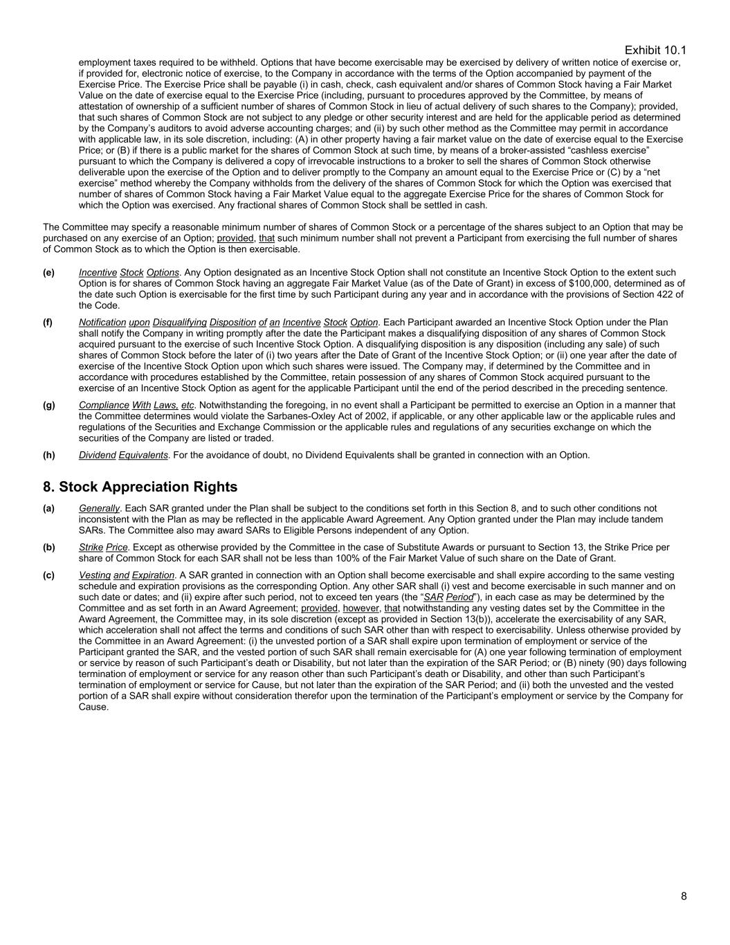 Exhibit 10.1 8 employment taxes required to be withheld. Options that have become exercisable may be exercised by delivery of written notice of exercise or, if provided for, electronic notice of exercise, to the Company in accordance with the terms of the Option accompanied by payment of the Exercise Price. The Exercise Price shall be payable (i) in cash, check, cash equivalent and/or shares of Common Stock having a Fair Market Value on the date of exercise equal to the Exercise Price (including, pursuant to procedures approved by the Committee, by means of attestation of ownership of a sufficient number of shares of Common Stock in lieu of actual delivery of such shares to the Company); provided, that such shares of Common Stock are not subject to any pledge or other security interest and are held for the applicable period as determined by the Company’s auditors to avoid adverse accounting charges; and (ii) by such other method as the Committee may permit in accordance with applicable law, in its sole discretion, including: (A) in other property having a fair market value on the date of exercise equal to the Exercise Price; or (B) if there is a public market for the shares of Common Stock at such time, by means of a broker-assisted “cashless exercise” pursuant to which the Company is delivered a copy of irrevocable instructions to a broker to sell the shares of Common Stock otherwise deliverable upon the exercise of the Option and to deliver promptly to the Company an amount equal to the Exercise Price or (C) by a “net exercise” method whereby the Company withholds from the delivery of the shares of Common Stock for which the Option was exercised that number of shares of Common Stock having a Fair Market Value equal to the aggregate Exercise Price for the shares of Common Stock for which the Option was exercised. Any fractional shares of Common Stock shall be settled in cash. The Committee may specify a reasonable minimum number of shares of Common Stock or a percentage of the shares subject to an Option that may be purchased on any exercise of an Option; provided, that such minimum number shall not prevent a Participant from exercising the full number of shares of Common Stock as to which the Option is then exercisable. (e) Incentive Stock Options. Any Option designated as an Incentive Stock Option shall not constitute an Incentive Stock Option to the extent such Option is for shares of Common Stock having an aggregate Fair Market Value (as of the Date of Grant) in excess of $100,000, determined as of the date such Option is exercisable for the first time by such Participant during any year and in accordance with the provisions of Section 422 of the Code. (f) Notification upon Disqualifying Disposition of an Incentive Stock Option. Each Participant awarded an Incentive Stock Option under the Plan shall notify the Company in writing promptly after the date the Participant makes a disqualifying disposition of any shares of Common Stock acquired pursuant to the exercise of such Incentive Stock Option. A disqualifying disposition is any disposition (including any sale) of such shares of Common Stock before the later of (i) two years after the Date of Grant of the Incentive Stock Option; or (ii) one year after the date of exercise of the Incentive Stock Option upon which such shares were issued. The Company may, if determined by the Committee and in accordance with procedures established by the Committee, retain possession of any shares of Common Stock acquired pursuant to the exercise of an Incentive Stock Option as agent for the applicable Participant until the end of the period described in the preceding sentence. (g) Compliance With Laws, etc. Notwithstanding the foregoing, in no event shall a Participant be permitted to exercise an Option in a manner that the Committee determines would violate the Sarbanes-Oxley Act of 2002, if applicable, or any other applicable law or the applicable rules and regulations of the Securities and Exchange Commission or the applicable rules and regulations of any securities exchange on which the securities of the Company are listed or traded. (h) Dividend Equivalents. For the avoidance of doubt, no Dividend Equivalents shall be granted in connection with an Option. 8. Stock Appreciation Rights (a) Generally. Each SAR granted under the Plan shall be subject to the conditions set forth in this Section 8, and to such other conditions not inconsistent with the Plan as may be reflected in the applicable Award Agreement. Any Option granted under the Plan may include tandem SARs. The Committee also may award SARs to Eligible Persons independent of any Option. (b) Strike Price. Except as otherwise provided by the Committee in the case of Substitute Awards or pursuant to Section 13, the Strike Price per share of Common Stock for each SAR shall not be less than 100% of the Fair Market Value of such share on the Date of Grant. (c) Vesting and Expiration. A SAR granted in connection with an Option shall become exercisable and shall expire according to the same vesting schedule and expiration provisions as the corresponding Option. Any other SAR shall (i) vest and become exercisable in such manner and on such date or dates; and (ii) expire after such period, not to exceed ten years (the “SAR Period”), in each case as may be determined by the Committee and as set forth in an Award Agreement; provided, however, that notwithstanding any vesting dates set by the Committee in the Award Agreement, the Committee may, in its sole discretion (except as provided in Section 13(b)), accelerate the exercisability of any SAR, which acceleration shall not affect the terms and conditions of such SAR other than with respect to exercisability. Unless otherwise provided by the Committee in an Award Agreement: (i) the unvested portion of a SAR shall expire upon termination of employment or service of the Participant granted the SAR, and the vested portion of such SAR shall 