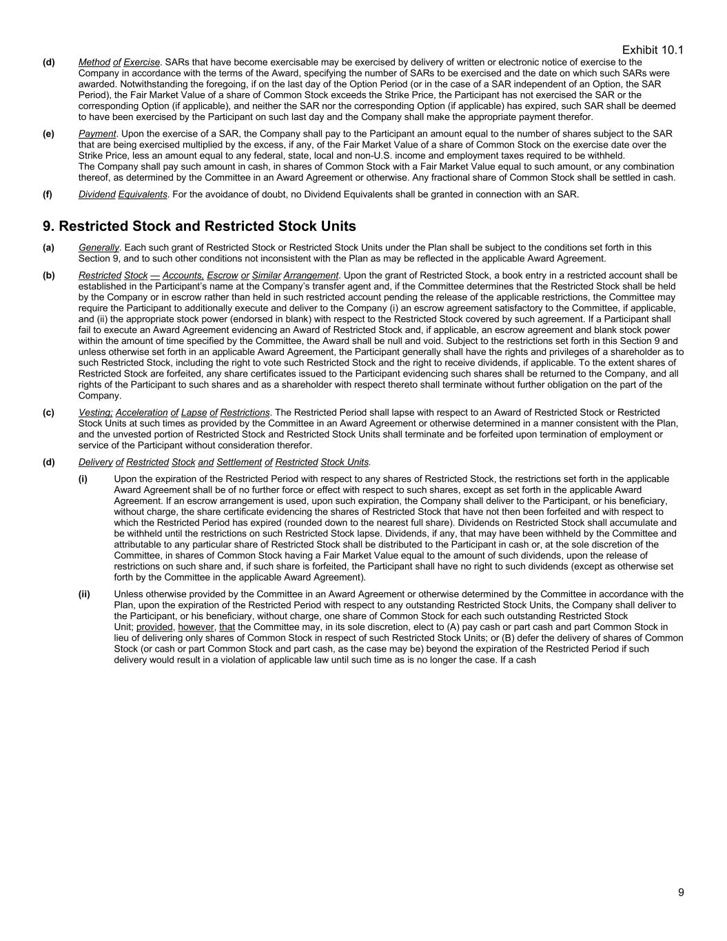 Exhibit 10.1 9 (d) Method of Exercise. SARs that have become exercisable may be exercised by delivery of written or electronic notice of exercise to the Company in accordance with the terms of the Award, specifying the number of SARs to be exercised and the date on which such SARs were awarded. Notwithstanding the foregoing, if on the last day of the Option Period (or in the case of a SAR independent of an Option, the SAR Period), the Fair Market Value of a share of Common Stock exceeds the Strike Price, the Participant has not exercised the SAR or the corresponding Option (if applicable), and neither the SAR nor the corresponding Option (if applicable) has expired, such SAR shall be deemed to have been exercised by the Participant on such last day and the Company shall make the appropriate payment therefor. (e) Payment. Upon the exercise of a SAR, the Company shall pay to the Participant an amount equal to the number of shares subject to the SAR that are being exercised multiplied by the excess, if any, of the Fair Market Value of a share of Common Stock on the exercise date over the Strike Price, less an amount equal to any federal, state, local and non-U.S. income and employment taxes required to be withheld. The Company shall pay such amount in cash, in shares of Common Stock with a Fair Market Value equal to such amount, or any combination thereof, as determined by the Committee in an Award Agreement or otherwise. Any fractional share of Common Stock shall be settled in cash. (f) Dividend Equivalents. For the avoidance of doubt, no Dividend Equivalents shall be granted in connection with an SAR. 9. Restricted Stock and Restricted Stock Units (a) Generally. Each such grant of Restricted Stock or Restricted Stock Units under the Plan shall be subject to the conditions set forth in this Section 9, and to such other conditions not inconsistent with the Plan as may be reflected in the applicable Award Agreement. (b) Restricted Stock — Accounts, Escrow or Similar Arrangement. Upon the grant of Restricted Stock, a book entry in a restricted account shall be established in the Participant’s name at the Company’s transfer agent and, if the Committee determines that the Restricted Stock shall be held by the Company or in escrow rather than held in such restricted account pending the release of the applicable restrictions, the Committee may require the Participant to additionally execute and deliver to the Company (i) an escrow agreement satisfactory to the Committee, if applicable, and (ii) the appropriate stock power (endorsed in blank) with respect to the Restricted Stock covered by such agreement. If a Participant shall fail to execute an Award Agreement evidencing an Award of Restricted Stock and, if applicable, an escrow agreement and blank stock power within the amount of time specified by the Committee, the Award shall be null and void. Subject to the restrictions set forth in this Section 9 and unless otherwise set forth in an applicable Award Agreement, the Participant generally shall have the rights and privileges of a shareholder as to such Restricted Stock, including the right to vote such Restricted Stock and the right to receive dividends, if applicable. To the extent shares of Restricted Stock are forfeited, any share certificates issued to the Participant evidencing such shares shall be returned to the Company, and all rights of the Participant to such shares and as a shareholder with respect thereto shall terminate without further obligation on the part of the Company. (c) Vesting; Acceleration of Lapse of Restrictions. The Restricted Period shall lapse with respect to an Award of Restricted Stock or Restricted Stock Units at such times as provided by the Committee in an Award Agreement or otherwise determined in a manner consistent with the Plan, and the unvested portion of Restricted Stock and Restricted Stock Units shall terminate and be forfeited upon termination of employment or service of the Participant without consideration therefor. (d) Delivery of Restricted Stock and Settlement of Restricted Stock Units. (i) Upon the expiration of the Restricted Period with respect to any shares of Restricted Stock, the restrictions set forth in the applicable Award Agreement shall be of no further force or effect with respect to such shares, except as set forth in the applicable Award Agreement. If an escrow arrangement is used, upon such expiration, the Company shall deliver to the Participant, or his beneficiary, without charge, the share certificate evidencing the shares of Restricted Stock that have not then been forfeited and with respect to which the Restricted Period has expired (rounded down to the nearest full share). Dividends on Restricted Stock shall accumulate and be withheld until the restrictions on such Restricted Stock lapse. Dividends, if any, that may have been withheld by the Committee and attributable to any particular share of Restricted Stock shall be distributed to the Participant in cash or, at the sole discretion of the Committee, in shares of Common Stock having a Fair Market Value equal to the amount of such dividends, upon the release of restrictions on such share and, if such share is forfeited, the Participant shall have no right to such dividends (except as otherwise set forth by the Committee in the applicable Award Agreement). (ii) Unless otherwise provided by the Committee in an Award Agreement or otherwise determined by the Committee in accordance with the Plan, upon the expiration of the Restricted Period with respect to any outstanding Restricted Stock Units, the Company shall deliver to the Participant, or his beneficiary, without charge, one share of Common Stock for each such outstanding Restricted Stock Unit; provided, however, that the Committee may, in its sole discretion, elect to (A) pay cash or part cash and part Common Stock in lieu of delivering only shares of Common Stock in respect of such Restricted Stock Units; or (B) defe
