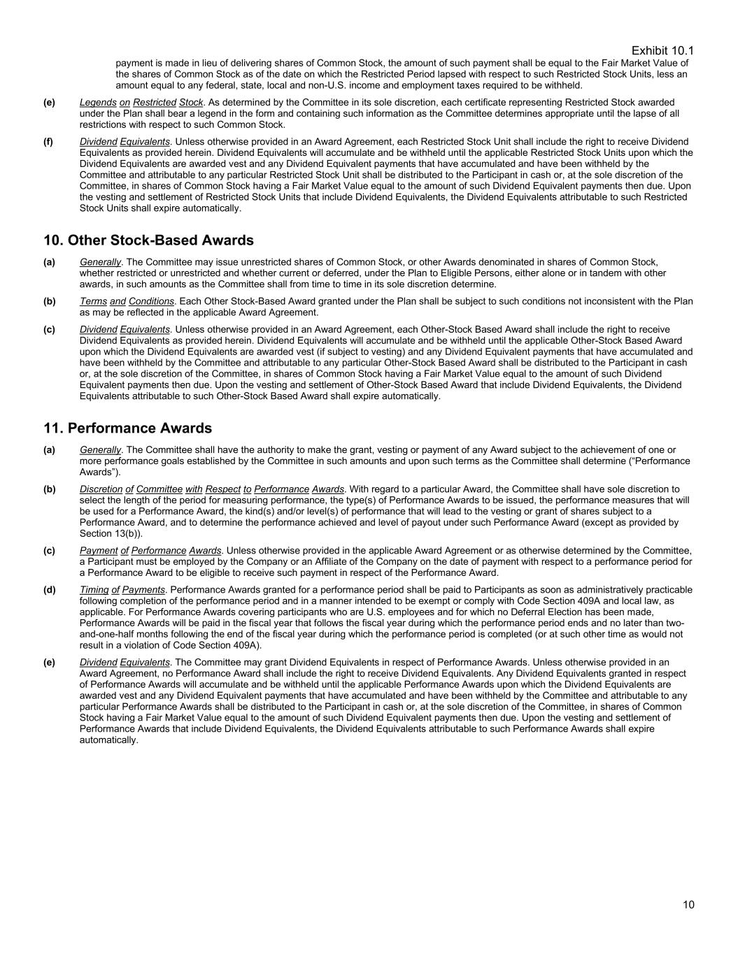 Exhibit 10.1 10 payment is made in lieu of delivering shares of Common Stock, the amount of such payment shall be equal to the Fair Market Value of the shares of Common Stock as of the date on which the Restricted Period lapsed with respect to such Restricted Stock Units, less an amount equal to any federal, state, local and non-U.S. income and employment taxes required to be withheld. (e) Legends on Restricted Stock. As determined by the Committee in its sole discretion, each certificate representing Restricted Stock awarded under the Plan shall bear a legend in the form and containing such information as the Committee determines appropriate until the lapse of all restrictions with respect to such Common Stock. (f) Dividend Equivalents. Unless otherwise provided in an Award Agreement, each Restricted Stock Unit shall include the right to receive Dividend Equivalents as provided herein. Dividend Equivalents will accumulate and be withheld until the applicable Restricted Stock Units upon which the Dividend Equivalents are awarded vest and any Dividend Equivalent payments that have accumulated and have been withheld by the Committee and attributable to any particular Restricted Stock Unit shall be distributed to the Participant in cash or, at the sole discretion of the Committee, in shares of Common Stock having a Fair Market Value equal to the amount of such Dividend Equivalent payments then due. Upon the vesting and settlement of Restricted Stock Units that include Dividend Equivalents, the Dividend Equivalents attributable to such Restricted Stock Units shall expire automatically. 10. Other Stock-Based Awards (a) Generally. The Committee may issue unrestricted shares of Common Stock, or other Awards denominated in shares of Common Stock, whether restricted or unrestricted and whether current or deferred, under the Plan to Eligible Persons, either alone or in tandem with other awards, in such amounts as the Committee shall from time to time in its sole discretion determine. (b) Terms and Conditions. Each Other Stock-Based Award granted under the Plan shall be subject to such conditions not inconsistent with the Plan as may be reflected in the applicable Award Agreement. (c) Dividend Equivalents. Unless otherwise provided in an Award Agreement, each Other-Stock Based Award shall include the right to receive Dividend Equivalents as provided herein. Dividend Equivalents will accumulate and be withheld until the applicable Other-Stock Based Award upon which the Dividend Equivalents are awarded vest (if subject to vesting) and any Dividend Equivalent payments that have accumulated and have been withheld by the Committee and attributable to any particular Other-Stock Based Award shall be distributed to the Participant in cash or, at the sole discretion of the Committee, in shares of Common Stock having a Fair Market Value equal to the amount of such Dividend Equivalent payments then due. Upon the vesting and settlement of Other-Stock Based Award that include Dividend Equivalents, the Dividend Equivalents attributable to such Other-Stock Based Award shall expire automatically. 11. Performance Awards (a) Generally. The Committee shall have the authority to make the grant, vesting or payment of any Award subject to the achievement of one or more performance goals established by the Committee in such amounts and upon such terms as the Committee shall determine (“Performance Awards”). (b) Discretion of Committee with Respect to Performance Awards. With regard to a particular Award, the Committee shall have sole discretion to select the length of the period for measuring performance, the type(s) of Performance Awards to be issued, the performance measures that will be used for a Performance Award, the kind(s) and/or level(s) of performance that will lead to the vesting or grant of shares subject to a Performance Award, and to determine the performance achieved and level of payout under such Performance Award (except as provided by Section 13(b)). (c) Payment of Performance Awards. Unless otherwise provided in the applicable Award Agreement or as otherwise determined by the Committee, a Participant must be employed by the Company or an Affiliate of the Company on the date of payment with respect to a performance period for a Performance Award to be eligible to receive such payment in respect of the Performance Award. (d) Timing of Payments. Performance Awards granted for a performance period shall be paid to Participants as soon as administratively practicable following completion of the performance period and in a manner intended to be exempt or comply with Code Section 409A and local law, as applicable. For Performance Awards covering participants who are U.S. employees and for which no Deferral Election has been made, Performance Awards will be paid in the fiscal year that follows the fiscal year during which the performance period ends and no later than two- and-one-half months following the end of the fiscal year during which the performance period is completed (or at such other time as would not result in a violation of Code Section 409A). (e) Dividend Equivalents. The Committee may grant Dividend Equivalents in respect of Performance Awards. Unless otherwise provided in an Award Agreement, no Performance Award shall include the right to receive Dividend Equivalents. Any Dividend Equivalents granted in respect of Performance Awards will accumulate and be withheld until the applicable Performance Awards upon which the Dividend Equivalents are awarded vest and any Dividend Equivalent payments that have accumulated and have been withheld by the Committee and attributable to any particular Performance Awards shall be distributed to the Participant in cash or, at the sole discretion of the Committee, in shares of Common Stock having a Fair Market Value equal to the amount of such Dividend Equivalent payments then due. Upon the vesting and settlement of Performance Awards that include Dividend Eq