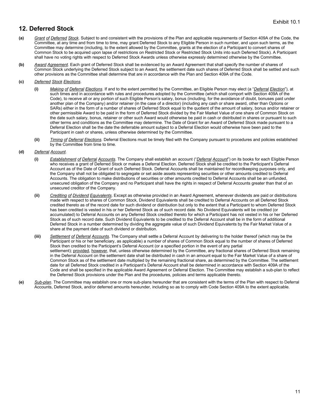 Exhibit 10.1 11 12. Deferred Stock (a) Grant of Deferred Stock. Subject to and consistent with the provisions of the Plan and applicable requirements of Section 409A of the Code, the Committee, at any time and from time to time, may grant Deferred Stock to any Eligible Person in such number, and upon such terms, as the Committee may determine (including, to the extent allowed by the Committee, grants at the election of a Participant to convert shares of Common Stock to be acquired upon lapse of restrictions on Restricted Stock or Restricted Stock Units into such Deferred Stock). A Participant shall have no voting rights with respect to Deferred Stock Awards unless otherwise expressly determined otherwise by the Committee. (b) Award Agreement. Each grant of Deferred Stock shall be evidenced by an Award Agreement that shall specify the number of shares of Common Stock underlying the Deferred Stock subject to an Award, the settlement date such shares of Deferred Stock shall be settled and such other provisions as the Committee shall determine that are in accordance with the Plan and Section 409A of the Code. (c) Deferred Stock Elections. (i) Making of Deferral Elections. If and to the extent permitted by the Committee, an Eligible Person may elect (a “Deferral Election”), at such times and in accordance with rules and procedures adopted by the Committee (which shall comport with Section 409A of the Code), to receive all or any portion of such Eligible Person’s salary, bonus (including, for the avoidance of doubt, bonuses paid under another plan of the Company) and/or retainer (in the case of a director) (including any cash or share award, other than Options or SARs) either in the form of a number of shares of Deferred Stock equal to the quotient of the amount of salary, bonus and/or retainer or other permissible Award to be paid in the form of Deferred Stock divided by the Fair Market Value of one share of Common Stock on the date such salary, bonus, retainer or other such Award would otherwise be paid in cash or distributed in shares or pursuant to such other terms and conditions as the Committee may determine. The Date of Grant for an Award of Deferred Stock made pursuant to a Deferral Election shall be the date the deferrable amount subject to a Deferral Election would otherwise have been paid to the Participant in cash or shares, unless otherwise determined by the Committee. (ii) Timing of Deferral Elections. Deferral Elections must be timely filed with the Company pursuant to procedures and policies established by the Committee from time to time. (d) Deferral Account. (i) Establishment of Deferral Accounts. The Company shall establish an account (“Deferral Account”) on its books for each Eligible Person who receives a grant of Deferred Stock or makes a Deferral Election. Deferred Stock shall be credited to the Participant’s Deferral Account as of the Date of Grant of such Deferred Stock. Deferral Accounts shall be maintained for recordkeeping purposes only, and the Company shall not be obligated to segregate or set aside assets representing securities or other amounts credited to Deferral Accounts. The obligation to make distributions of securities or other amounts credited to Deferral Accounts shall be an unfunded, unsecured obligation of the Company and no Participant shall have the rights in respect of Deferral Accounts greater than that of an unsecured creditor of the Company. (ii) Crediting of Dividend Equivalents. Except as otherwise provided in an Award Agreement, whenever dividends are paid or distributions made with respect to shares of Common Stock, Dividend Equivalents shall be credited to Deferral Accounts on all Deferred Stock credited thereto as of the record date for such dividend or distribution but only to the extent that a Participant to whom Deferred Stock has been credited is vested in his or her Deferred Stock as of such record date. No Dividend Equivalents will be credited (or accumulated) to Deferral Accounts on any Deferred Stock credited thereto for which a Participant has not vested in his or her Deferred Stock as of such record date. Such Dividend Equivalents to be credited to the Deferral Account shall be in the form of additional Deferred Stock in a number determined by dividing the aggregate value of such Dividend Equivalents by the Fair Market Value of a share at the payment date of such dividend or distribution. (iii) Settlement of Deferral Accounts. The Company shall settle a Deferral Account by delivering to the holder thereof (which may be the Participant or his or her beneficiary, as applicable) a number of shares of Common Stock equal to the number of shares of Deferred Stock then credited to the Participant’s Deferral Account (or a specified portion in the event of any partial settlement); provided, however, that, unless otherwise determined by the Committee, any fractional shares of Deferred Stock remaining in the Deferral Account on the settlement date shall be distributed in cash in an amount equal to the Fair Market Value of a share of Common Stock as of the settlement date multiplied by the remaining fractional share, as determined by the Committee. The settlement date for all Deferred Stock credited in a Participant’s Deferral Account shall be determined in accordance with Section 409A of the Code and shall be specified in the applicable Award Agreement or Deferral Election. The Committee may establish a sub-plan to reflect the Deferred Stock provisions under the Plan and the procedures, policies and terms applicable thereto. (e) Sub-plan. The Committee may establish one or more sub-plans hereunder that are consistent with the terms of the Plan with respect to Deferral Accounts, Deferred Stock, and/or deferred amounts hereunder, including so as to comply with Code Section 409A to the extent applicable.