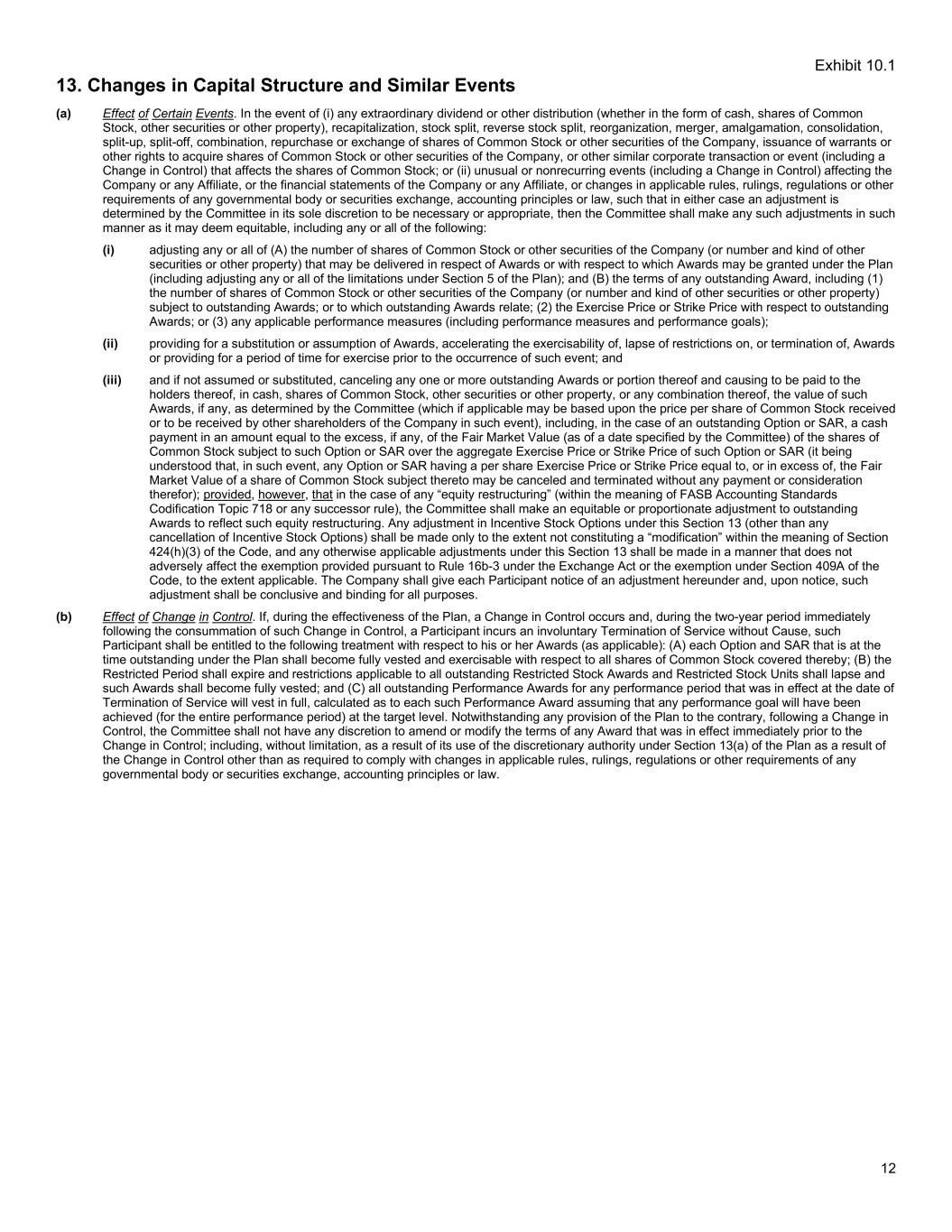 Exhibit 10.1 12 13. Changes in Capital Structure and Similar Events (a) Effect of Certain Events. In the event of (i) any extraordinary dividend or other distribution (whether in the form of cash, shares of Common Stock, other securities or other property), recapitalization, stock split, reverse stock split, reorganization, merger, amalgamation, consolidation, split-up, split-off, combination, repurchase or exchange of shares of Common Stock or other securities of the Company, issuance of warrants or other rights to acquire shares of Common Stock or other securities of the Company, or other similar corporate transaction or event (including a Change in Control) that affects the shares of Common Stock; or (ii) unusual or nonrecurring events (including a Change in Control) affecting the Company or any Affiliate, or the financial statements of the Company or any Affiliate, or changes in applicable rules, rulings, regulations or other requirements of any governmental body or securities exchange, accounting principles or law, such that in either case an adjustment is determined by the Committee in its sole discretion to be necessary or appropriate, then the Committee shall make any such adjustments in such manner as it may deem equitable, including any or all of the following: (i) adjusting any or all of (A) the number of shares of Common Stock or other securities of the Company (or number and kind of other securities or other property) that may be delivered in respect of Awards or with respect to which Awards may be granted under the Plan (including adjusting any or all of the limitations under Section 5 of the Plan); and (B) the terms of any outstanding Award, including (1) the number of shares of Common Stock or other securities of the Company (or number and kind of other securities or other property) subject to outstanding Awards; or to which outstanding Awards relate; (2) the Exercise Price or Strike Price with respect to outstanding Awards; or (3) any applicable performance measures (including performance measures and performance goals); (ii) providing for a substitution or assumption of Awards, accelerating the exercisability of, lapse of restrictions on, or termination of, Awards or providing for a period of time for exercise prior to the occurrence of such event; and (iii) and if not assumed or substituted, canceling any one or more outstanding Awards or portion thereof and causing to be paid to the holders thereof, in cash, shares of Common Stock, other securities or other property, or any combination thereof, the value of such Awards, if any, as determined by the Committee (which if applicable may be based upon the price per share of Common Stock received or to be received by other shareholders of the Company in such event), including, in the case of an outstanding Option or SAR, a cash payment in an amount equal to the excess, if any, of the Fair Market Value (as of a date specified by the Committee) of the shares of Common Stock subject to such Option or SAR over the aggregate Exercise Price or Strike Price of such Option or SAR (it being understood that, in such event, any Option or SAR having a per share Exercise Price or Strike Price equal to, or in excess of, the Fair Market Value of a share of Common Stock subject thereto may be canceled and terminated without any payment or consideration therefor); provided, however, that in the case of any “equity restructuring” (within the meaning of FASB Accounting Standards Codification Topic 718 or any successor rule), the Committee shall make an equitable or proportionate adjustment to outstanding Awards to reflect such equity restructuring. Any adjustment in Incentive Stock Options under this Section 13 (other than any cancellation of Incentive Stock Options) shall be made only to the extent not constituting a “modification” within the meaning of Section 424(h)(3) of the Code, and any otherwise applicable adjustments under this Section 13 shall be made in a manner that does not adversely affect the exemption provided pursuant to Rule 16b-3 under the Exchange Act or the exemption under Section 409A of the Code, to the extent applicable. The Company shall give each Participant notice of an adjustment hereunder and, upon notice, such adjustment shall be conclusive and binding for all purposes. (b) Effect of Change in Control. If, during the effectiveness of the Plan, a Change in Control occurs and, during the two-year period immediately following the consummation of such Change in Control, a Participant incurs an involuntary Termination of Service without Cause, such Participant shall be entitled to the following treatment with respect to his or her Awards (as applicable): (A) each Option and SAR that is at the time outstanding under the Plan shall become fully vested and exercisable with respect to all shares of Common Stock covered thereby; (B) the Restricted Period shall expire and restrictions applicable to all outstanding Restricted Stock Awards and Restricted Stock Units shall lapse and such Awards shall become fully vested; and (C) all outstanding Performance Awards for any performance period that was in effect at the date of Termination of Service will vest in full, calculated as to each such Performance Award assuming that any performance goal will have been achieved (for the entire performance period) at the target level. Notwithstanding any provision of the Plan to the contrary, following a Change in Control, the Committee shall not have any discretion to amend or modify the terms of any Award that was in effect immediately prior to the Change in Control; including, without limitation, as a result of its use of the discretionary authority under Section 13(a) of the Plan as a result of the Change in Control other than as required to comply with changes in applicable rules, rulings, regulations or other requirements of any governmental body or securities exchange, accounting principles or law.