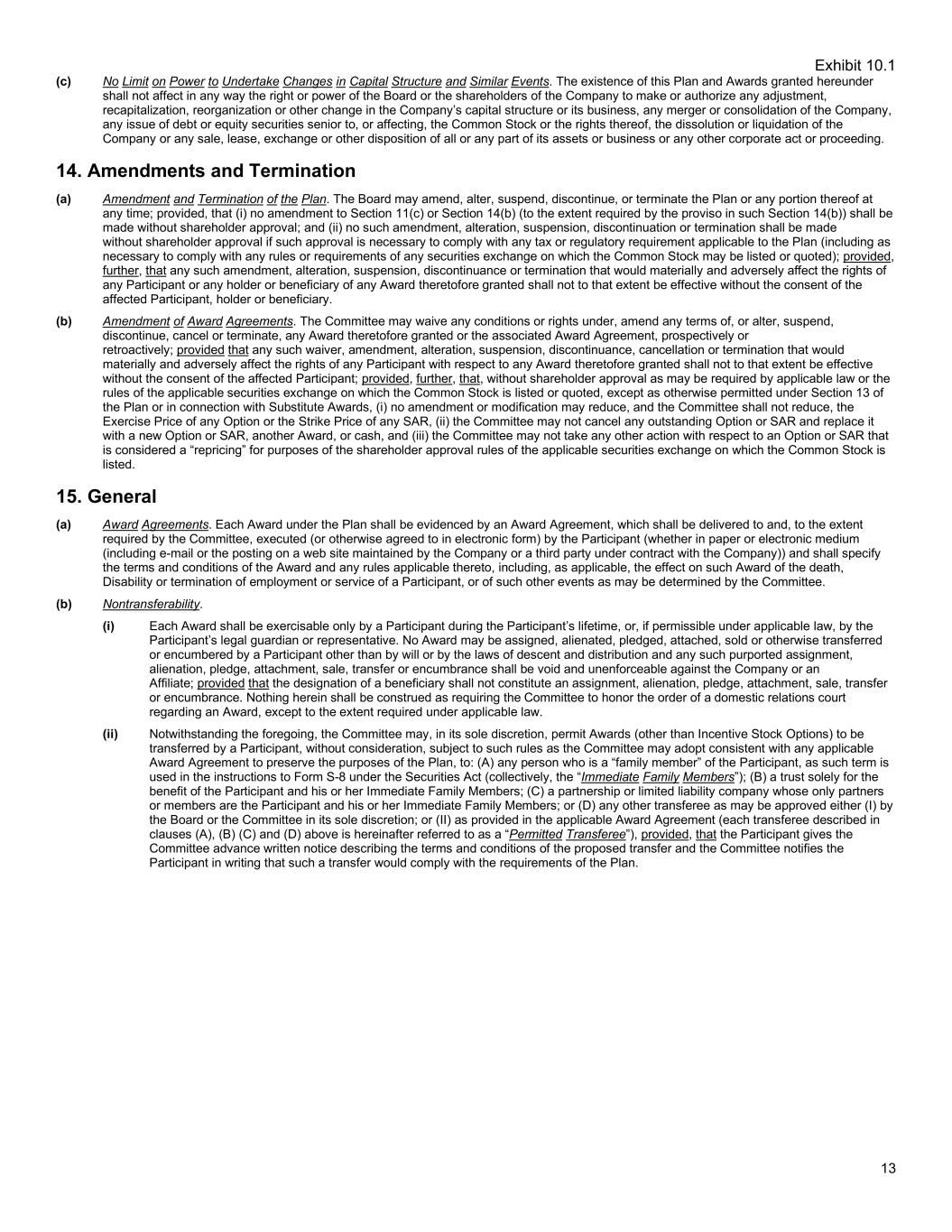 Exhibit 10.1 13 (c) No Limit on Power to Undertake Changes in Capital Structure and Similar Events. The existence of this Plan and Awards granted hereunder shall not affect in any way the right or power of the Board or the shareholders of the Company to make or authorize any adjustment, recapitalization, reorganization or other change in the Company’s capital structure or its business, any merger or consolidation of the Company, any issue of debt or equity securities senior to, or affecting, the Common Stock or the rights thereof, the dissolution or liquidation of the Company or any sale, lease, exchange or other disposition of all or any part of its assets or business or any other corporate act or proceeding. 14. Amendments and Termination (a) Amendment and Termination of the Plan. The Board may amend, alter, suspend, discontinue, or terminate the Plan or any portion thereof at any time; provided, that (i) no amendment to Section 11(c) or Section 14(b) (to the extent required by the proviso in such Section 14(b)) shall be made without shareholder approval; and (ii) no such amendment, alteration, suspension, discontinuation or termination shall be made without shareholder approval if such approval is necessary to comply with any tax or regulatory requirement applicable to the Plan (including as necessary to comply with any rules or requirements of any securities exchange on which the Common Stock may be listed or quoted); provided, further, that any such amendment, alteration, suspension, discontinuance or termination that would materially and adversely affect the rights of any Participant or any holder or beneficiary of any Award theretofore granted shall not to that extent be effective without the consent of the affected Participant, holder or beneficiary. (b) Amendment of Award Agreements. The Committee may waive any conditions or rights under, amend any terms of, or alter, suspend, discontinue, cancel or terminate, any Award theretofore granted or the associated Award Agreement, prospectively or retroactively; provided that any such waiver, amendment, alteration, suspension, discontinuance, cancellation or termination that would materially and adversely affect the rights of any Participant with respect to any Award theretofore granted shall not to that extent be effective without the consent of the affected Participant; provided, further, that, without shareholder approval as may be required by applicable law or the rules of the applicable securities exchange on which the Common Stock is listed or quoted, except as otherwise permitted under Section 13 of the Plan or in connection with Substitute Awards, (i) no amendment or modification may reduce, and the Committee shall not reduce, the Exercise Price of any Option or the Strike Price of any SAR, (ii) the Committee may not cancel any outstanding Option or SAR and replace it with a new Option or SAR, another Award, or cash, and (iii) the Committee may not take any other action with respect to an Option or SAR that is considered a “repricing” for purposes of the shareholder approval rules of the applicable securities exchange on which the Common Stock is listed. 15. General (a) Award Agreements. Each Award under the Plan shall be evidenced by an Award Agreement, which shall be delivered to and, to the extent required by the Committee, executed (or otherwise agreed to in electronic form) by the Participant (whether in paper or electronic medium (including e-mail or the posting on a web site maintained by the Company or a third party under contract with the Company)) and shall specify the terms and conditions of the Award and any rules applicable thereto, including, as applicable, the effect on such Award of the death, Disability or termination of employment or service of a Participant, or of such other events as may be determined by the Committee. (b) Nontransferability. (i) Each Award shall be exercisable only by a Participant during the Participant’s lifetime, or, if permissible under applicable law, by the Participant’s legal guardian or representative. No Award may be assigned, alienated, pledged, attached, sold or otherwise transferred or encumbered by a Participant other than by will or by the laws of descent and distribution and any such purported assignment, alienation, pledge, attachment, sale, transfer or encumbrance shall be void and unenforceable against the Company or an Affiliate; provided that the designation of a beneficiary shall not constitute an assignment, alienation, pledge, attachment, sale, transfer or encumbrance. Nothing herein shall be construed as requiring the Committee to honor the order of a domestic relations court regarding an Award, except to the extent required under applicable law. (ii) Notwithstanding the foregoing, the Committee may, in its sole discretion, permit Awards (other than Incentive Stock Options) to be transferred by a Participant, without consideration, subject to such rules as the Committee may adopt consistent with any applicable Award Agreement to preserve the purposes of the Plan, to: (A) any person who is a “family member” of the Participant, as such term is used in the instructions to Form S-8 under the Securities Act (collectively, the “Immediate Family Members”); (B) a trust solely for the benefit of the Participant and his or her Immediate Family Members; (C) a partnership or limited liability company whose only partners or members are the Participant and his or her Immediate Family Members; or (D) any other transferee as may be approved either (I) by the Board or the Committee in its sole discretion; or (II) as provided in the applicable Award Agreement (each transferee described in clauses (A), (B) (C) and (D) above is hereinafter referred to as a “Permitted Transferee”), provided, that the Participant gives the Committee advance written notice describing the terms and conditions of the proposed transfer and the Committee notifies the Participant in writin
