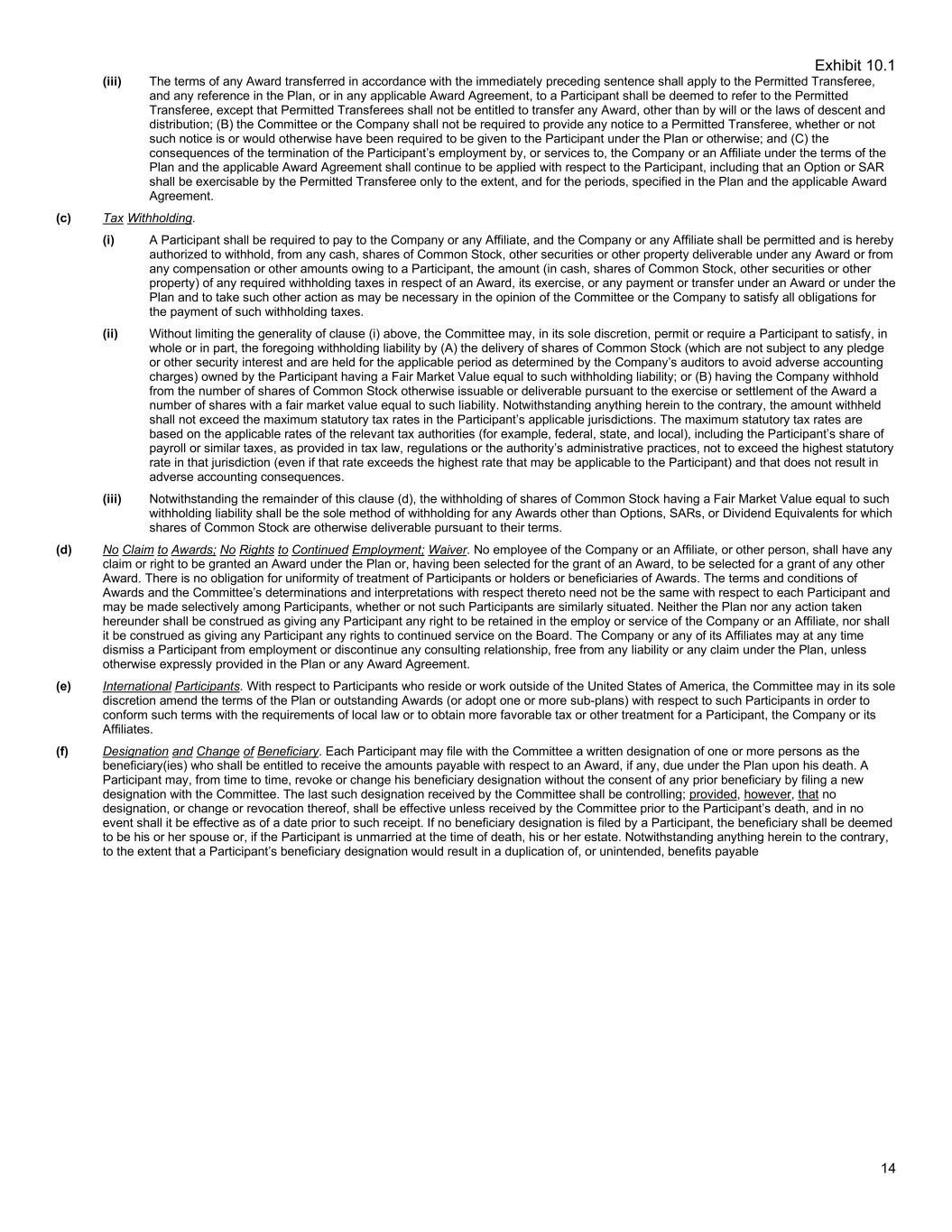 Exhibit 10.1 14 (iii) The terms of any Award transferred in accordance with the immediately preceding sentence shall apply to the Permitted Transferee, and any reference in the Plan, or in any applicable Award Agreement, to a Participant shall be deemed to refer to the Permitted Transferee, except that Permitted Transferees shall not be entitled to transfer any Award, other than by will or the laws of descent and distribution; (B) the Committee or the Company shall not be required to provide any notice to a Permitted Transferee, whether or not such notice is or would otherwise have been required to be given to the Participant under the Plan or otherwise; and (C) the consequences of the termination of the Participant’s employment by, or services to, the Company or an Affiliate under the terms of the Plan and the applicable Award Agreement shall continue to be applied with respect to the Participant, including that an Option or SAR shall be exercisable by the Permitted Transferee only to the extent, and for the periods, specified in the Plan and the applicable Award Agreement. (c) Tax Withholding. (i) A Participant shall be required to pay to the Company or any Affiliate, and the Company or any Affiliate shall be permitted and is hereby authorized to withhold, from any cash, shares of Common Stock, other securities or other property deliverable under any Award or from any compensation or other amounts owing to a Participant, the amount (in cash, shares of Common Stock, other securities or other property) of any required withholding taxes in respect of an Award, its exercise, or any payment or transfer under an Award or under the Plan and to take such other action as may be necessary in the opinion of the Committee or the Company to satisfy all obligations for the payment of such withholding taxes. (ii) Without limiting the generality of clause (i) above, the Committee may, in its sole discretion, permit or require a Participant to satisfy, in whole or in part, the foregoing withholding liability by (A) the delivery of shares of Common Stock (which are not subject to any pledge or other security interest and are held for the applicable period as determined by the Company’s auditors to avoid adverse accounting charges) owned by the Participant having a Fair Market Value equal to such withholding liability; or (B) having the Company withhold from the number of shares of Common Stock otherwise issuable or deliverable pursuant to the exercise or settlement of the Award a number of shares with a fair market value equal to such liability. Notwithstanding anything herein to the contrary, the amount withheld shall not exceed the maximum statutory tax rates in the Participant’s applicable jurisdictions. The maximum statutory tax rates are based on the applicable rates of the relevant tax authorities (for example, federal, state, and local), including the Participant’s share of payroll or similar taxes, as provided in tax law, regulations or the authority’s administrative practices, not to exceed the highest statutory rate in that jurisdiction (even if that rate exceeds the highest rate that may be applicable to the Participant) and that does not result in adverse accounting consequences. (iii) Notwithstanding the remainder of this clause (d), the withholding of shares of Common Stock having a Fair Market Value equal to such withholding liability shall be the sole method of withholding for any Awards other than Options, SARs, or Dividend Equivalents for which shares of Common Stock are otherwise deliverable pursuant to their terms. (d) No Claim to Awards; No Rights to Continued Employment; Waiver. No employee of the Company or an Affiliate, or other person, shall have any claim or right to be granted an Award under the Plan or, having been selected for the grant of an Award, to be selected for a grant of any other Award. There is no obligation for uniformity of treatment of Participants or holders or beneficiaries of Awards. The terms and conditions of Awards and the Committee’s determinations and interpretations with respect thereto need not be the same with respect to each Participant and may be made selectively among Participants, whether or not such Participants are similarly situated. Neither the Plan nor any action taken hereunder shall be construed as giving any Participant any right to be retained in the employ or service of the Company or an Affiliate, nor shall it be construed as giving any Participant any rights to continued service on the Board. The Company or any of its Affiliates may at any time dismiss a Participant from employment or discontinue any consulting relationship, free from any liability or any claim under the Plan, unless otherwise expressly provided in the Plan or any Award Agreement. (e) International Participants. With respect to Participants who reside or work outside of the United States of America, the Committee may in its sole discretion amend the terms of the Plan or outstanding Awards (or adopt one or more sub-plans) with respect to such Participants in order to conform such terms with the requirements of local law or to obtain more favorable tax or other treatment for a Participant, the Company or its Affiliates. (f) Designation and Change of Beneficiary. Each Participant may file with the Committee a written designation of one or more persons as the beneficiary(ies) who shall be entitled to receive the amounts payable with respect to an Award, if any, due under the Plan upon his death. A Participant may, from time to time, revoke or change his beneficiary designation without the consent of any prior beneficiary by filing a new designation with the Committee. The last such designation received by the Committee shall be controlling; provided, however, that no designation, or change or revocation thereof, shall be effective unless received by the Committee prior to the Participant’s death, and in no event shall it be effective as of a date prior to suc
