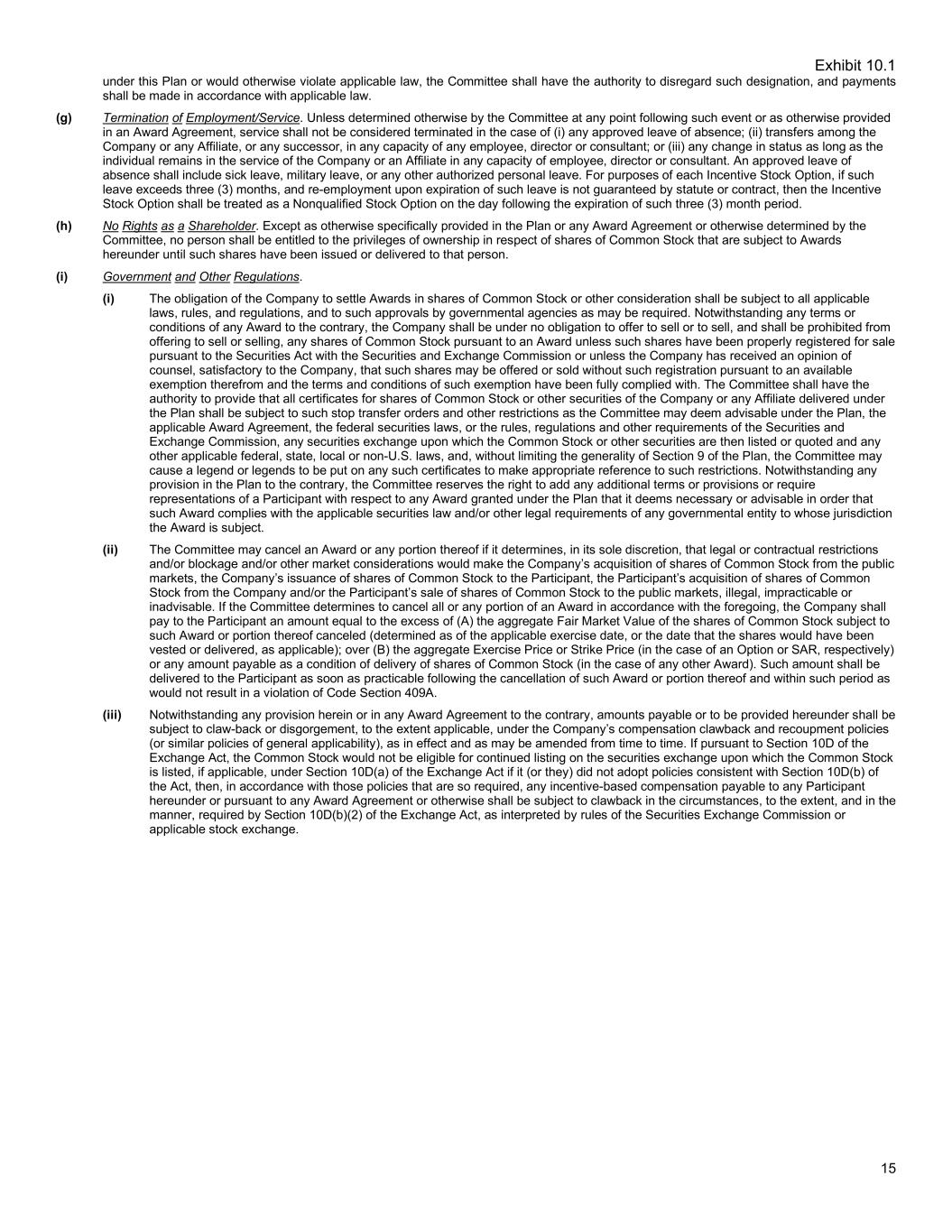 Exhibit 10.1 15 under this Plan or would otherwise violate applicable law, the Committee shall have the authority to disregard such designation, and payments shall be made in accordance with applicable law. (g) Termination of Employment/Service. Unless determined otherwise by the Committee at any point following such event or as otherwise provided in an Award Agreement, service shall not be considered terminated in the case of (i) any approved leave of absence; (ii) transfers among the Company or any Affiliate, or any successor, in any capacity of any employee, director or consultant; or (iii) any change in status as long as the individual remains in the service of the Company or an Affiliate in any capacity of employee, director or consultant. An approved leave of absence shall include sick leave, military leave, or any other authorized personal leave. For purposes of each Incentive Stock Option, if such leave exceeds three (3) months, and re-employment upon expiration of such leave is not guaranteed by statute or contract, then the Incentive Stock Option shall be treated as a Nonqualified Stock Option on the day following the expiration of such three (3) month period. (h) No Rights as a Shareholder. Except as otherwise specifically provided in the Plan or any Award Agreement or otherwise determined by the Committee, no person shall be entitled to the privileges of ownership in respect of shares of Common Stock that are subject to Awards hereunder until such shares have been issued or delivered to that person. (i) Government and Other Regulations. (i) The obligation of the Company to settle Awards in shares of Common Stock or other consideration shall be subject to all applicable laws, rules, and regulations, and to such approvals by governmental agencies as may be required. Notwithstanding any terms or conditions of any Award to the contrary, the Company shall be under no obligation to offer to sell or to sell, and shall be prohibited from offering to sell or selling, any shares of Common Stock pursuant to an Award unless such shares have been properly registered for sale pursuant to the Securities Act with the Securities and Exchange Commission or unless the Company has received an opinion of counsel, satisfactory to the Company, that such shares may be offered or sold without such registration pursuant to an available exemption therefrom and the terms and conditions of such exemption have been fully complied with. The Committee shall have the authority to provide that all certificates for shares of Common Stock or other securities of the Company or any Affiliate delivered under the Plan shall be subject to such stop transfer orders and other restrictions as the Committee may deem advisable under the Plan, the applicable Award Agreement, the federal securities laws, or the rules, regulations and other requirements of the Securities and Exchange Commission, any securities exchange upon which the Common Stock or other securities are then listed or quoted and any other applicable federal, state, local or non-U.S. laws, and, without limiting the generality of Section 9 of the Plan, the Committee may cause a legend or legends to be put on any such certificates to make appropriate reference to such restrictions. Notwithstanding any provision in the Plan to the contrary, the Committee reserves the right to add any additional terms or provisions or require representations of a Participant with respect to any Award granted under the Plan that it deems necessary or advisable in order that such Award complies with the applicable securities law and/or other legal requirements of any governmental entity to whose jurisdiction the Award is subject. (ii) The Committee may cancel an Award or any portion thereof if it determines, in its sole discretion, that legal or contractual restrictions and/or blockage and/or other market considerations would make the Company’s acquisition of shares of Common Stock from the public markets, the Company’s issuance of shares of Common Stock to the Participant, the Participant’s acquisition of shares of Common Stock from the Company and/or the Participant’s sale of shares of Common Stock to the public markets, illegal, impracticable or inadvisable. If the Committee determines to cancel all or any portion of an Award in accordance with the foregoing, the Company shall pay to the Participant an amount equal to the excess of (A) the aggregate Fair Market Value of the shares of Common Stock subject to such Award or portion thereof canceled (determined as of the applicable exercise date, or the date that the shares would have been vested or delivered, as applicable); over (B) the aggregate Exercise Price or Strike Price (in the case of an Option or SAR, respectively) or any amount payable as a condition of delivery of shares of Common Stock (in the case of any other Award). Such amount shall be delivered to the Participant as soon as practicable following the cancellation of such Award or portion thereof and within such period as would not result in a violation of Code Section 409A. (iii) Notwithstanding any provision herein or in any Award Agreement to the contrary, amounts payable or to be provided hereunder shall be subject to claw-back or disgorgement, to the extent applicable, under the Company’s compensation clawback and recoupment policies (or similar policies of general applicability), as in effect and as may be amended from time to time. If pursuant to Section 10D of the Exchange Act, the Common Stock would not be eligible for continued listing on the securities exchange upon which the Common Stock is listed, if applicable, under Section 10D(a) of the Exchange Act if it (or they) did not adopt policies consistent with Section 10D(b) of the Act, then, in accordance with those policies that are so required, any incentive-based compensation payable to any Participant hereunder or pursuant to any Award Agreement or otherwise shall be subject to clawback in t