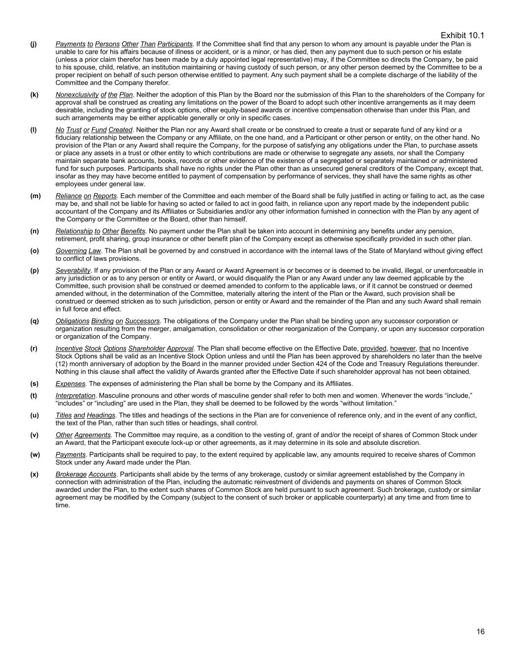 Exhibit 10.1 16 (j) Payments to Persons Other Than Participants. If the Committee shall find that any person to whom any amount is payable under the Plan is unable to care for his affairs because of illness or accident, or is a minor, or has died, then any payment due to such person or his estate (unless a prior claim therefor has been made by a duly appointed legal representative) may, if the Committee so directs the Company, be paid to his spouse, child, relative, an institution maintaining or having custody of such person, or any other person deemed by the Committee to be a proper recipient on behalf of such person otherwise entitled to payment. Any such payment shall be a complete discharge of the liability of the Committee and the Company therefor. (k) Nonexclusivity of the Plan. Neither the adoption of this Plan by the Board nor the submission of this Plan to the shareholders of the Company for approval shall be construed as creating any limitations on the power of the Board to adopt such other incentive arrangements as it may deem desirable, including the granting of stock options, other equity-based awards or incentive compensation otherwise than under this Plan, and such arrangements may be either applicable generally or only in specific cases. (l) No Trust or Fund Created. Neither the Plan nor any Award shall create or be construed to create a trust or separate fund of any kind or a fiduciary relationship between the Company or any Affiliate, on the one hand, and a Participant or other person or entity, on the other hand. No provision of the Plan or any Award shall require the Company, for the purpose of satisfying any obligations under the Plan, to purchase assets or place any assets in a trust or other entity to which contributions are made or otherwise to segregate any assets, nor shall the Company maintain separate bank accounts, books, records or other evidence of the existence of a segregated or separately maintained or administered fund for such purposes. Participants shall have no rights under the Plan other than as unsecured general creditors of the Company, except that, insofar as they may have become entitled to payment of compensation by performance of services, they shall have the same rights as other employees under general law. (m) Reliance on Reports. Each member of the Committee and each member of the Board shall be fully justified in acting or failing to act, as the case may be, and shall not be liable for having so acted or failed to act in good faith, in reliance upon any report made by the independent public accountant of the Company and its Affiliates or Subsidiaries and/or any other information furnished in connection with the Plan by any agent of the Company or the Committee or the Board, other than himself. (n) Relationship to Other Benefits. No payment under the Plan shall be taken into account in determining any benefits under any pension, retirement, profit sharing, group insurance or other benefit plan of the Company except as otherwise specifically provided in such other plan. (o) Governing Law. The Plan shall be governed by and construed in accordance with the internal laws of the State of Maryland without giving effect to conflict of laws provisions. (p) Severability. If any provision of the Plan or any Award or Award Agreement is or becomes or is deemed to be invalid, illegal, or unenforceable in any jurisdiction or as to any person or entity or Award, or would disqualify the Plan or any Award under any law deemed applicable by the Committee, such provision shall be construed or deemed amended to conform to the applicable laws, or if it cannot be construed or deemed amended without, in the determination of the Committee, materially altering the intent of the Plan or the Award, such provision shall be construed or deemed stricken as to such jurisdiction, person or entity or Award and the remainder of the Plan and any such Award shall remain in full force and effect. (q) Obligations Binding on Successors. The obligations of the Company under the Plan shall be binding upon any successor corporation or organization resulting from the merger, amalgamation, consolidation or other reorganization of the Company, or upon any successor corporation or organization of the Company. (r) Incentive Stock Options Shareholder Approval. The Plan shall become effective on the Effective Date, provided, however, that no Incentive Stock Options shall be valid as an Incentive Stock Option unless and until the Plan has been approved by shareholders no later than the twelve (12) month anniversary of adoption by the Board in the manner provided under Section 424 of the Code and Treasury Regulations thereunder. Nothing in this clause shall affect the validity of Awards granted after the Effective Date if such shareholder approval has not been obtained. (s) Expenses. The expenses of administering the Plan shall be borne by the Company and its Affiliates. (t) Interpretation. Masculine pronouns and other words of masculine gender shall refer to both men and women. Whenever the words “include,” “includes” or “including” are used in the Plan, they shall be deemed to be followed by the words “without limitation.” (u) Titles and Headings. The titles and headings of the sections in the Plan are for convenience of reference only, and in the event of any conflict, the text of the Plan, rather than such titles or headings, shall control. (v) Other Agreements. The Committee may require, as a condition to the vesting of, grant of and/or the receipt of shares of Common Stock under an Award, that the Participant execute lock-up or other agreements, as it may determine in its sole and absolute discretion. (w) Payments. Participants shall be required to pay, to the extent required by applicable law, any amounts required to receive shares of Common Stock under any Award made under the Plan. (x) Brokerage Accounts. Participants shall abide by the terms of any brokerage, custo