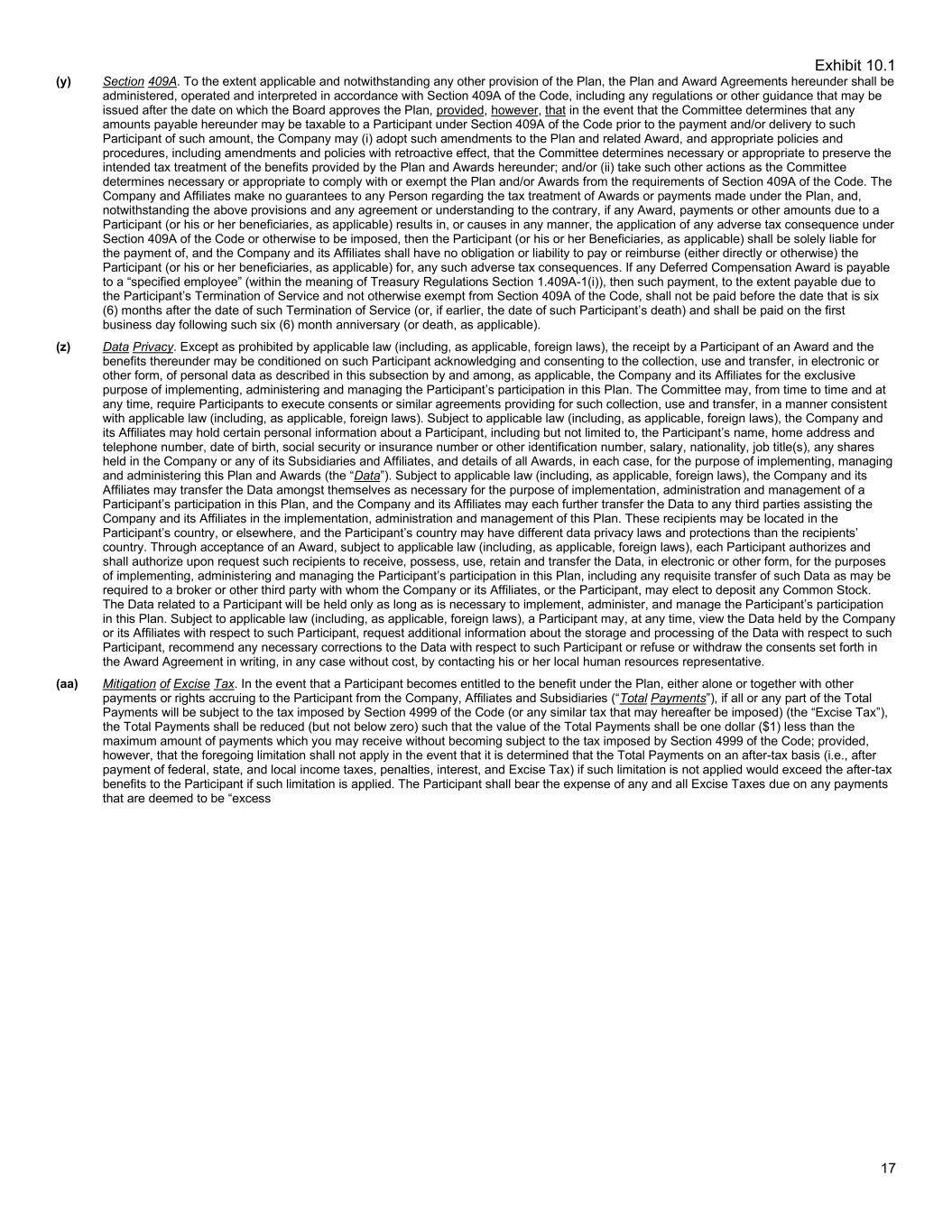 Exhibit 10.1 17 (y) Section 409A. To the extent applicable and notwithstanding any other provision of the Plan, the Plan and Award Agreements hereunder shall be administered, operated and interpreted in accordance with Section 409A of the Code, including any regulations or other guidance that may be issued after the date on which the Board approves the Plan, provided, however, that in the event that the Committee determines that any amounts payable hereunder may be taxable to a Participant under Section 409A of the Code prior to the payment and/or delivery to such Participant of such amount, the Company may (i) adopt such amendments to the Plan and related Award, and appropriate policies and procedures, including amendments and policies with retroactive effect, that the Committee determines necessary or appropriate to preserve the intended tax treatment of the benefits provided by the Plan and Awards hereunder; and/or (ii) take such other actions as the Committee determines necessary or appropriate to comply with or exempt the Plan and/or Awards from the requirements of Section 409A of the Code. The Company and Affiliates make no guarantees to any Person regarding the tax treatment of Awards or payments made under the Plan, and, notwithstanding the above provisions and any agreement or understanding to the contrary, if any Award, payments or other amounts due to a Participant (or his or her beneficiaries, as applicable) results in, or causes in any manner, the application of any adverse tax consequence under Section 409A of the Code or otherwise to be imposed, then the Participant (or his or her Beneficiaries, as applicable) shall be solely liable for the payment of, and the Company and its Affiliates shall have no obligation or liability to pay or reimburse (either directly or otherwise) the Participant (or his or her beneficiaries, as applicable) for, any such adverse tax consequences. If any Deferred Compensation Award is payable to a “specified employee” (within the meaning of Treasury Regulations Section 1.409A-1(i)), then such payment, to the extent payable due to the Participant’s Termination of Service and not otherwise exempt from Section 409A of the Code, shall not be paid before the date that is six (6) months after the date of such Termination of Service (or, if earlier, the date of such Participant’s death) and shall be paid on the first business day following such six (6) month anniversary (or death, as applicable). (z) Data Privacy. Except as prohibited by applicable law (including, as applicable, foreign laws), the receipt by a Participant of an Award and the benefits thereunder may be conditioned on such Participant acknowledging and consenting to the collection, use and transfer, in electronic or other form, of personal data as described in this subsection by and among, as applicable, the Company and its Affiliates for the exclusive purpose of implementing, administering and managing the Participant’s participation in this Plan. The Committee may, from time to time and at any time, require Participants to execute consents or similar agreements providing for such collection, use and transfer, in a manner consistent with applicable law (including, as applicable, foreign laws). Subject to applicable law (including, as applicable, foreign laws), the Company and its Affiliates may hold certain personal information about a Participant, including but not limited to, the Participant’s name, home address and telephone number, date of birth, social security or insurance number or other identification number, salary, nationality, job title(s), any shares held in the Company or any of its Subsidiaries and Affiliates, and details of all Awards, in each case, for the purpose of implementing, managing and administering this Plan and Awards (the “Data”). Subject to applicable law (including, as applicable, foreign laws), the Company and its Affiliates may transfer the Data amongst themselves as necessary for the purpose of implementation, administration and management of a Participant’s participation in this Plan, and the Company and its Affiliates may each further transfer the Data to any third parties assisting the Company and its Affiliates in the implementation, administration and management of this Plan. These recipients may be located in the Participant’s country, or elsewhere, and the Participant’s country may have different data privacy laws and protections than the recipients’ country. Through acceptance of an Award, subject to applicable law (including, as applicable, foreign laws), each Participant authorizes and shall authorize upon request such recipients to receive, possess, use, retain and transfer the Data, in electronic or other form, for the purposes of implementing, administering and managing the Participant’s participation in this Plan, including any requisite transfer of such Data as may be required to a broker or other third party with whom the Company or its Affiliates, or the Participant, may elect to deposit any Common Stock. The Data related to a Participant will be held only as long as is necessary to implement, administer, and manage the Participant’s participation in this Plan. Subject to applicable law (including, as applicable, foreign laws), a Participant may, at any time, view the Data held by the Company or its Affiliates with respect to such Participant, request additional information about the storage and processing of the Data with respect to such Participant, recommend any necessary corrections to the Data with respect to such Participant or refuse or withdraw the consents set forth in the Award Agreement in writing, in any case without cost, by contacting his or her local human resources representative. (aa) Mitigation of Excise Tax. In the event that a Participant becomes entitled to the benefit under the Plan, either alone or together with other payments or rights accruing to the Participant from the Company, Affiliat