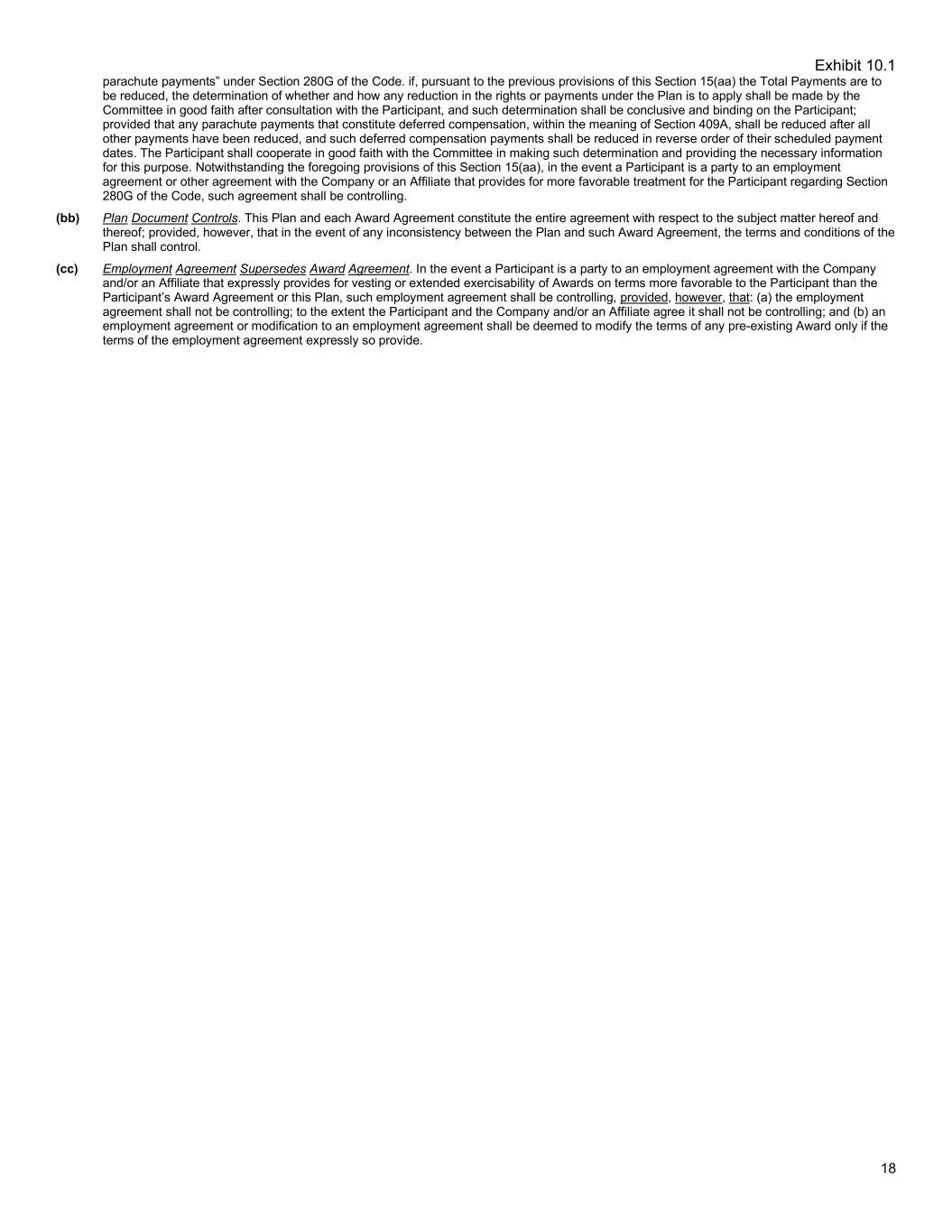 Exhibit 10.1 18 parachute payments” under Section 280G of the Code. if, pursuant to the previous provisions of this Section 15(aa) the Total Payments are to be reduced, the determination of whether and how any reduction in the rights or payments under the Plan is to apply shall be made by the Committee in good faith after consultation with the Participant, and such determination shall be conclusive and binding on the Participant; provided that any parachute payments that constitute deferred compensation, within the meaning of Section 409A, shall be reduced after all other payments have been reduced, and such deferred compensation payments shall be reduced in reverse order of their scheduled payment dates. The Participant shall cooperate in good faith with the Committee in making such determination and providing the necessary information for this purpose. Notwithstanding the foregoing provisions of this Section 15(aa), in the event a Participant is a party to an employment agreement or other agreement with the Company or an Affiliate that provides for more favorable treatment for the Participant regarding Section 280G of the Code, such agreement shall be controlling. (bb) Plan Document Controls. This Plan and each Award Agreement constitute the entire agreement with respect to the subject matter hereof and thereof; provided, however, that in the event of any inconsistency between the Plan and such Award Agreement, the terms and conditions of the Plan shall control. (cc) Employment Agreement Supersedes Award Agreement. In the event a Participant is a party to an employment agreement with the Company and/or an Affiliate that expressly provides for vesting or extended exercisability of Awards on terms more favorable to the Participant than the Participant’s Award Agreement or this Plan, such employment agreement shall be controlling, provided, however, that: (a) the employment agreement shall not be controlling; to the extent the Participant and the Company and/or an Affiliate agree it shall not be controlling; and (b) an employment agreement or modification to an employment agreement shall be deemed to modify the terms of any pre-existing Award only if the terms of the employment agreement expressly so provide.