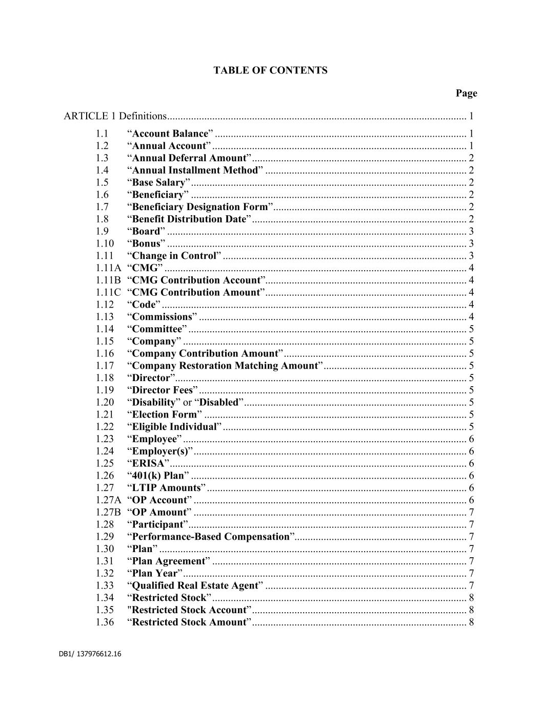 DB1/ 137976612.16 TABLE OF CONTENTS Page ARTICLE 1 Definitions ................................................................................................................. 1 1.1 “Account Balance” ............................................................................................... 1 1.2 “Annual Account” ................................................................................................ 1 1.3 “Annual Deferral Amount” ................................................................................. 2 1.4 “Annual Installment Method” ............................................................................ 2 1.5 “Base Salary” ........................................................................................................ 2 1.6 “Beneficiary” ........................................................................................................ 2 1.7 “Beneficiary Designation Form” ......................................................................... 2 1.8 “Benefit Distribution Date” ................................................................................. 2 1.9 “Board” ................................................................................................................. 3 1.10 “Bonus” ................................................................................................................. 3 1.11 “Change in Control” ............................................................................................ 3 1.11A “CMG” .................................................................................................................. 4 1.11B “CMG Contribution Account”............................................................................ 4 1.11C “CMG Contribution Amount” ............................................................................ 4 1.12 “Code” ................................................................................................................... 4 1.13 “Commissions” ..................................................................................................... 4 1.14 “Committee” ......................................................................................................... 5 1.15 “Company” ........................................................................................................... 5 1.16 “Company Contribution Amount” ..................................................................... 5 1.17 “Company Restoration Matching Amount” ...................................................... 5 1.18 “Director”.............................................................................................................. 5 1.19 “Director Fees” ..................................................................................................... 5 1.20 “Disability” or “Disabled” .................................................................................... 5 1.21 “Election Form” ................................................................................................... 5 1.22 “Eligible Individual” ............................................................................................ 5 1.23 “Employee” ........................................................................................................... 6 1.24 “Employer(s)” ....................................................................................................... 6 1.25 “ERISA” ................................................................................................................ 6 1.26 “401(k) Plan” ........................................................................................................ 6 1.27 “LTIP Amounts” .................................................................................................. 6 1.27A “OP Account” ....................................................................................................... 6 1.27B “OP Amount” ....................................................................................................... 7 1.28 “Participant” ......................................................................................................... 7 1.29 “Performance-Based Compensation”................................................................. 7 1.30 “Plan” .................................................................................................................... 7 1.31 “Plan Agreement” ................................................................................................ 7 1.32 “Plan Year” ........................................................................................................... 7 1.33 “Qualified Real Estate Agent” ............................................................................ 7 1.34 “Restricted Stock” ................................................................................................ 8 1.35 "Restricted Stock Account” ................................................................................. 8 1.36 “Restricted Stock Amount” ................................................................................. 8