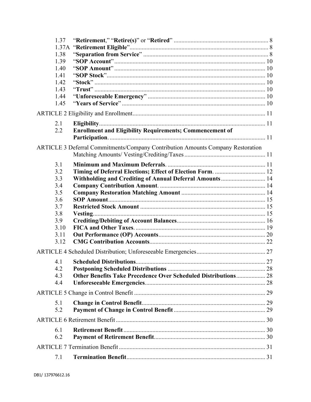 DB1/ 137976612.16 1.37 “Retirement,” “Retire(s)” or “Retired” .............................................................. 8 1.37A “Retirement Eligible”........................................................................................... 8 1.38 “Separation from Service” .................................................................................. 8 1.39 “SOP Account” ................................................................................................... 10 1.40 “SOP Amount” ................................................................................................... 10 1.41 “SOP Stock” ........................................................................................................ 10 1.42 “Stock” ................................................................................................................ 10 1.43 “Trust” ................................................................................................................ 10 1.44 “Unforeseeable Emergency” ............................................................................. 10 1.45 “Years of Service” .............................................................................................. 10 ARTICLE 2 Eligibility and Enrollment ....................................................................................... 11 2.1 Eligibility ............................................................................................................. 11 2.2 Enrollment and Eligibility Requirements; Commencement of Participation. ...................................................................................................... 11 ARTICLE 3 Deferral Commitments/Company Contribution Amounts Company Restoration Matching Amounts/ Vesting/Crediting/Taxes ..................................................... 11 3.1 Minimum and Maximum Deferrals. ................................................................ 11 3.2 Timing of Deferral Elections; Effect of Election Form. ................................. 12 3.3 Withholding and Crediting of Annual Deferral Amounts ............................. 14 3.4 Company Contribution Amount. ..................................................................... 14 3.5 Company Restoration Matching Amount ....................................................... 14 3.6 SOP Amount ....................................................................................................... 15 3.7 Restricted Stock Amount .................................................................................. 15 3.8 Vesting. ................................................................................................................ 15 3.9 Crediting/Debiting of Account Balances .......................................................... 16 3.10 FICA and Other Taxes. ..................................................................................... 19 3.11 Out Performance (OP) Accounts ...................................................................... 20 3.12 CMG Contribution Accounts............................................................................ 22 ARTICLE 4 Scheduled Distribution; Unforeseeable Emergencies ............................................. 27 4.1 Scheduled Distributions..................................................................................... 27 4.2 Postponing Scheduled Distributions ................................................................ 28 4.3 Other Benefits Take Precedence Over Scheduled Distributions ................... 28 4.4 Unforeseeable Emergencies. .............................................................................. 28 ARTICLE 5 Change in Control Benefit ...................................................................................... 29 5.1 Change in Control Benefit................................................................................. 29 5.2 Payment of Change in Control Benefit ............................................................ 29 ARTICLE 6 Retirement Benefit .................................................................................................. 30 6.1 Retirement Benefit ............................................................................................. 30 6.2 Payment of Retirement Benefit. ........................................................................ 30 ARTICLE 7 Termination Benefit ................................................................................................ 31 7.1 Termination Benefit ........................................................................................... 31