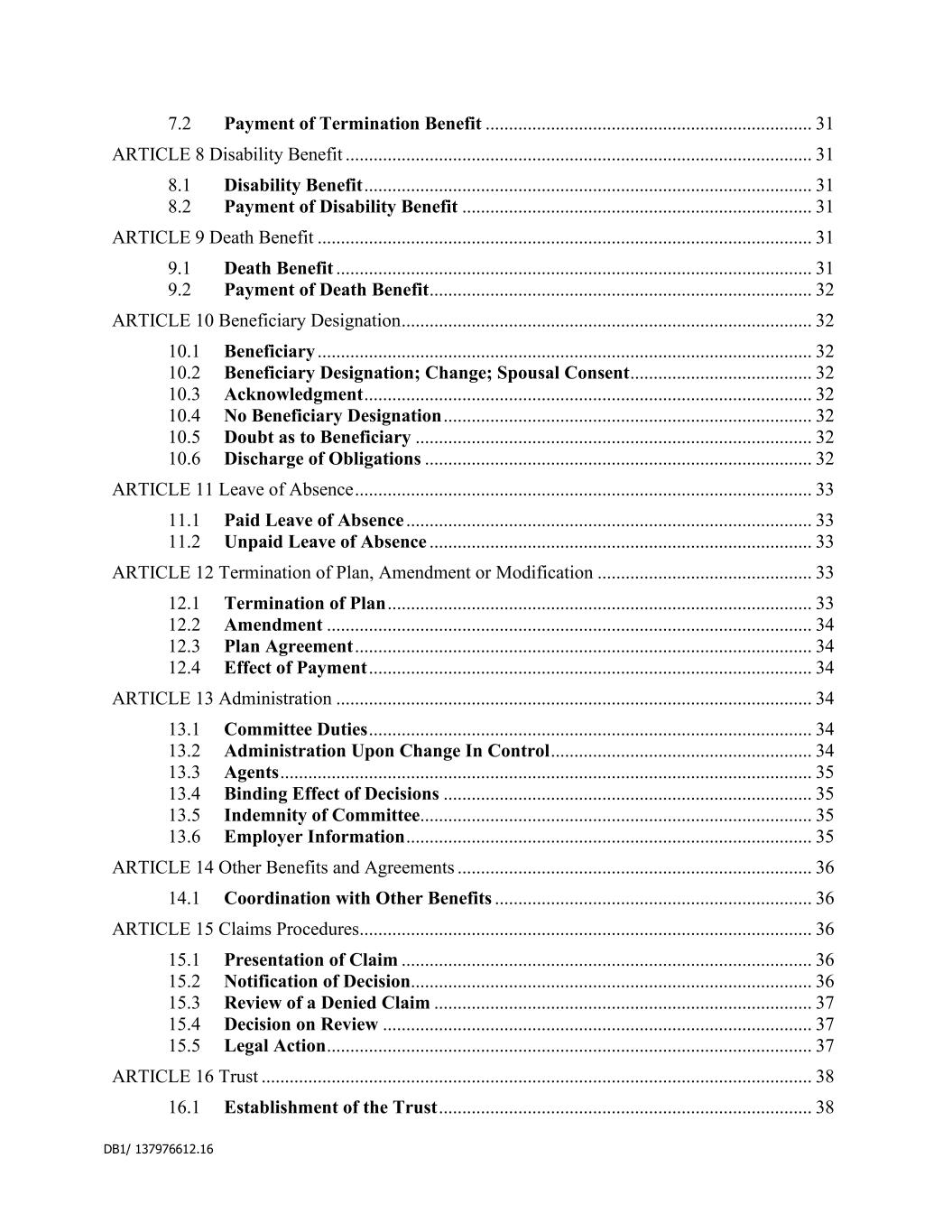 DB1/ 137976612.16 7.2 Payment of Termination Benefit ...................................................................... 31 ARTICLE 8 Disability Benefit .................................................................................................... 31 8.1 Disability Benefit ................................................................................................ 31 8.2 Payment of Disability Benefit ........................................................................... 31 ARTICLE 9 Death Benefit .......................................................................................................... 31 9.1 Death Benefit ...................................................................................................... 31 9.2 Payment of Death Benefit .................................................................................. 32 ARTICLE 10 Beneficiary Designation ........................................................................................ 32 10.1 Beneficiary .......................................................................................................... 32 10.2 Beneficiary Designation; Change; Spousal Consent ....................................... 32 10.3 Acknowledgment ................................................................................................ 32 10.4 No Beneficiary Designation ............................................................................... 32 10.5 Doubt as to Beneficiary ..................................................................................... 32 10.6 Discharge of Obligations ................................................................................... 32 ARTICLE 11 Leave of Absence .................................................................................................. 33 11.1 Paid Leave of Absence ....................................................................................... 33 11.2 Unpaid Leave of Absence .................................................................................. 33 ARTICLE 12 Termination of Plan, Amendment or Modification .............................................. 33 12.1 Termination of Plan ........................................................................................... 33 12.2 Amendment ........................................................................................................ 34 12.3 Plan Agreement .................................................................................................. 34 12.4 Effect of Payment ............................................................................................... 34 ARTICLE 13 Administration ...................................................................................................... 34 13.1 Committee Duties ............................................................................................... 34 13.2 Administration Upon Change In Control ........................................................ 34 13.3 Agents .................................................................................................................. 35 13.4 Binding Effect of Decisions ............................................................................... 35 13.5 Indemnity of Committee .................................................................................... 35 13.6 Employer Information ....................................................................................... 35 ARTICLE 14 Other Benefits and Agreements ............................................................................ 36 14.1 Coordination with Other Benefits .................................................................... 36 ARTICLE 15 Claims Procedures................................................................................................. 36 15.1 Presentation of Claim ........................................................................................ 36 15.2 Notification of Decision...................................................................................... 36 15.3 Review of a Denied Claim ................................................................................. 37 15.4 Decision on Review ............................................................................................ 37 15.5 Legal Action ........................................................................................................ 37 ARTICLE 16 Trust ...................................................................................................................... 38 16.1 Establishment of the Trust ................................................................................ 38