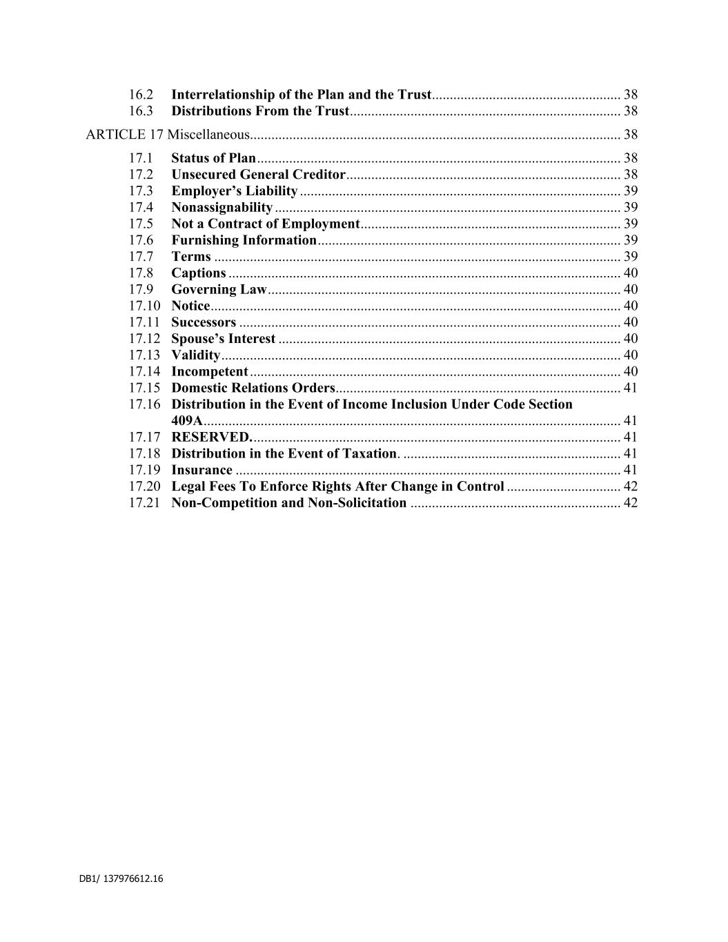 DB1/ 137976612.16 16.2 Interrelationship of the Plan and the Trust ..................................................... 38 16.3 Distributions From the Trust ............................................................................ 38 ARTICLE 17 Miscellaneous........................................................................................................ 38 17.1 Status of Plan ...................................................................................................... 38 17.2 Unsecured General Creditor ............................................................................. 38 17.3 Employer’s Liability .......................................................................................... 39 17.4 Nonassignability ................................................................................................. 39 17.5 Not a Contract of Employment ......................................................................... 39 17.6 Furnishing Information ..................................................................................... 39 17.7 Terms .................................................................................................................. 39 17.8 Captions .............................................................................................................. 40 17.9 Governing Law ................................................................................................... 40 17.10 Notice ................................................................................................................... 40 17.11 Successors ........................................................................................................... 40 17.12 Spouse’s Interest ................................................................................................ 40 17.13 Validity ................................................................................................................ 40 17.14 Incompetent ........................................................................................................ 40 17.15 Domestic Relations Orders................................................................................ 41 17.16 Distribution in the Event of Income Inclusion Under Code Section 409A ..................................................................................................................... 41 17.17 RESERVED. ....................................................................................................... 41 17.18 Distribution in the Event of Taxation. ............................................................. 41 17.19 Insurance ............................................................................................................ 41 17.20 Legal Fees To Enforce Rights After Change in Control ................................ 42 17.21 Non-Competition and Non-Solicitation ........................................................... 42
