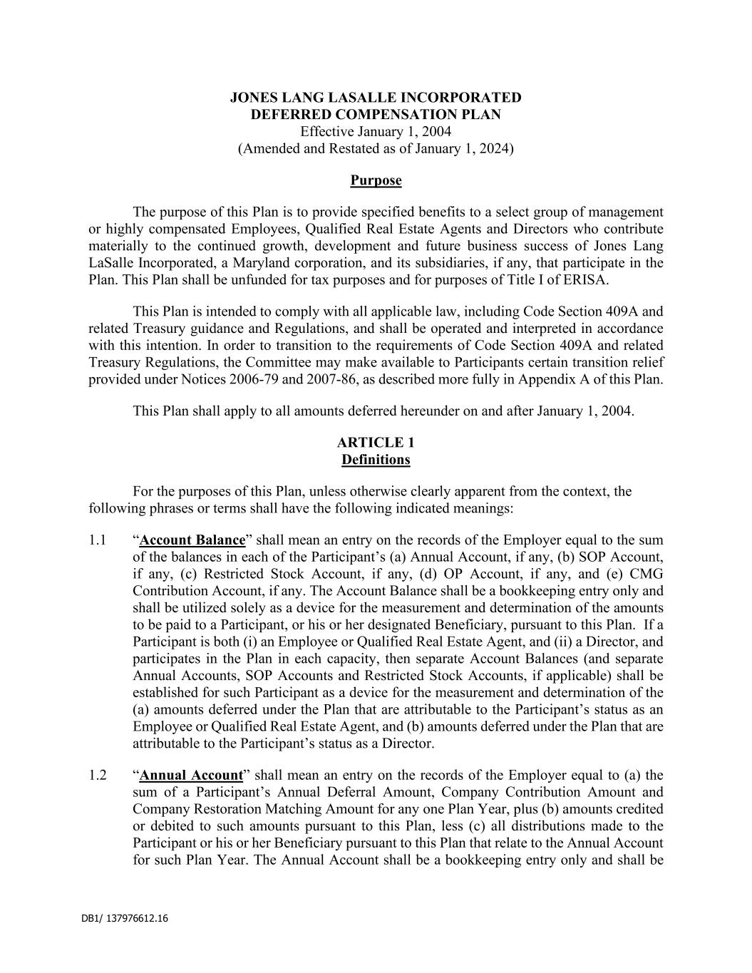 DB1/ 137976612.16 JONES LANG LASALLE INCORPORATED DEFERRED COMPENSATION PLAN Effective January 1, 2004 (Amended and Restated as of January 1, 2024) Purpose The purpose of this Plan is to provide specified benefits to a select group of management or highly compensated Employees, Qualified Real Estate Agents and Directors who contribute materially to the continued growth, development and future business success of Jones Lang LaSalle Incorporated, a Maryland corporation, and its subsidiaries, if any, that participate in the Plan. This Plan shall be unfunded for tax purposes and for purposes of Title I of ERISA. This Plan is intended to comply with all applicable law, including Code Section 409A and related Treasury guidance and Regulations, and shall be operated and interpreted in accordance with this intention. In order to transition to the requirements of Code Section 409A and related Treasury Regulations, the Committee may make available to Participants certain transition relief provided under Notices 2006-79 and 2007-86, as described more fully in Appendix A of this Plan. This Plan shall apply to all amounts deferred hereunder on and after January 1, 2004. ARTICLE 1 Definitions For the purposes of this Plan, unless otherwise clearly apparent from the context, the following phrases or terms shall have the following indicated meanings: 1.1 “Account Balance” shall mean an entry on the records of the Employer equal to the sum of the balances in each of the Participant’s (a) Annual Account, if any, (b) SOP Account, if any, (c) Restricted Stock Account, if any, (d) OP Account, if any, and (e) CMG Contribution Account, if any. The Account Balance shall be a bookkeeping entry only and shall be utilized solely as a device for the measurement and determination of the amounts to be paid to a Participant, or his or her designated Beneficiary, pursuant to this Plan. If a Participant is both (i) an Employee or Qualified Real Estate Agent, and (ii) a Director, and participates in the Plan in each capacity, then separate Account Balances (and separate Annual Accounts, SOP Accounts and Restricted Stock Accounts, if applicable) shall be established for such Participant as a device for the measurement and determination of the (a) amounts deferred under the Plan that are attributable to the Participant’s status as an Employee or Qualified Real Estate Agent, and (b) amounts deferred under the Plan that are attributable to the Participant’s status as a Director. 1.2 “Annual Account” shall mean an entry on the records of the Employer equal to (a) the sum of a Participant’s Annual Deferral Amount, Company Contribution Amount and Company Restoration Matching Amount for any one Plan Year, plus (b) amounts credited or debited to such amounts pursuant to this Plan, less (c) all distributions made to the Participant or his or her Beneficiary pursuant to this Plan that relate to the Annual Account for such Plan Year. The Annual Account shall be a bookkeeping entry only and shall be