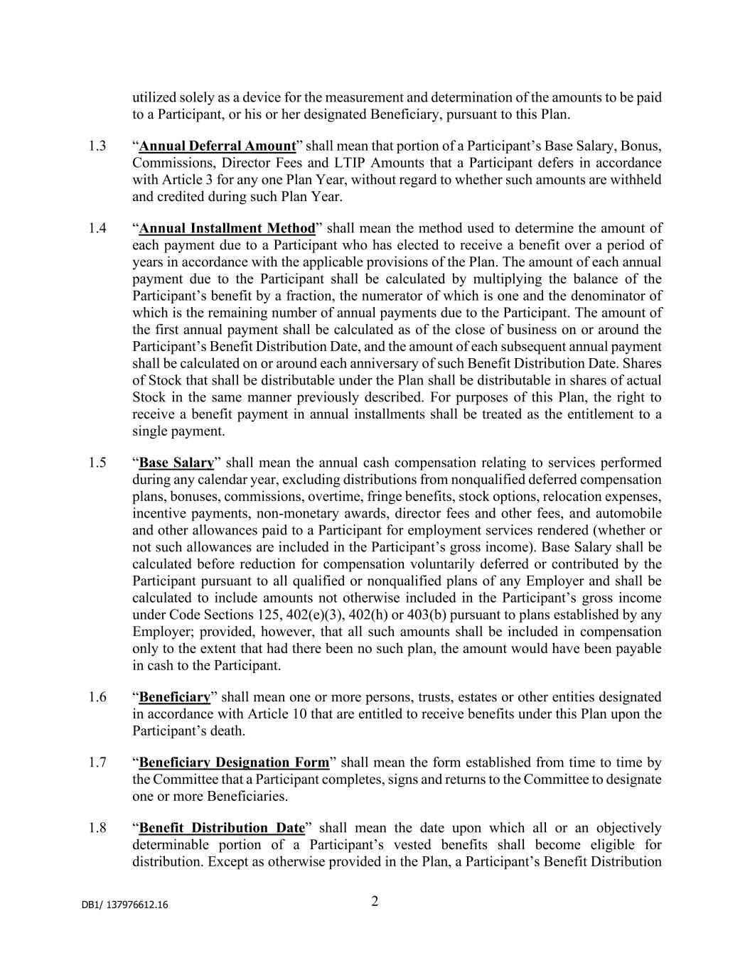 DB1/ 137976612.16 2 utilized solely as a device for the measurement and determination of the amounts to be paid to a Participant, or his or her designated Beneficiary, pursuant to this Plan. 1.3 “Annual Deferral Amount” shall mean that portion of a Participant’s Base Salary, Bonus, Commissions, Director Fees and LTIP Amounts that a Participant defers in accordance with Article 3 for any one Plan Year, without regard to whether such amounts are withheld and credited during such Plan Year. 1.4 “Annual Installment Method” shall mean the method used to determine the amount of each payment due to a Participant who has elected to receive a benefit over a period of years in accordance with the applicable provisions of the Plan. The amount of each annual payment due to the Participant shall be calculated by multiplying the balance of the Participant’s benefit by a fraction, the numerator of which is one and the denominator of which is the remaining number of annual payments due to the Participant. The amount of the first annual payment shall be calculated as of the close of business on or around the Participant’s Benefit Distribution Date, and the amount of each subsequent annual payment shall be calculated on or around each anniversary of such Benefit Distribution Date. Shares of Stock that shall be distributable under the Plan shall be distributable in shares of actual Stock in the same manner previously described. For purposes of this Plan, the right to receive a benefit payment in annual installments shall be treated as the entitlement to a single payment. 1.5 “Base Salary” shall mean the annual cash compensation relating to services performed during any calendar year, excluding distributions from nonqualified deferred compensation plans, bonuses, commissions, overtime, fringe benefits, stock options, relocation expenses, incentive payments, non-monetary awards, director fees and other fees, and automobile and other allowances paid to a Participant for employment services rendered (whether or not such allowances are included in the Participant’s gross income). Base Salary shall be calculated before reduction for compensation voluntarily deferred or contributed by the Participant pursuant to all qualified or nonqualified plans of any Employer and shall be calculated to include amounts not otherwise included in the Participant’s gross income under Code Sections 125, 402(e)(3), 402(h) or 403(b) pursuant to plans established by any Employer; provided, however, that all such amounts shall be included in compensation only to the extent that had there been no such plan, the amount would have been payable in cash to the Participant. 1.6 “Beneficiary” shall mean one or more persons, trusts, estates or other entities designated in accordance with Article 10 that are entitled to receive benefits under this Plan upon the Participant’s death. 1.7 “Beneficiary Designation Form” shall mean the form established from time to time by the Committee that a Participant completes, signs and returns to the Committee to designate one or more Beneficiaries. 1.8 “Benefit Distribution Date” shall mean the date upon which all or an objectively determinable portion of a Participant’s vested benefits shall become eligible for distribution. Except as otherwise provided in the Plan, a Participant’s Benefit Distribution