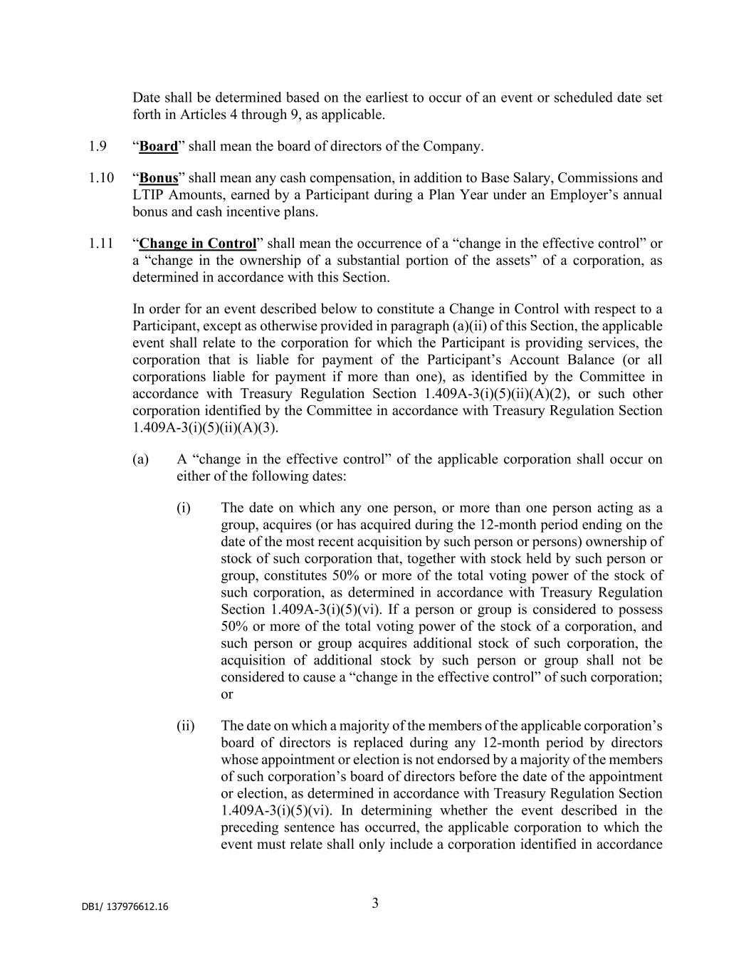 DB1/ 137976612.16 3 Date shall be determined based on the earliest to occur of an event or scheduled date set forth in Articles 4 through 9, as applicable. 1.9 “Board” shall mean the board of directors of the Company. 1.10 “Bonus” shall mean any cash compensation, in addition to Base Salary, Commissions and LTIP Amounts, earned by a Participant during a Plan Year under an Employer’s annual bonus and cash incentive plans. 1.11 “Change in Control” shall mean the occurrence of a “change in the effective control” or a “change in the ownership of a substantial portion of the assets” of a corporation, as determined in accordance with this Section. In order for an event described below to constitute a Change in Control with respect to a Participant, except as otherwise provided in paragraph (a)(ii) of this Section, the applicable event shall relate to the corporation for which the Participant is providing services, the corporation that is liable for payment of the Participant’s Account Balance (or all corporations liable for payment if more than one), as identified by the Committee in accordance with Treasury Regulation Section 1.409A-3(i)(5)(ii)(A)(2), or such other corporation identified by the Committee in accordance with Treasury Regulation Section 1.409A-3(i)(5)(ii)(A)(3). (a) A “change in the effective control” of the applicable corporation shall occur on either of the following dates: (i) The date on which any one person, or more than one person acting as a group, acquires (or has acquired during the 12-month period ending on the date of the most recent acquisition by such person or persons) ownership of stock of such corporation that, together with stock held by such person or group, constitutes 50% or more of the total voting power of the stock of such corporation, as determined in accordance with Treasury Regulation Section 1.409A-3(i)(5)(vi). If a person or group is considered to possess 50% or more of the total voting power of the stock of a corporation, and such person or group acquires additional stock of such corporation, the acquisition of additional stock by such person or group shall not be considered to cause a “change in the effective control” of such corporation; or (ii) The date on which a majority of the members of the applicable corporation’s board of directors is replaced during any 12-month period by directors whose appointment or election is not endorsed by a majority of the members of such corporation’s board of directors before the date of the appointment or election, as determined in accordance with Treasury Regulation Section 1.409A-3(i)(5)(vi). In determining whether the event described in the preceding sentence has occurred, the applicable corporation to which the event must relate shall only include a corporation identified in accordance