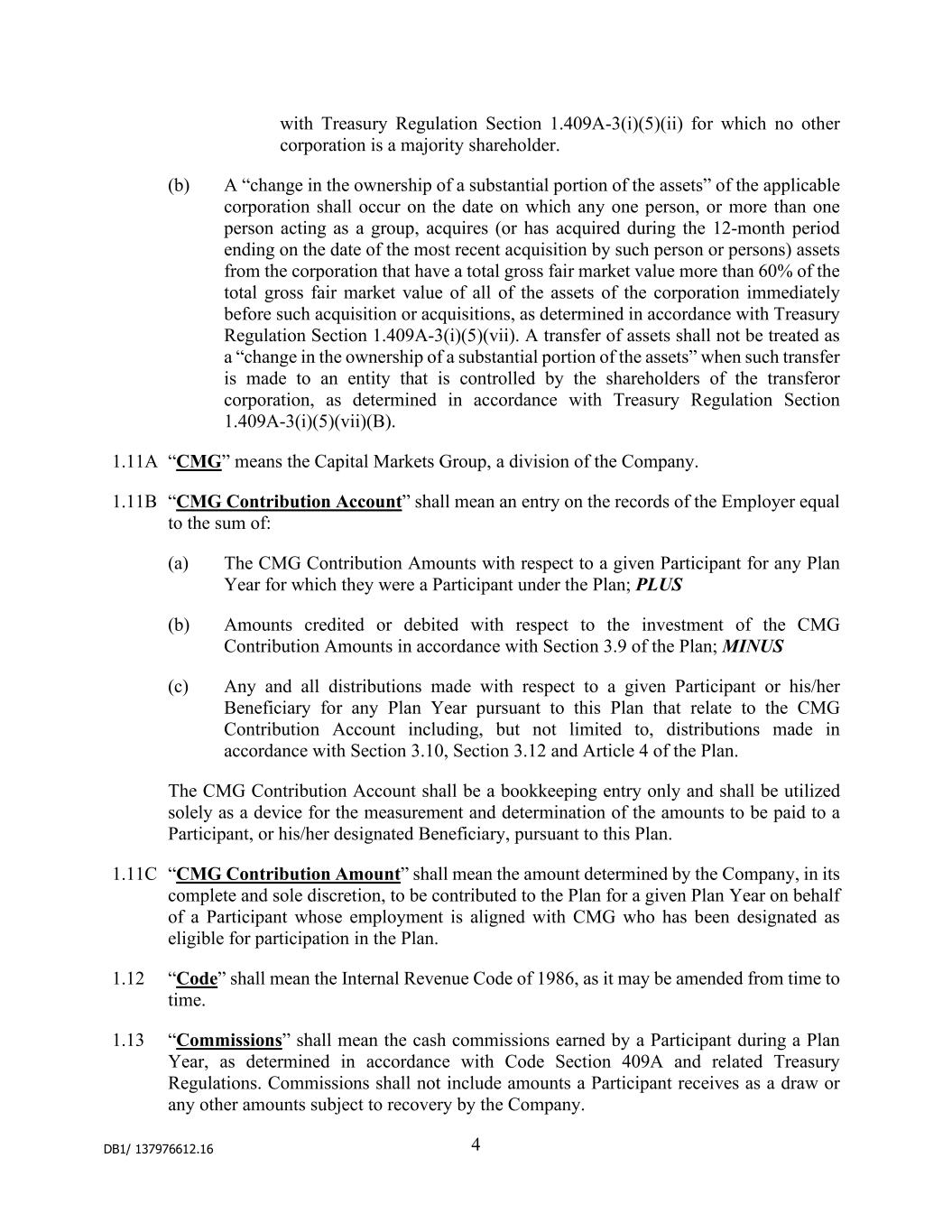 DB1/ 137976612.16 4 with Treasury Regulation Section 1.409A-3(i)(5)(ii) for which no other corporation is a majority shareholder. (b) A “change in the ownership of a substantial portion of the assets” of the applicable corporation shall occur on the date on which any one person, or more than one person acting as a group, acquires (or has acquired during the 12-month period ending on the date of the most recent acquisition by such person or persons) assets from the corporation that have a total gross fair market value more than 60% of the total gross fair market value of all of the assets of the corporation immediately before such acquisition or acquisitions, as determined in accordance with Treasury Regulation Section 1.409A-3(i)(5)(vii). A transfer of assets shall not be treated as a “change in the ownership of a substantial portion of the assets” when such transfer is made to an entity that is controlled by the shareholders of the transferor corporation, as determined in accordance with Treasury Regulation Section 1.409A-3(i)(5)(vii)(B). 1.11A “CMG” means the Capital Markets Group, a division of the Company. 1.11B “CMG Contribution Account” shall mean an entry on the records of the Employer equal to the sum of: (a) The CMG Contribution Amounts with respect to a given Participant for any Plan Year for which they were a Participant under the Plan; PLUS (b) Amounts credited or debited with respect to the investment of the CMG Contribution Amounts in accordance with Section 3.9 of the Plan; MINUS (c) Any and all distributions made with respect to a given Participant or his/her Beneficiary for any Plan Year pursuant to this Plan that relate to the CMG Contribution Account including, but not limited to, distributions made in accordance with Section 3.10, Section 3.12 and Article 4 of the Plan. The CMG Contribution Account shall be a bookkeeping entry only and shall be utilized solely as a device for the measurement and determination of the amounts to be paid to a Participant, or his/her designated Beneficiary, pursuant to this Plan. 1.11C “CMG Contribution Amount” shall mean the amount determined by the Company, in its complete and sole discretion, to be contributed to the Plan for a given Plan Year on behalf of a Participant whose employment is aligned with CMG who has been designated as eligible for participation in the Plan. 1.12 “Code” shall mean the Internal Revenue Code of 1986, as it may be amended from time to time. 1.13 “Commissions” shall mean the cash commissions earned by a Participant during a Plan Year, as determined in accordance with Code Section 409A and related Treasury Regulations. Commissions shall not include amounts a Participant receives as a draw or any other amounts subject to recovery by the Company.