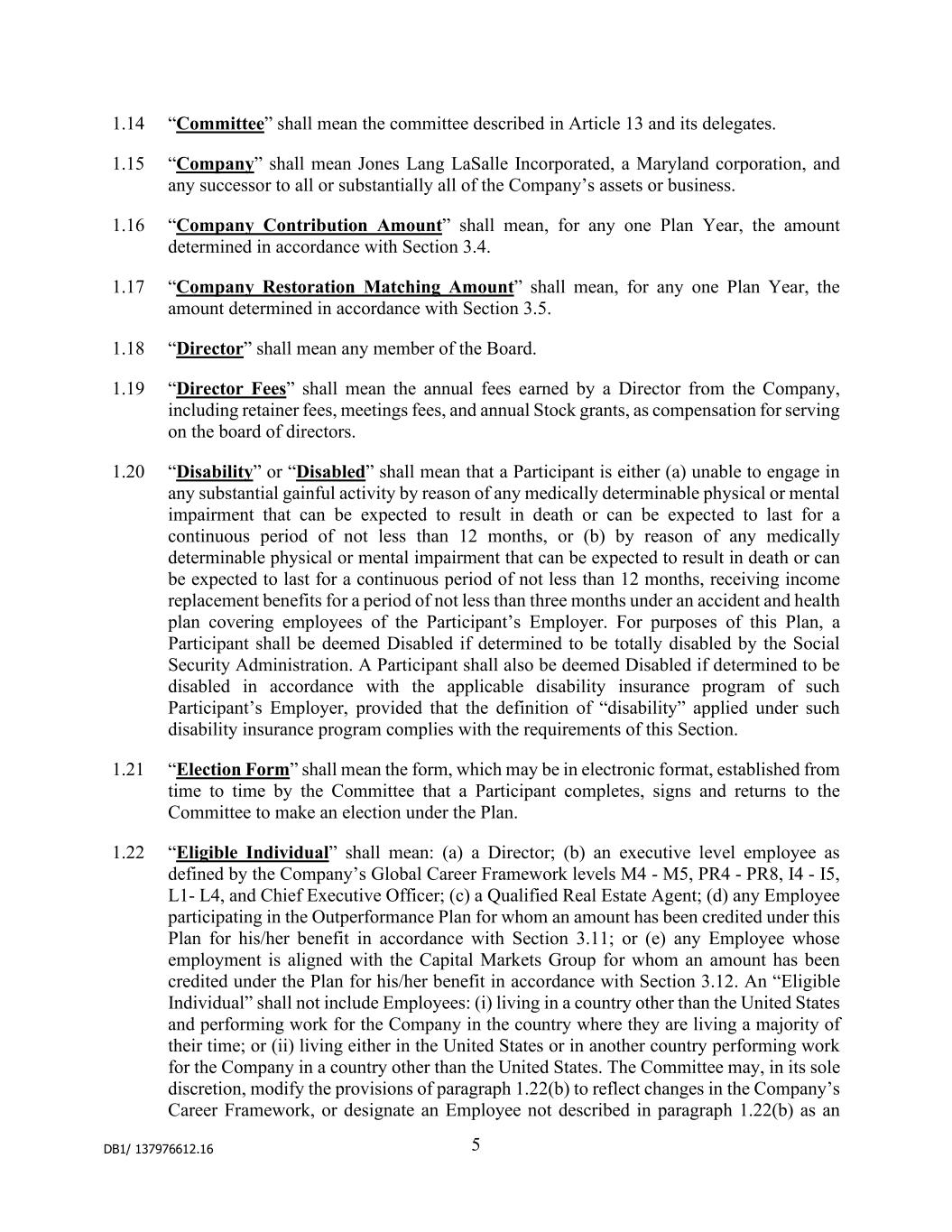 DB1/ 137976612.16 5 1.14 “Committee” shall mean the committee described in Article 13 and its delegates. 1.15 “Company” shall mean Jones Lang LaSalle Incorporated, a Maryland corporation, and any successor to all or substantially all of the Company’s assets or business. 1.16 “Company Contribution Amount” shall mean, for any one Plan Year, the amount determined in accordance with Section 3.4. 1.17 “Company Restoration Matching Amount” shall mean, for any one Plan Year, the amount determined in accordance with Section 3.5. 1.18 “Director” shall mean any member of the Board. 1.19 “Director Fees” shall mean the annual fees earned by a Director from the Company, including retainer fees, meetings fees, and annual Stock grants, as compensation for serving on the board of directors. 1.20 “Disability” or “Disabled” shall mean that a Participant is either (a) unable to engage in any substantial gainful activity by reason of any medically determinable physical or mental impairment that can be expected to result in death or can be expected to last for a continuous period of not less than 12 months, or (b) by reason of any medically determinable physical or mental impairment that can be expected to result in death or can be expected to last for a continuous period of not less than 12 months, receiving income replacement benefits for a period of not less than three months under an accident and health plan covering employees of the Participant’s Employer. For purposes of this Plan, a Participant shall be deemed Disabled if determined to be totally disabled by the Social Security Administration. A Participant shall also be deemed Disabled if determined to be disabled in accordance with the applicable disability insurance program of such Participant’s Employer, provided that the definition of “disability” applied under such disability insurance program complies with the requirements of this Section. 1.21 “Election Form” shall mean the form, which may be in electronic format, established from time to time by the Committee that a Participant completes, signs and returns to the Committee to make an election under the Plan. 1.22 “Eligible Individual” shall mean: (a) a Director; (b) an executive level employee as defined by the Company’s Global Career Framework levels M4 - M5, PR4 - PR8, I4 - I5, L1- L4, and Chief Executive Officer; (c) a Qualified Real Estate Agent; (d) any Employee participating in the Outperformance Plan for whom an amount has been credited under this Plan for his/her benefit in accordance with Section 3.11; or (e) any Employee whose employment is aligned with the Capital Markets Group for whom an amount has been credited under the Plan for his/her benefit in accordance with Section 3.12. An “Eligible Individual” shall not include Employees: (i) living in a country other than the United States and performing work for the Company in the country where they are living a majority of their time; or (ii) living either in the United States or in another country performing work for the Company in a country other than the United States. The Committee may, in its sole discretion, modify the provisions of paragraph 1.22(b) to reflect changes in the Company’s Career Framework, or designate an Employee not described in paragraph 1.22(b) as an