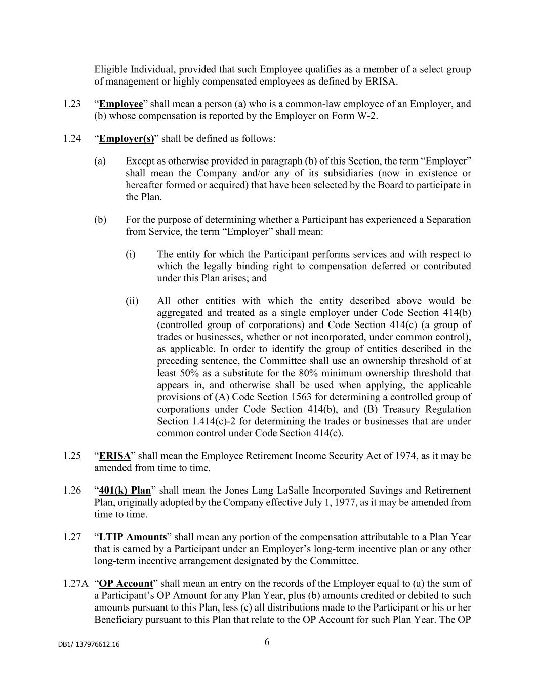 DB1/ 137976612.16 6 Eligible Individual, provided that such Employee qualifies as a member of a select group of management or highly compensated employees as defined by ERISA. 1.23 “Employee” shall mean a person (a) who is a common-law employee of an Employer, and (b) whose compensation is reported by the Employer on Form W-2. 1.24 “Employer(s)” shall be defined as follows: (a) Except as otherwise provided in paragraph (b) of this Section, the term “Employer” shall mean the Company and/or any of its subsidiaries (now in existence or hereafter formed or acquired) that have been selected by the Board to participate in the Plan. (b) For the purpose of determining whether a Participant has experienced a Separation from Service, the term “Employer” shall mean: (i) The entity for which the Participant performs services and with respect to which the legally binding right to compensation deferred or contributed under this Plan arises; and (ii) All other entities with which the entity described above would be aggregated and treated as a single employer under Code Section 414(b) (controlled group of corporations) and Code Section 414(c) (a group of trades or businesses, whether or not incorporated, under common control), as applicable. In order to identify the group of entities described in the preceding sentence, the Committee shall use an ownership threshold of at least 50% as a substitute for the 80% minimum ownership threshold that appears in, and otherwise shall be used when applying, the applicable provisions of (A) Code Section 1563 for determining a controlled group of corporations under Code Section 414(b), and (B) Treasury Regulation Section 1.414(c)-2 for determining the trades or businesses that are under common control under Code Section 414(c). 1.25 “ERISA” shall mean the Employee Retirement Income Security Act of 1974, as it may be amended from time to time. 1.26 “401(k) Plan” shall mean the Jones Lang LaSalle Incorporated Savings and Retirement Plan, originally adopted by the Company effective July 1, 1977, as it may be amended from time to time. 1.27 “LTIP Amounts” shall mean any portion of the compensation attributable to a Plan Year that is earned by a Participant under an Employer’s long-term incentive plan or any other long-term incentive arrangement designated by the Committee. 1.27A “OP Account” shall mean an entry on the records of the Employer equal to (a) the sum of a Participant’s OP Amount for any Plan Year, plus (b) amounts credited or debited to such amounts pursuant to this Plan, less (c) all distributions made to the Participant or his or her Beneficiary pursuant to this Plan that relate to the OP Account for such Plan Year. The OP