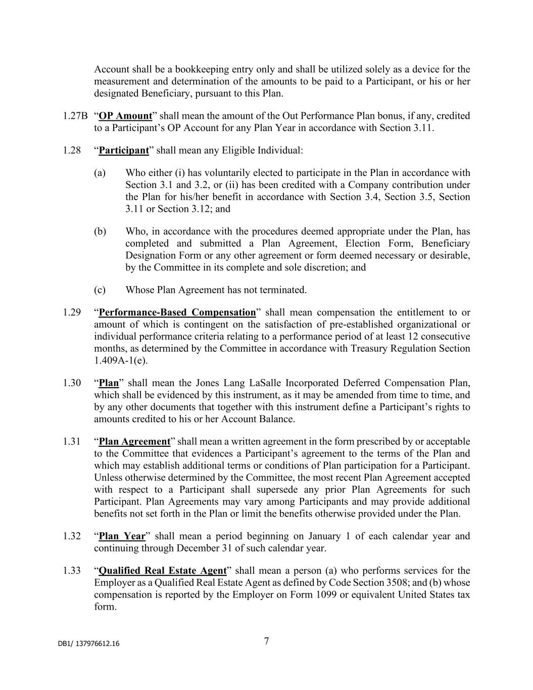 DB1/ 137976612.16 7 Account shall be a bookkeeping entry only and shall be utilized solely as a device for the measurement and determination of the amounts to be paid to a Participant, or his or her designated Beneficiary, pursuant to this Plan. 1.27B “OP Amount” shall mean the amount of the Out Performance Plan bonus, if any, credited to a Participant’s OP Account for any Plan Year in accordance with Section 3.11. 1.28 “Participant” shall mean any Eligible Individual: (a) Who either (i) has voluntarily elected to participate in the Plan in accordance with Section 3.1 and 3.2, or (ii) has been credited with a Company contribution under the Plan for his/her benefit in accordance with Section 3.4, Section 3.5, Section 3.11 or Section 3.12; and (b) Who, in accordance with the procedures deemed appropriate under the Plan, has completed and submitted a Plan Agreement, Election Form, Beneficiary Designation Form or any other agreement or form deemed necessary or desirable, by the Committee in its complete and sole discretion; and (c) Whose Plan Agreement has not terminated. 1.29 “Performance-Based Compensation” shall mean compensation the entitlement to or amount of which is contingent on the satisfaction of pre-established organizational or individual performance criteria relating to a performance period of at least 12 consecutive months, as determined by the Committee in accordance with Treasury Regulation Section 1.409A-1(e). 1.30 “Plan” shall mean the Jones Lang LaSalle Incorporated Deferred Compensation Plan, which shall be evidenced by this instrument, as it may be amended from time to time, and by any other documents that together with this instrument define a Participant’s rights to amounts credited to his or her Account Balance. 1.31 “Plan Agreement” shall mean a written agreement in the form prescribed by or acceptable to the Committee that evidences a Participant’s agreement to the terms of the Plan and which may establish additional terms or conditions of Plan participation for a Participant. Unless otherwise determined by the Committee, the most recent Plan Agreement accepted with respect to a Participant shall supersede any prior Plan Agreements for such Participant. Plan Agreements may vary among Participants and may provide additional benefits not set forth in the Plan or limit the benefits otherwise provided under the Plan. 1.32 “Plan Year” shall mean a period beginning on January 1 of each calendar year and continuing through December 31 of such calendar year. 1.33 “Qualified Real Estate Agent” shall mean a person (a) who performs services for the Employer as a Qualified Real Estate Agent as defined by Code Section 3508; and (b) whose compensation is reported by the Employer on Form 1099 or equivalent United States tax form.