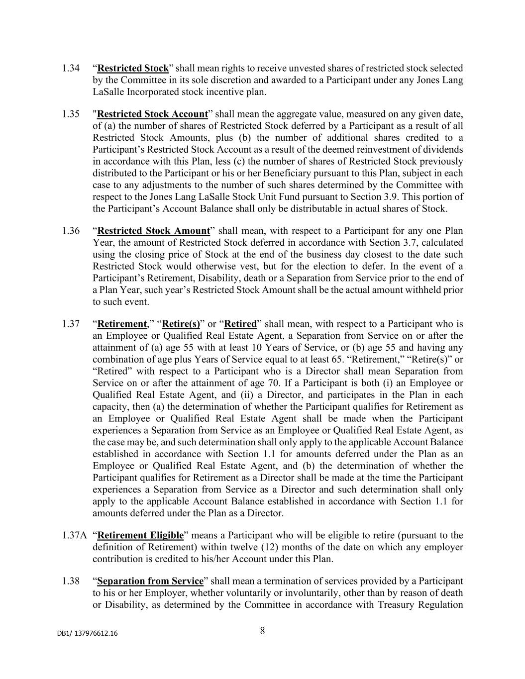 DB1/ 137976612.16 8 1.34 “Restricted Stock” shall mean rights to receive unvested shares of restricted stock selected by the Committee in its sole discretion and awarded to a Participant under any Jones Lang LaSalle Incorporated stock incentive plan. 1.35 "Restricted Stock Account” shall mean the aggregate value, measured on any given date, of (a) the number of shares of Restricted Stock deferred by a Participant as a result of all Restricted Stock Amounts, plus (b) the number of additional shares credited to a Participant’s Restricted Stock Account as a result of the deemed reinvestment of dividends in accordance with this Plan, less (c) the number of shares of Restricted Stock previously distributed to the Participant or his or her Beneficiary pursuant to this Plan, subject in each case to any adjustments to the number of such shares determined by the Committee with respect to the Jones Lang LaSalle Stock Unit Fund pursuant to Section 3.9. This portion of the Participant’s Account Balance shall only be distributable in actual shares of Stock. 1.36 “Restricted Stock Amount” shall mean, with respect to a Participant for any one Plan Year, the amount of Restricted Stock deferred in accordance with Section 3.7, calculated using the closing price of Stock at the end of the business day closest to the date such Restricted Stock would otherwise vest, but for the election to defer. In the event of a Participant’s Retirement, Disability, death or a Separation from Service prior to the end of a Plan Year, such year’s Restricted Stock Amount shall be the actual amount withheld prior to such event. 1.37 “Retirement,” “Retire(s)” or “Retired” shall mean, with respect to a Participant who is an Employee or Qualified Real Estate Agent, a Separation from Service on or after the attainment of (a) age 55 with at least 10 Years of Service, or (b) age 55 and having any combination of age plus Years of Service equal to at least 65. “Retirement,” “Retire(s)” or “Retired” with respect to a Participant who is a Director shall mean Separation from Service on or after the attainment of age 70. If a Participant is both (i) an Employee or Qualified Real Estate Agent, and (ii) a Director, and participates in the Plan in each capacity, then (a) the determination of whether the Participant qualifies for Retirement as an Employee or Qualified Real Estate Agent shall be made when the Participant experiences a Separation from Service as an Employee or Qualified Real Estate Agent, as the case may be, and such determination shall only apply to the applicable Account Balance established in accordance with Section 1.1 for amounts deferred under the Plan as an Employee or Qualified Real Estate Agent, and (b) the determination of whether the Participant qualifies for Retirement as a Director shall be made at the time the Participant experiences a Separation from Service as a Director and such determination shall only apply to the applicable Account Balance established in accordance with Section 1.1 for amounts deferred under the Plan as a Director. 1.37A “Retirement Eligible” means a Participant who will be eligible to retire (pursuant to the definition of Retirement) within twelve (12) months of the date on which any employer contribution is credited to his/her Account under this Plan. 1.38 “Separation from Service” shall mean a termination of services provided by a Participant to his or her Employer, whether voluntarily or involuntarily, other than by reason of death or Disability, as determined by the Committee in accordance with Treasury Regulation