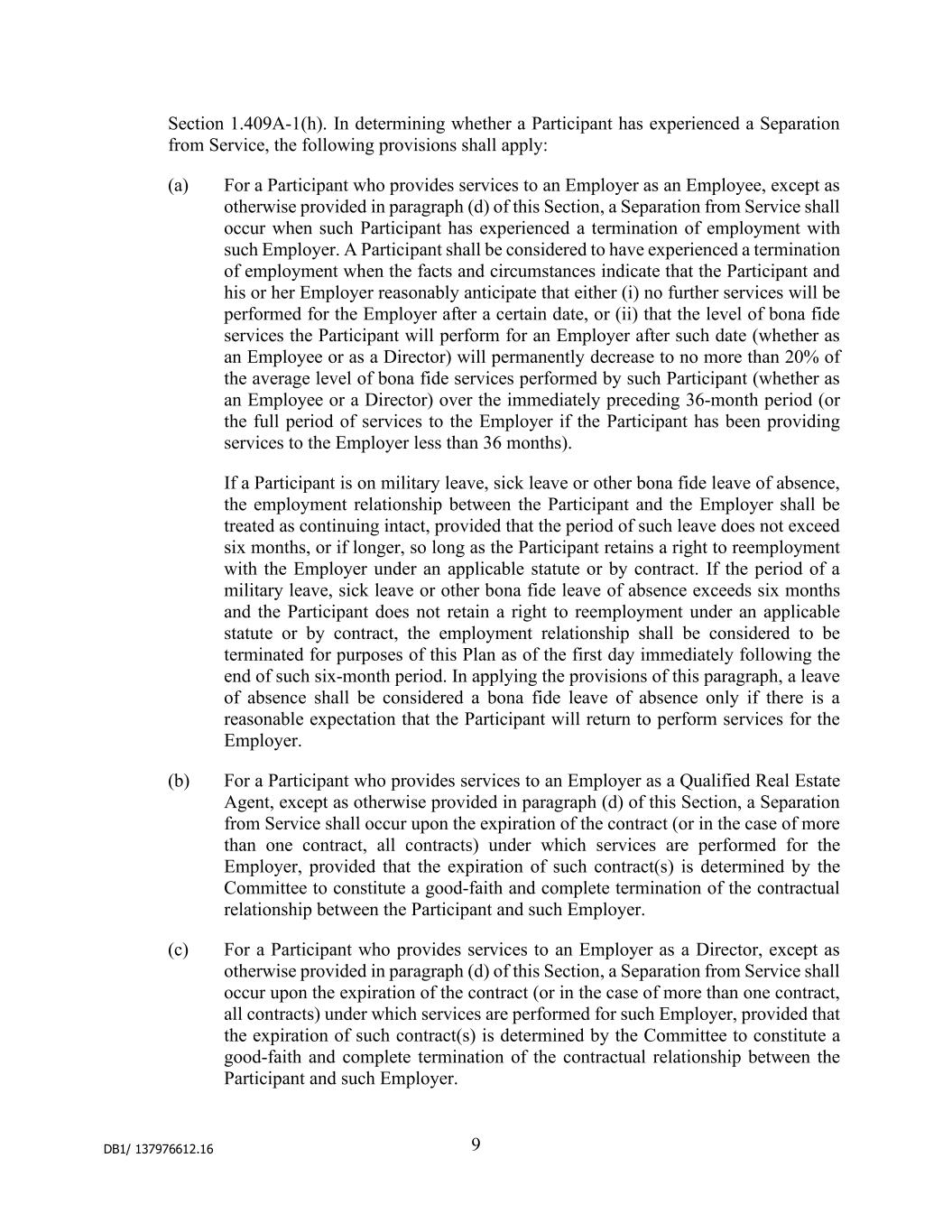 DB1/ 137976612.16 9 Section 1.409A-1(h). In determining whether a Participant has experienced a Separation from Service, the following provisions shall apply: (a) For a Participant who provides services to an Employer as an Employee, except as otherwise provided in paragraph (d) of this Section, a Separation from Service shall occur when such Participant has experienced a termination of employment with such Employer. A Participant shall be considered to have experienced a termination of employment when the facts and circumstances indicate that the Participant and his or her Employer reasonably anticipate that either (i) no further services will be performed for the Employer after a certain date, or (ii) that the level of bona fide services the Participant will perform for an Employer after such date (whether as an Employee or as a Director) will permanently decrease to no more than 20% of the average level of bona fide services performed by such Participant (whether as an Employee or a Director) over the immediately preceding 36-month period (or the full period of services to the Employer if the Participant has been providing services to the Employer less than 36 months). If a Participant is on military leave, sick leave or other bona fide leave of absence, the employment relationship between the Participant and the Employer shall be treated as continuing intact, provided that the period of such leave does not exceed six months, or if longer, so long as the Participant retains a right to reemployment with the Employer under an applicable statute or by contract. If the period of a military leave, sick leave or other bona fide leave of absence exceeds six months and the Participant does not retain a right to reemployment under an applicable statute or by contract, the employment relationship shall be considered to be terminated for purposes of this Plan as of the first day immediately following the end of such six-month period. In applying the provisions of this paragraph, a leave of absence shall be considered a bona fide leave of absence only if there is a reasonable expectation that the Participant will return to perform services for the Employer. (b) For a Participant who provides services to an Employer as a Qualified Real Estate Agent, except as otherwise provided in paragraph (d) of this Section, a Separation from Service shall occur upon the expiration of the contract (or in the case of more than one contract, all contracts) under which services are performed for the Employer, provided that the expiration of such contract(s) is determined by the Committee to constitute a good-faith and complete termination of the contractual relationship between the Participant and such Employer. (c) For a Participant who provides services to an Employer as a Director, except as otherwise provided in paragraph (d) of this Section, a Separation from Service shall occur upon the expiration of the contract (or in the case of more than one contract, all contracts) under which services are performed for such Employer, provided that the expiration of such contract(s) is determined by the Committee to constitute a good-faith and complete termination of the contractual relationship between the Participant and such Employer.