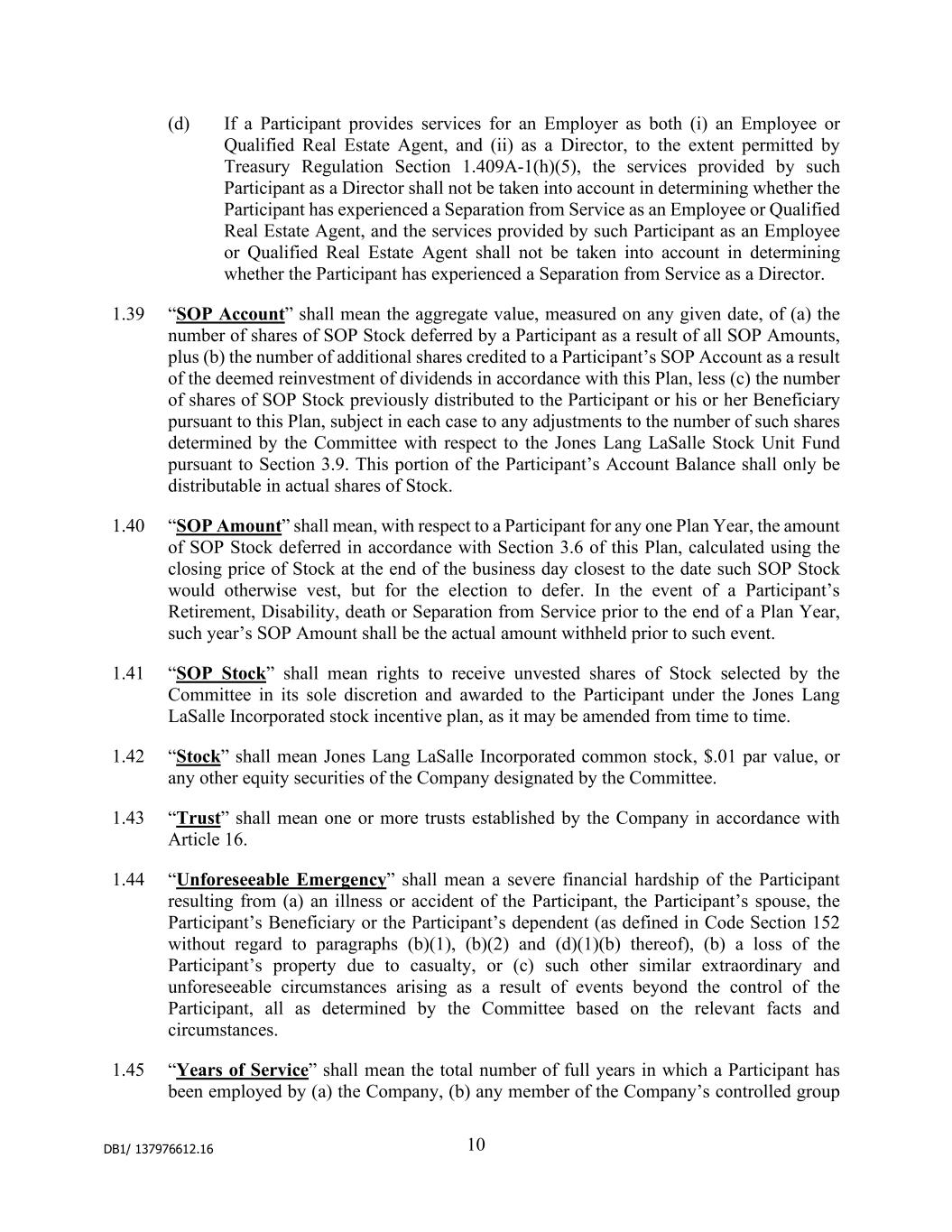 DB1/ 137976612.16 10 (d) If a Participant provides services for an Employer as both (i) an Employee or Qualified Real Estate Agent, and (ii) as a Director, to the extent permitted by Treasury Regulation Section 1.409A-1(h)(5), the services provided by such Participant as a Director shall not be taken into account in determining whether the Participant has experienced a Separation from Service as an Employee or Qualified Real Estate Agent, and the services provided by such Participant as an Employee or Qualified Real Estate Agent shall not be taken into account in determining whether the Participant has experienced a Separation from Service as a Director. 1.39 “SOP Account” shall mean the aggregate value, measured on any given date, of (a) the number of shares of SOP Stock deferred by a Participant as a result of all SOP Amounts, plus (b) the number of additional shares credited to a Participant’s SOP Account as a result of the deemed reinvestment of dividends in accordance with this Plan, less (c) the number of shares of SOP Stock previously distributed to the Participant or his or her Beneficiary pursuant to this Plan, subject in each case to any adjustments to the number of such shares determined by the Committee with respect to the Jones Lang LaSalle Stock Unit Fund pursuant to Section 3.9. This portion of the Participant’s Account Balance shall only be distributable in actual shares of Stock. 1.40 “SOP Amount” shall mean, with respect to a Participant for any one Plan Year, the amount of SOP Stock deferred in accordance with Section 3.6 of this Plan, calculated using the closing price of Stock at the end of the business day closest to the date such SOP Stock would otherwise vest, but for the election to defer. In the event of a Participant’s Retirement, Disability, death or Separation from Service prior to the end of a Plan Year, such year’s SOP Amount shall be the actual amount withheld prior to such event. 1.41 “SOP Stock” shall mean rights to receive unvested shares of Stock selected by the Committee in its sole discretion and awarded to the Participant under the Jones Lang LaSalle Incorporated stock incentive plan, as it may be amended from time to time. 1.42 “Stock” shall mean Jones Lang LaSalle Incorporated common stock, $.01 par value, or any other equity securities of the Company designated by the Committee. 1.43 “Trust” shall mean one or more trusts established by the Company in accordance with Article 16. 1.44 “Unforeseeable Emergency” shall mean a severe financial hardship of the Participant resulting from (a) an illness or accident of the Participant, the Participant’s spouse, the Participant’s Beneficiary or the Participant’s dependent (as defined in Code Section 152 without regard to paragraphs (b)(1), (b)(2) and (d)(1)(b) thereof), (b) a loss of the Participant’s property due to casualty, or (c) such other similar extraordinary and unforeseeable circumstances arising as a result of events beyond the control of the Participant, all as determined by the Committee based on the relevant facts and circumstances. 1.45 “Years of Service” shall mean the total number of full years in which a Participant has been employed by (a) the Company, (b) any member of the Company’s controlled group