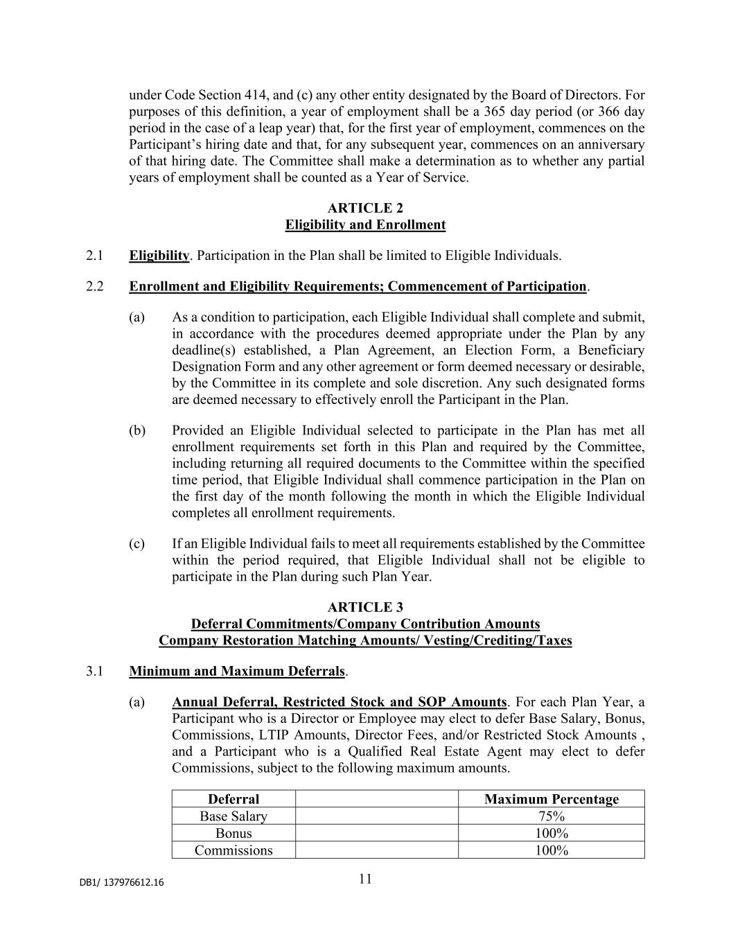 DB1/ 137976612.16 11 under Code Section 414, and (c) any other entity designated by the Board of Directors. For purposes of this definition, a year of employment shall be a 365 day period (or 366 day period in the case of a leap year) that, for the first year of employment, commences on the Participant’s hiring date and that, for any subsequent year, commences on an anniversary of that hiring date. The Committee shall make a determination as to whether any partial years of employment shall be counted as a Year of Service. ARTICLE 2 Eligibility and Enrollment 2.1 Eligibility. Participation in the Plan shall be limited to Eligible Individuals. 2.2 Enrollment and Eligibility Requirements; Commencement of Participation. (a) As a condition to participation, each Eligible Individual shall complete and submit, in accordance with the procedures deemed appropriate under the Plan by any deadline(s) established, a Plan Agreement, an Election Form, a Beneficiary Designation Form and any other agreement or form deemed necessary or desirable, by the Committee in its complete and sole discretion. Any such designated forms are deemed necessary to effectively enroll the Participant in the Plan. (b) Provided an Eligible Individual selected to participate in the Plan has met all enrollment requirements set forth in this Plan and required by the Committee, including returning all required documents to the Committee within the specified time period, that Eligible Individual shall commence participation in the Plan on the first day of the month following the month in which the Eligible Individual completes all enrollment requirements. (c) If an Eligible Individual fails to meet all requirements established by the Committee within the period required, that Eligible Individual shall not be eligible to participate in the Plan during such Plan Year. ARTICLE 3 Deferral Commitments/Company Contribution Amounts Company Restoration Matching Amounts/ Vesting/Crediting/Taxes 3.1 Minimum and Maximum Deferrals. (a) Annual Deferral, Restricted Stock and SOP Amounts. For each Plan Year, a Participant who is a Director or Employee may elect to defer Base Salary, Bonus, Commissions, LTIP Amounts, Director Fees, and/or Restricted Stock Amounts , and a Participant who is a Qualified Real Estate Agent may elect to defer Commissions, subject to the following maximum amounts. Deferral Maximum Percentage Base Salary 75% Bonus 100% Commissions 100%
