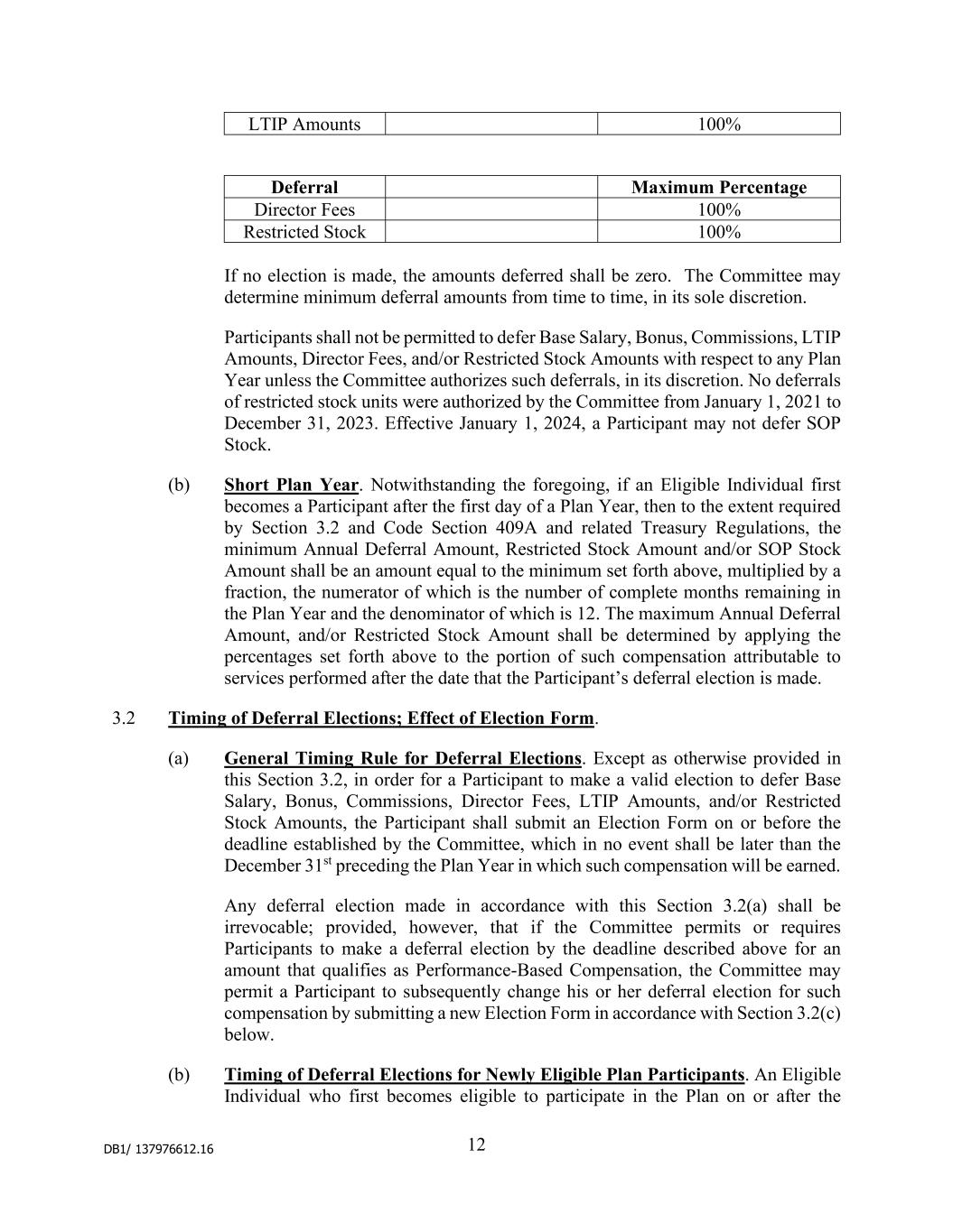 DB1/ 137976612.16 12 LTIP Amounts 100% Deferral Maximum Percentage Director Fees 100% Restricted Stock 100% If no election is made, the amounts deferred shall be zero. The Committee may determine minimum deferral amounts from time to time, in its sole discretion. Participants shall not be permitted to defer Base Salary, Bonus, Commissions, LTIP Amounts, Director Fees, and/or Restricted Stock Amounts with respect to any Plan Year unless the Committee authorizes such deferrals, in its discretion. No deferrals of restricted stock units were authorized by the Committee from January 1, 2021 to December 31, 2023. Effective January 1, 2024, a Participant may not defer SOP Stock. (b) Short Plan Year. Notwithstanding the foregoing, if an Eligible Individual first becomes a Participant after the first day of a Plan Year, then to the extent required by Section 3.2 and Code Section 409A and related Treasury Regulations, the minimum Annual Deferral Amount, Restricted Stock Amount and/or SOP Stock Amount shall be an amount equal to the minimum set forth above, multiplied by a fraction, the numerator of which is the number of complete months remaining in the Plan Year and the denominator of which is 12. The maximum Annual Deferral Amount, and/or Restricted Stock Amount shall be determined by applying the percentages set forth above to the portion of such compensation attributable to services performed after the date that the Participant’s deferral election is made. 3.2 Timing of Deferral Elections; Effect of Election Form. (a) General Timing Rule for Deferral Elections. Except as otherwise provided in this Section 3.2, in order for a Participant to make a valid election to defer Base Salary, Bonus, Commissions, Director Fees, LTIP Amounts, and/or Restricted Stock Amounts, the Participant shall submit an Election Form on or before the deadline established by the Committee, which in no event shall be later than the December 31st preceding the Plan Year in which such compensation will be earned. Any deferral election made in accordance with this Section 3.2(a) shall be irrevocable; provided, however, that if the Committee permits or requires Participants to make a deferral election by the deadline described above for an amount that qualifies as Performance-Based Compensation, the Committee may permit a Participant to subsequently change his or her deferral election for such compensation by submitting a new Election Form in accordance with Section 3.2(c) below. (b) Timing of Deferral Elections for Newly Eligible Plan Participants. An Eligible Individual who first becomes eligible to participate in the Plan on or after the